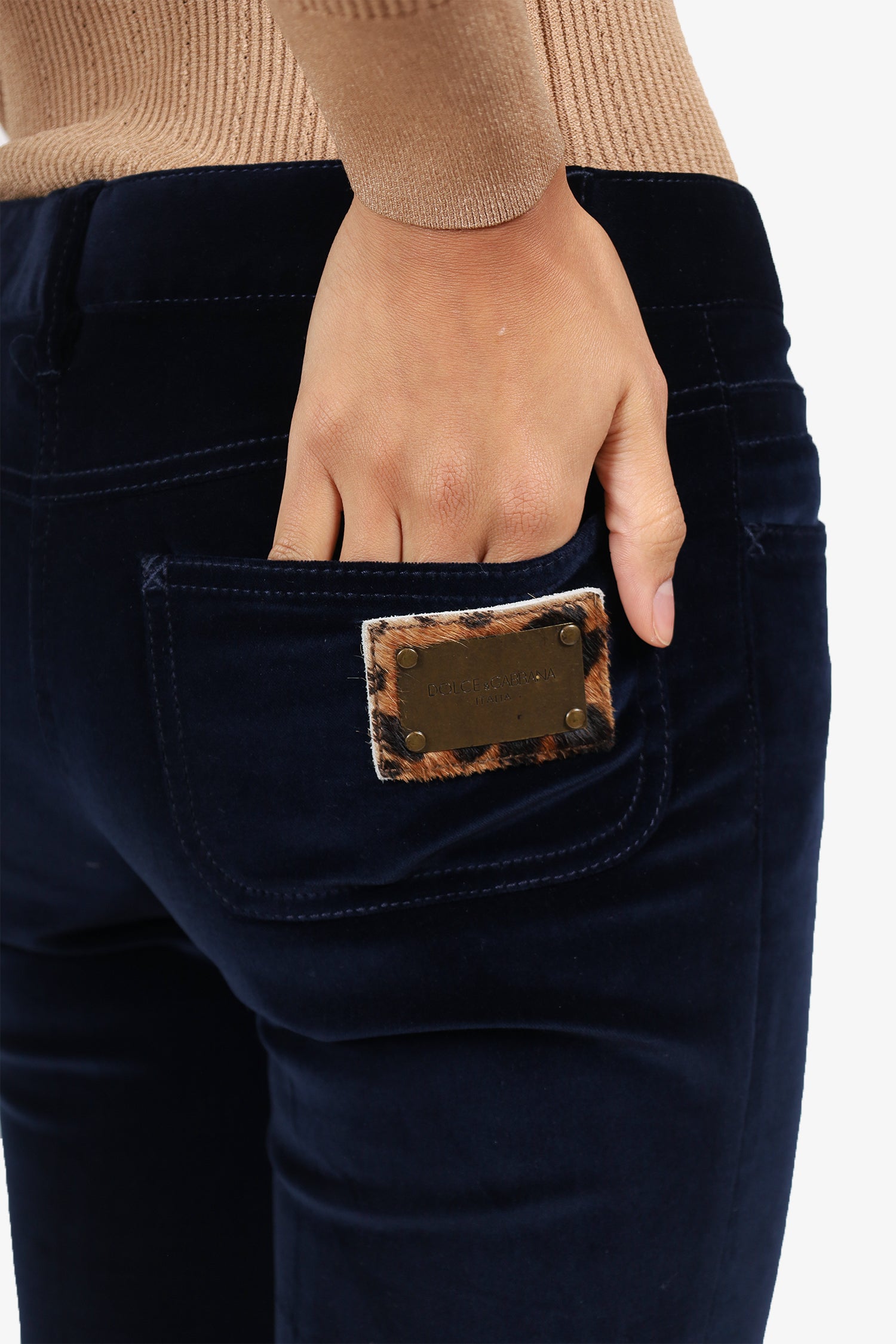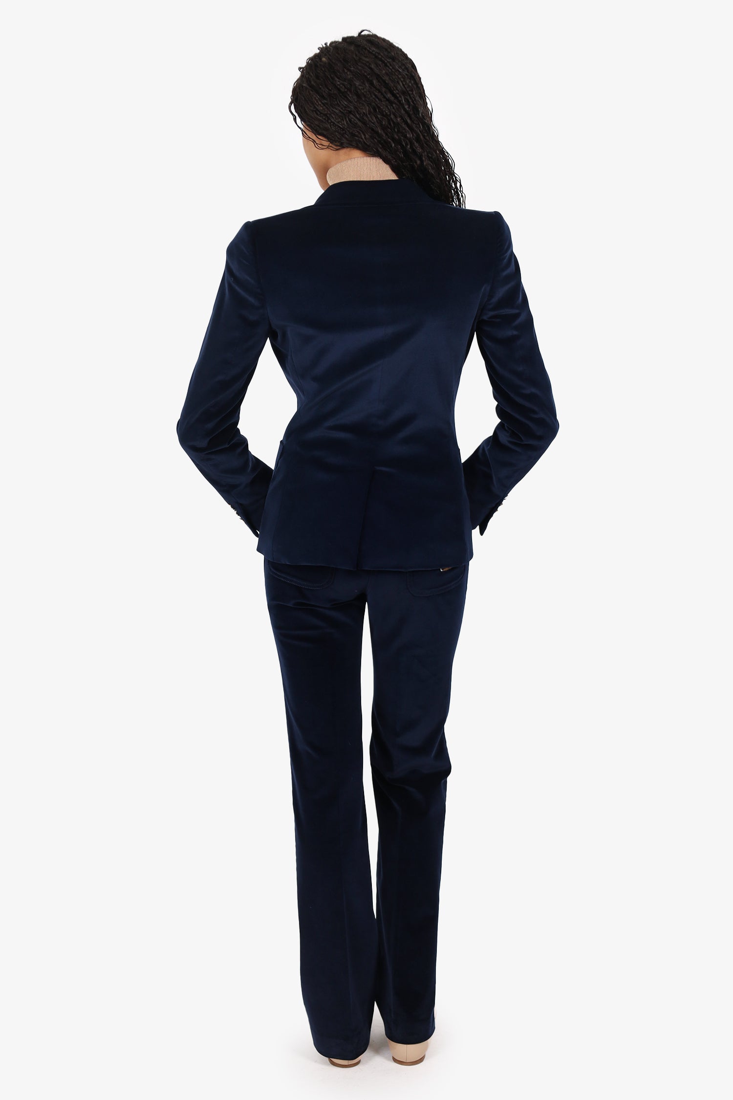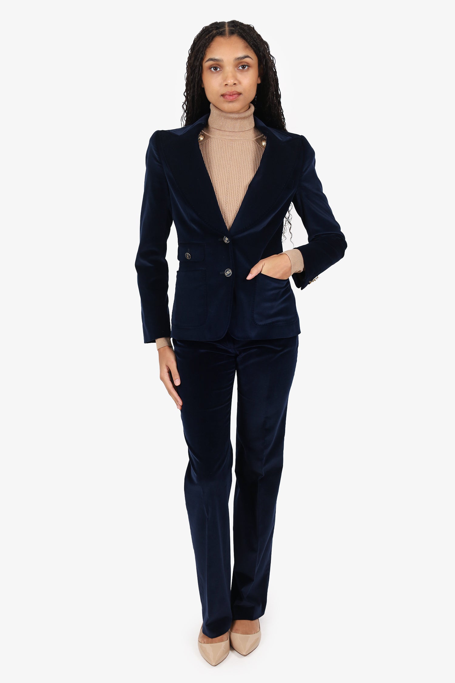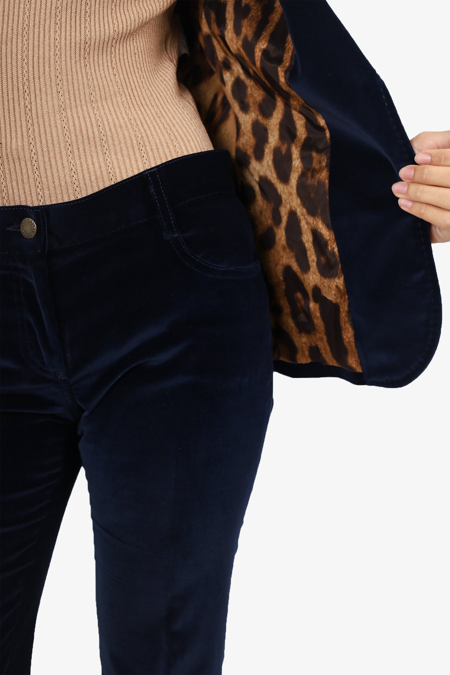 Refresh availabilityDolce & Gabbana Navy Velvet Tuxedo Two-piece Suit Set. Blazer: Pull-on. Peak lapel. Front button-up closure. Sleeve cuffs with button-up closure. 2 exterior slip pockets. Single rear vent. Padded shoulders. Lined interior; Pants: Slip-on. Front zip with button closure. Waistband belt loops. 5 exterior pockets; 2 front side slip and 1 mini compartment, 2 rear slip. Gold-tone hardware. Tonal stitching.