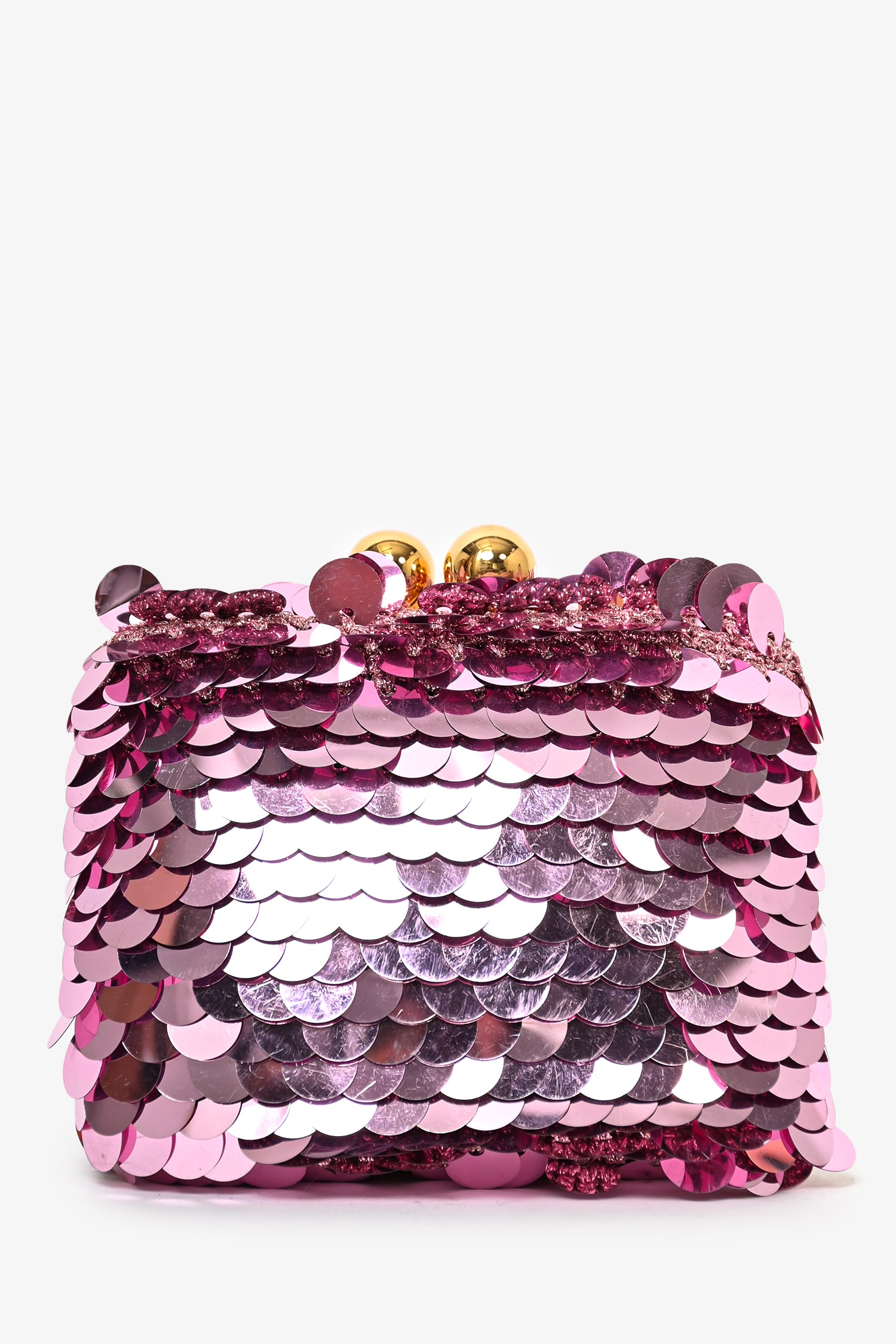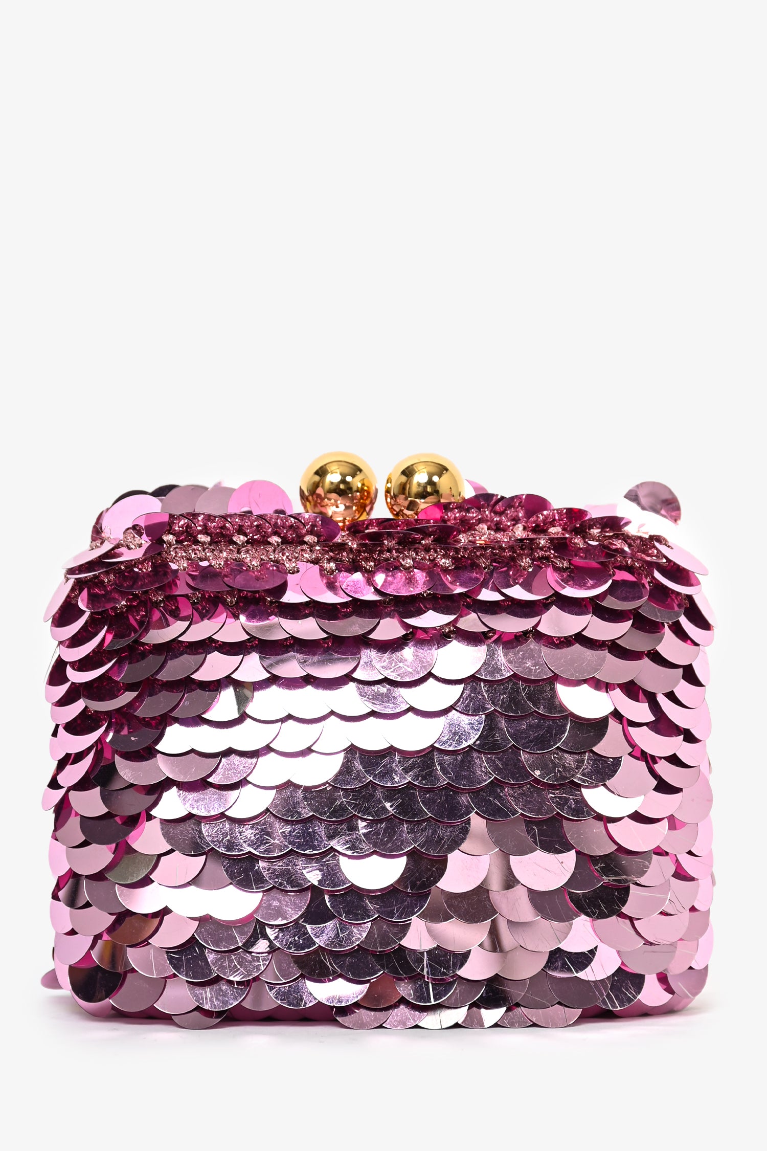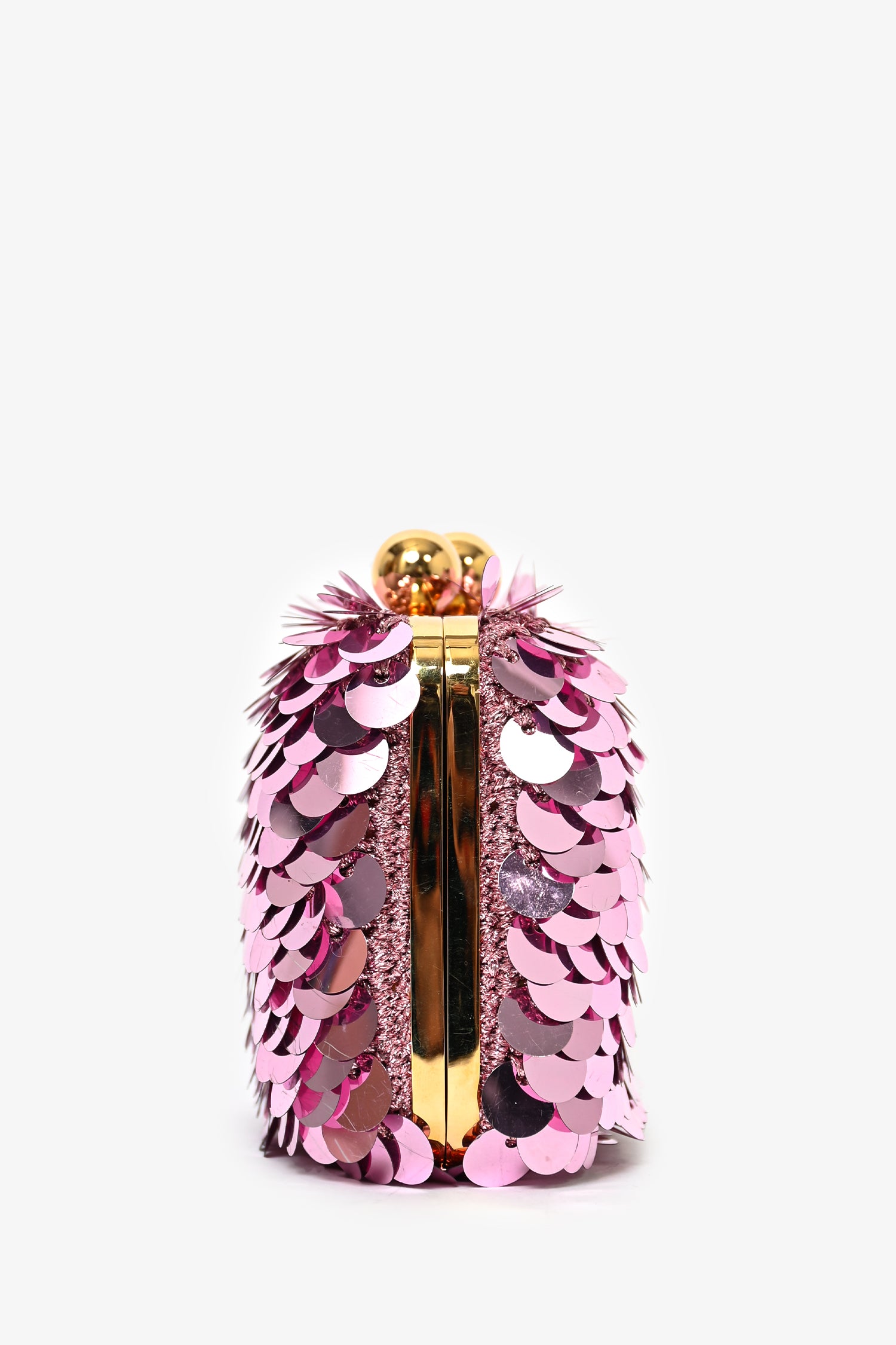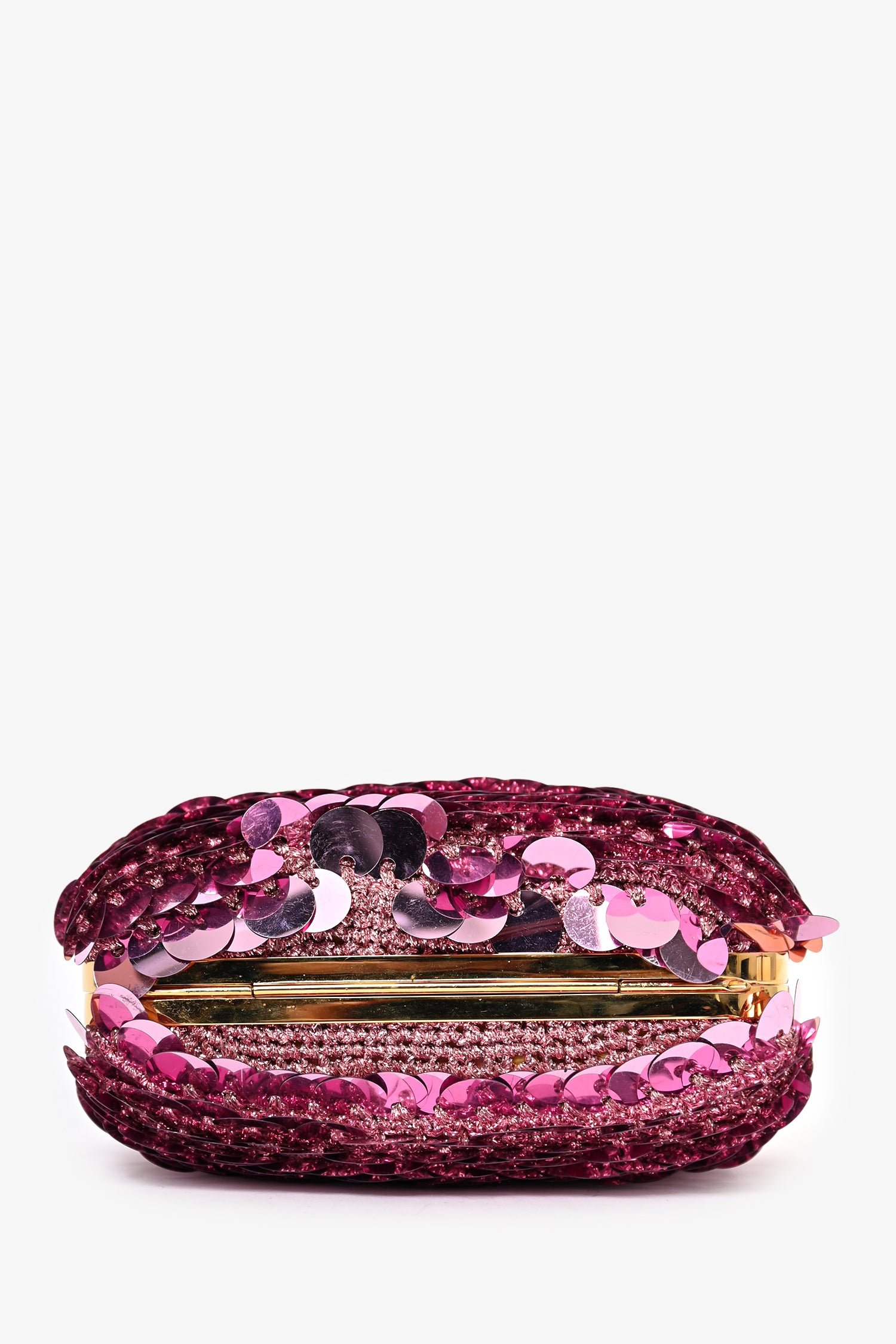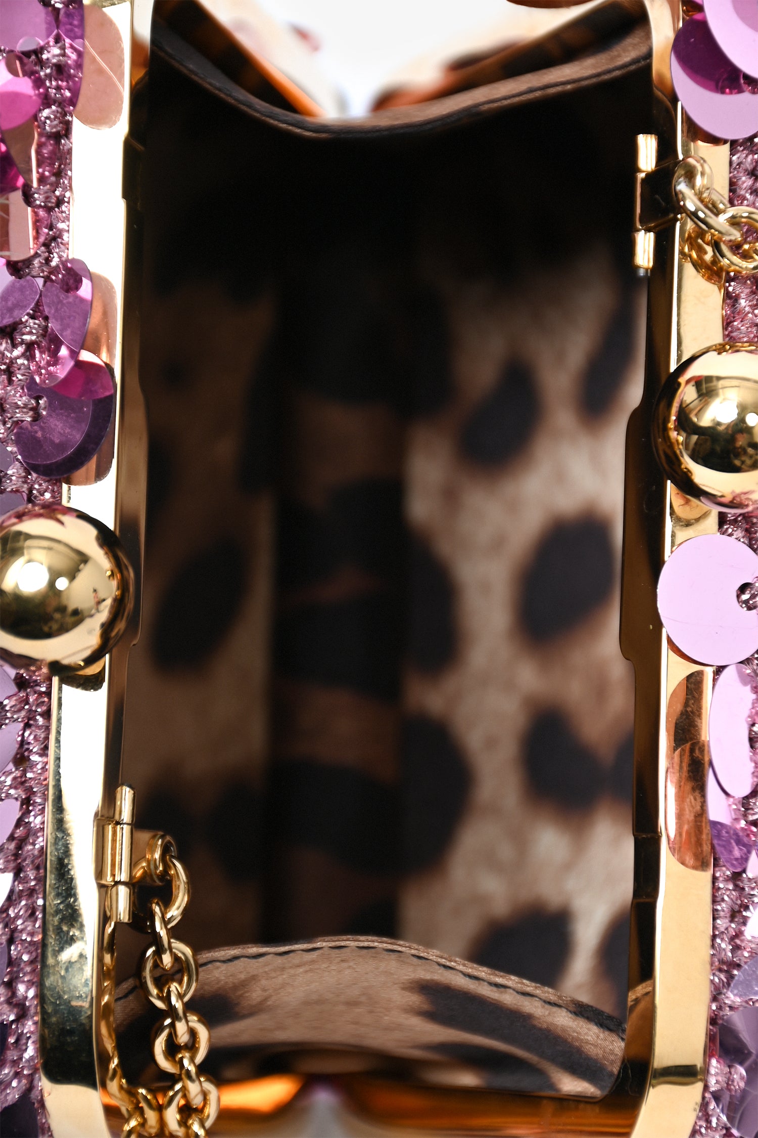 Refresh availabilityDolce & Gabbana Pink Sequin Clutch with Gold Chain. Top kiss lock with magnetic closure. Open compartment. Gold-tone hardware. Animal print lining. Tonal stitching.