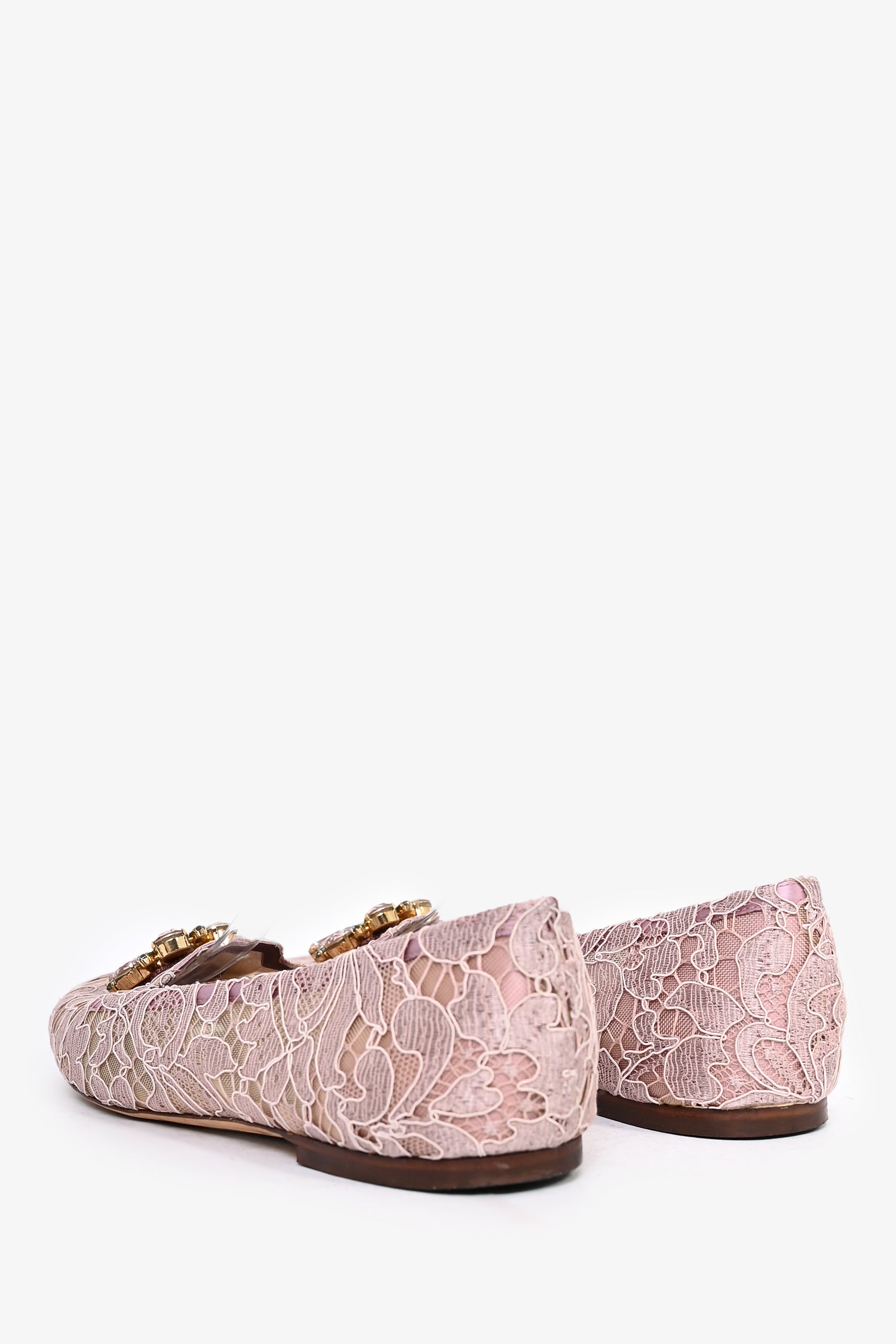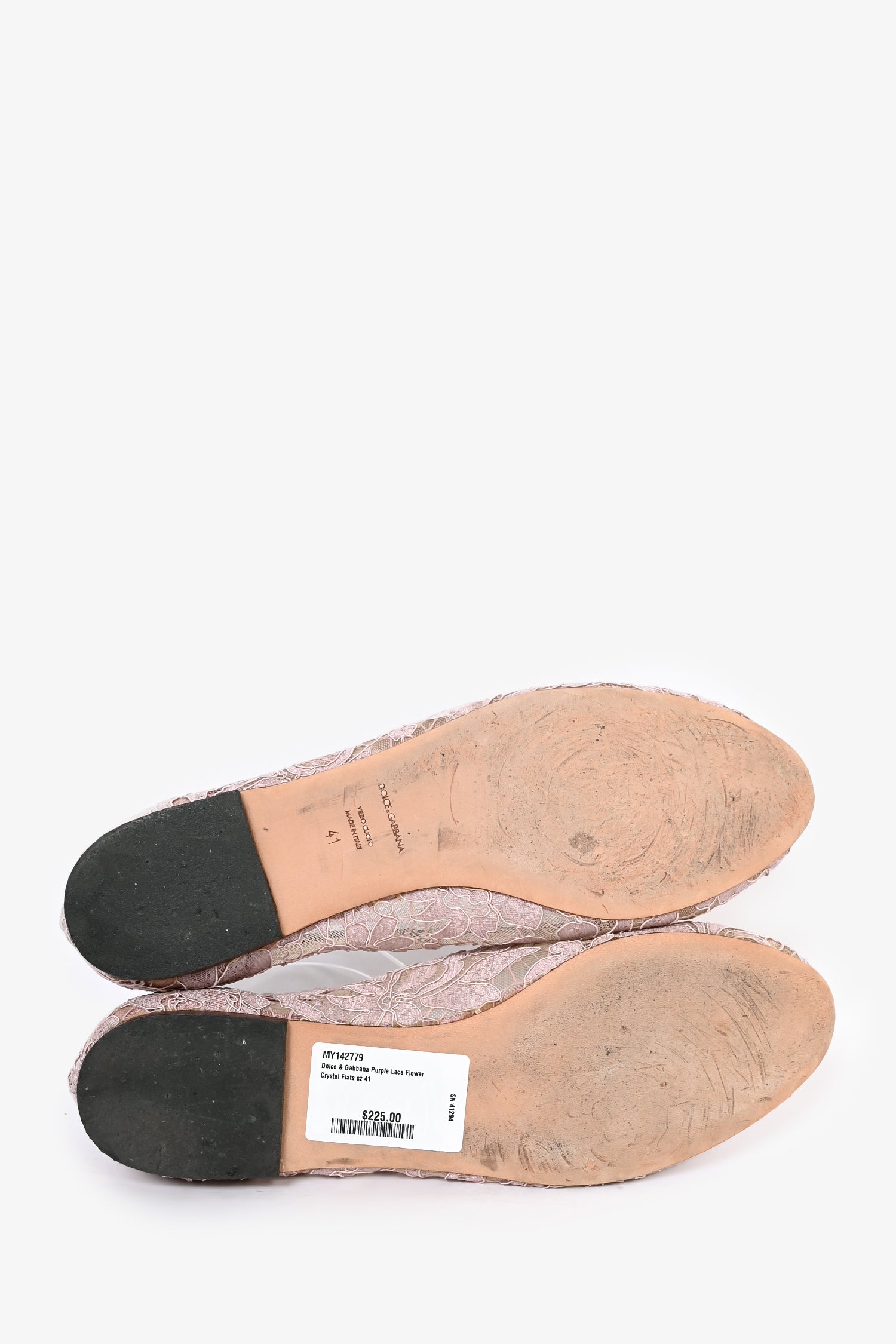 Refresh availabilityDolce & Gabbana Purple Lace Flower Crystal Flats. Slip-on. Almond toe. Tonal stitching.