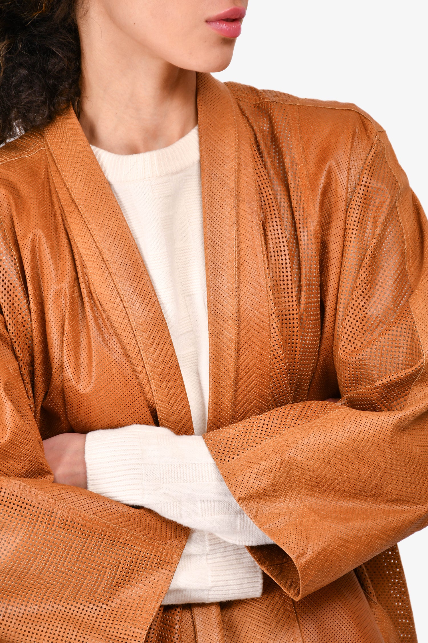 Refresh availabilityDonna Karen Brown Lambskin Leather Laser Cut Detail Draped Front Coat. Two slip-on pockets on the sides. Leather with intricate laser-cut detailing. Draped front design. Long sleeves with a sleek finish. Unlined. Tonal stitching.
