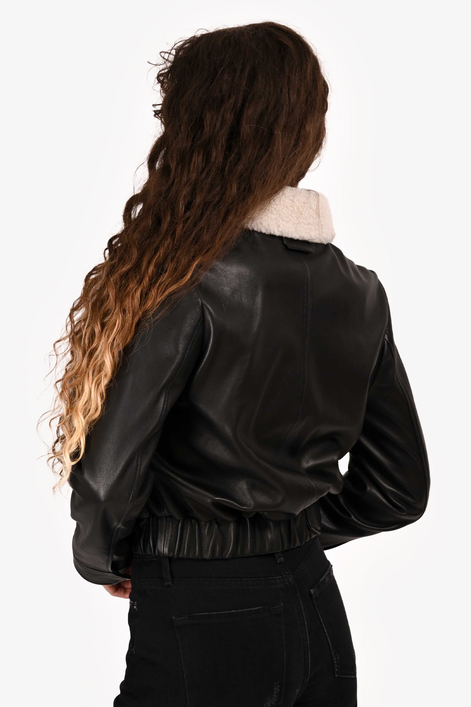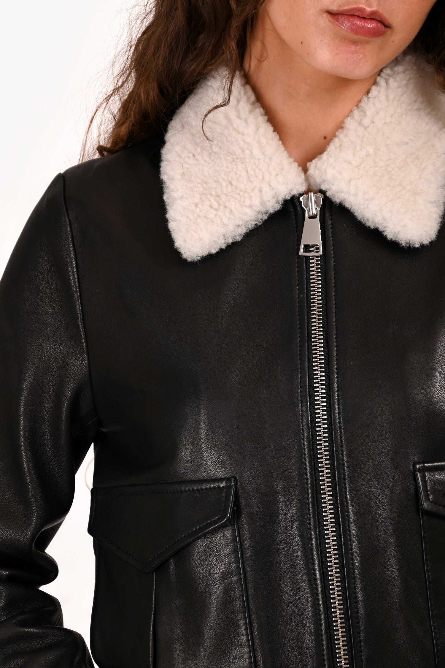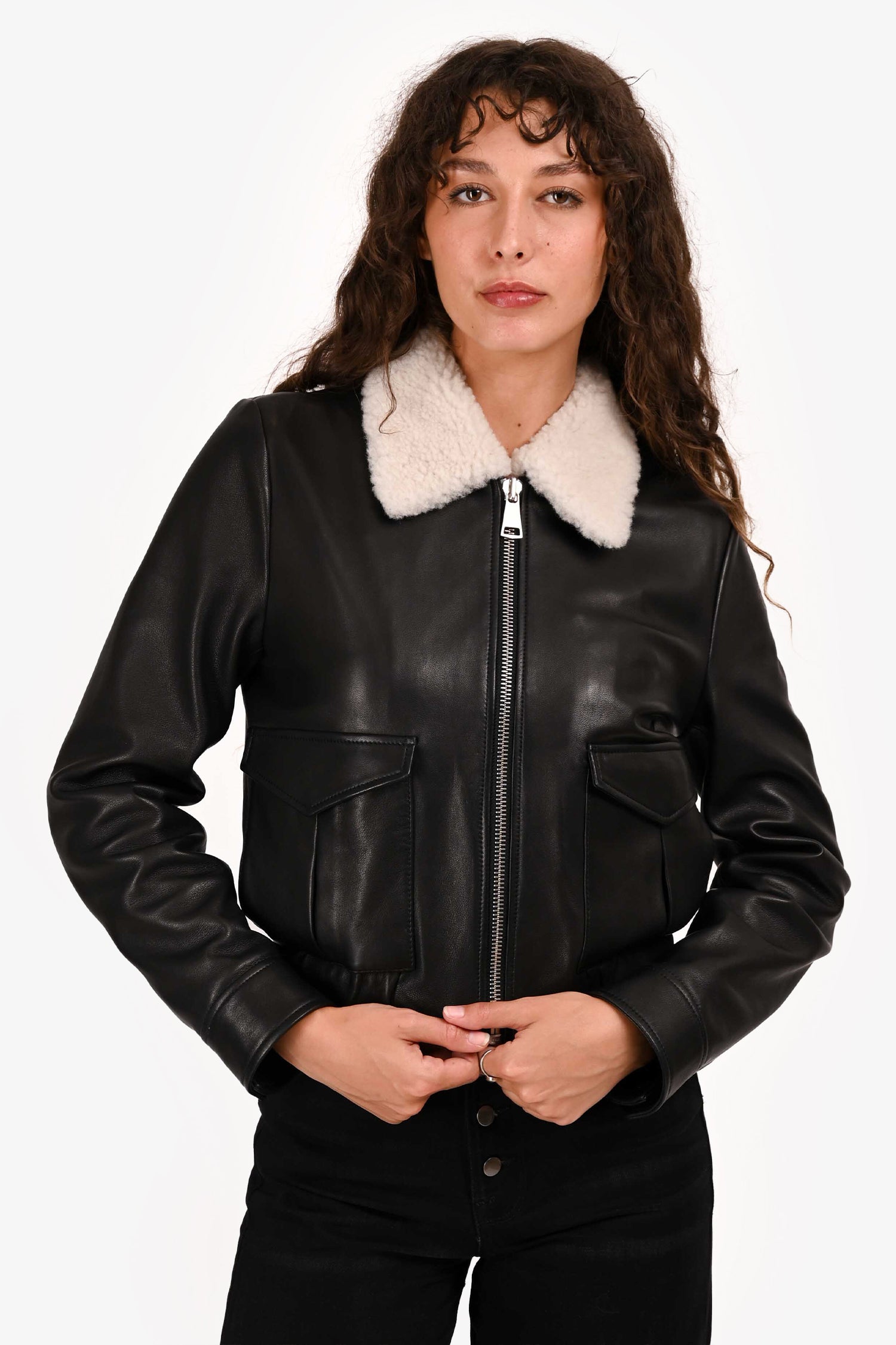Refresh availabilityDorothee Schumacher Black Leather Shearling Collar Aviator Jacket. Front zip closure. Front flap pockets. Long sleeves with snap button closure at cuffs. Fully lined. Tonal stitching.