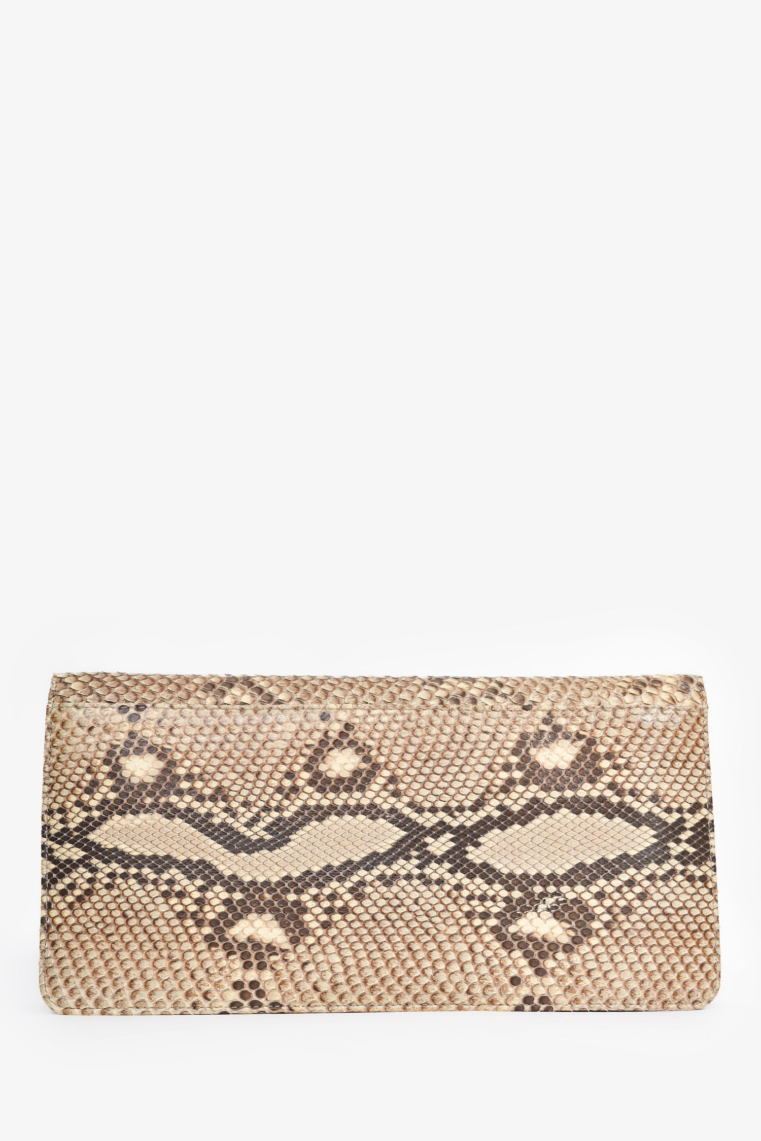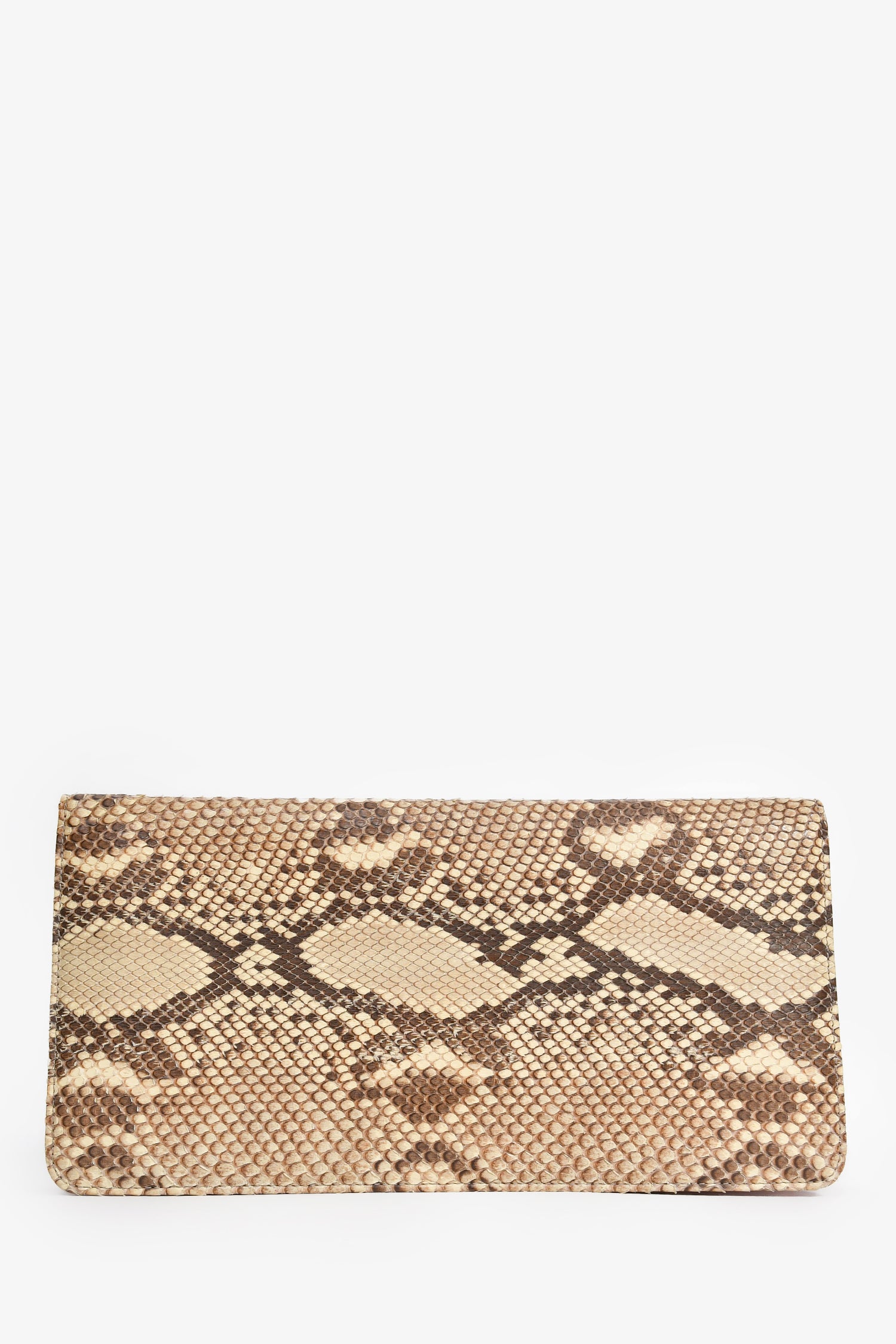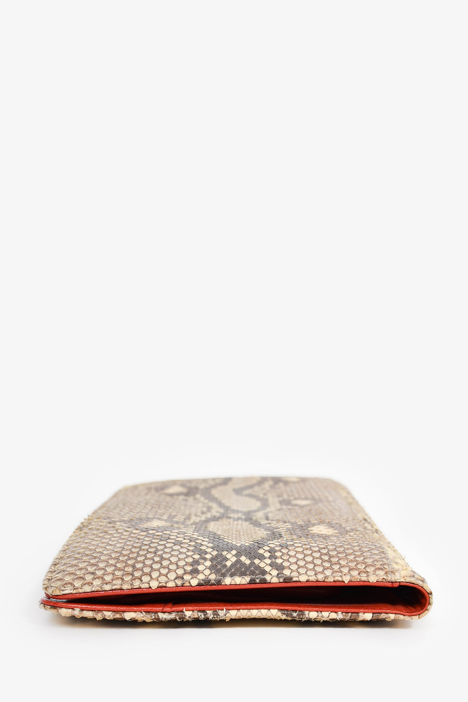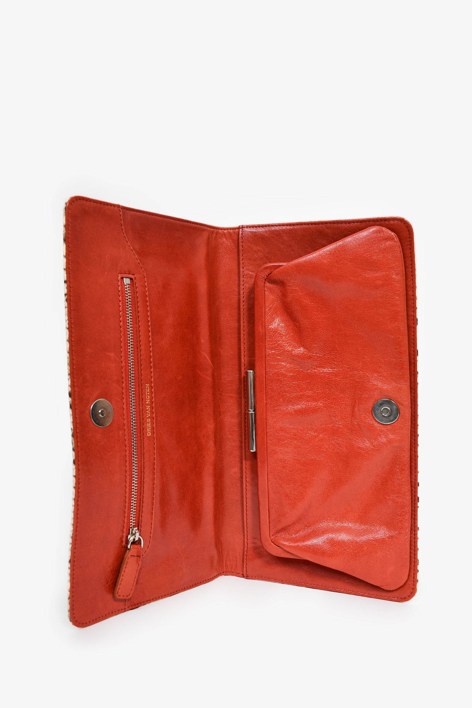 Refresh availabilityDries Van Noten Beige Snake Skin Clutch. Front fold-over flap with snap-button closure. Burnt orange leather interior. Single interior wall slip pocket. Black textile interior lining. Front interior pocket kiss-lock closure. Silver-tone hardware.