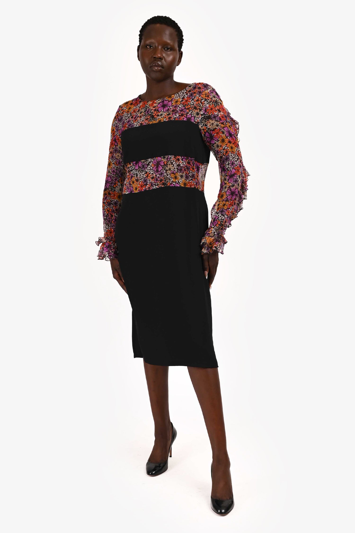 Dries Van Noten Black/Floral Sheer Silk Long Sleeve Striped Dress Size 42