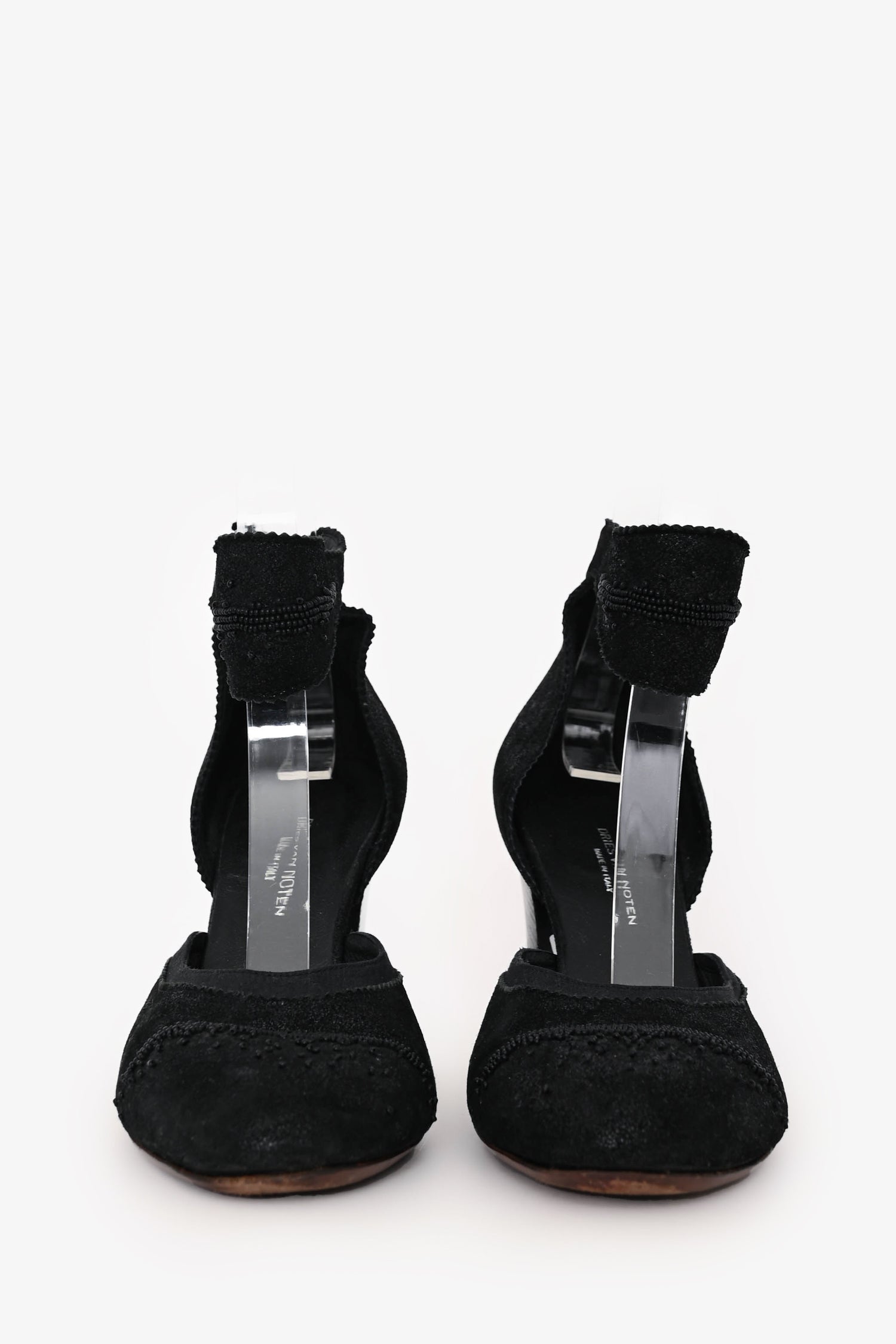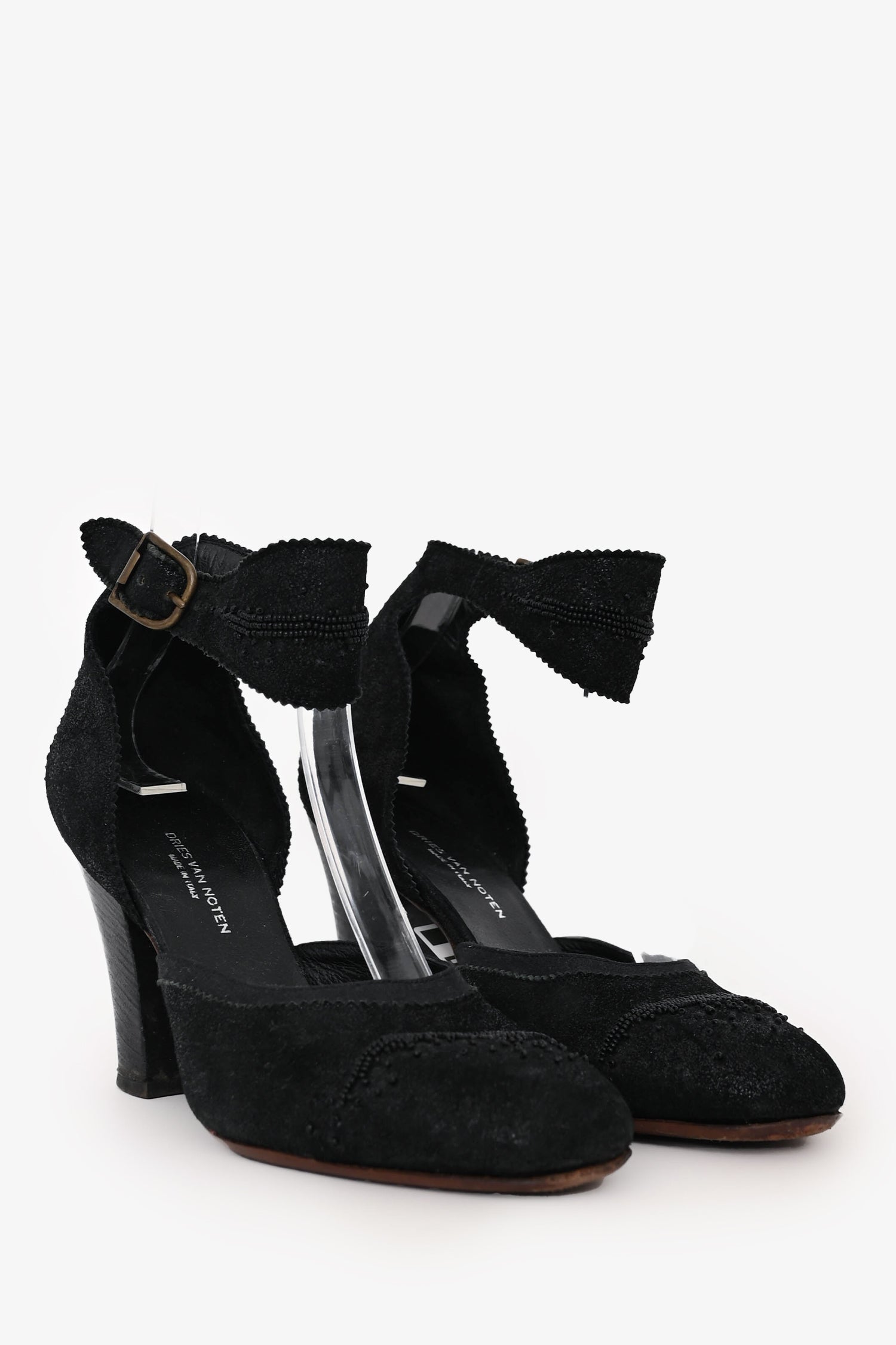 Refresh availabilityDries Van Noten Black Suede Beaded Ankle Strap Pumps. Slip-on. Round toe. Ankle strap with buckle. Leather insole. Gunmetal hardware. Tonal stitching.