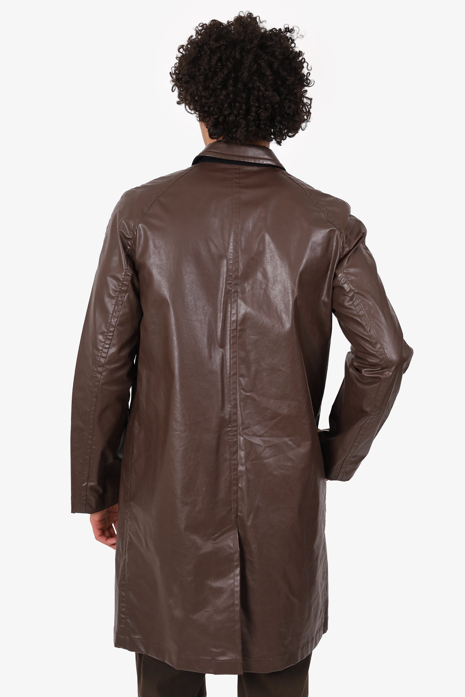 Refresh availabilityDries Van Noten Brown Faux Leather Button Down Trench. Pull-on. Collared neckline. Front snap button-up closure. 2 exterior side slip pockets. Lined interior with single slip pocket. Gunmetal-tone hardware. Tonal stitching.