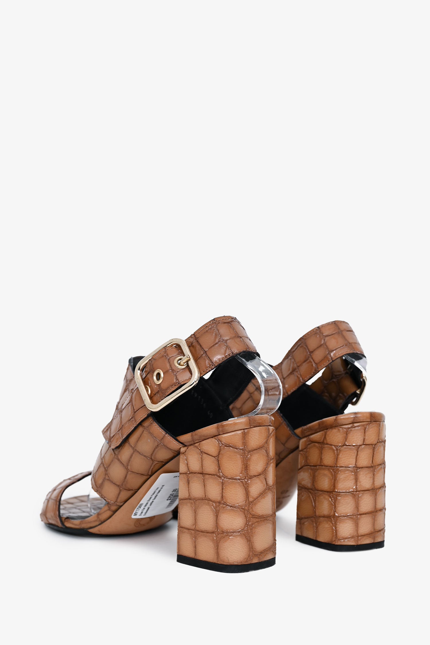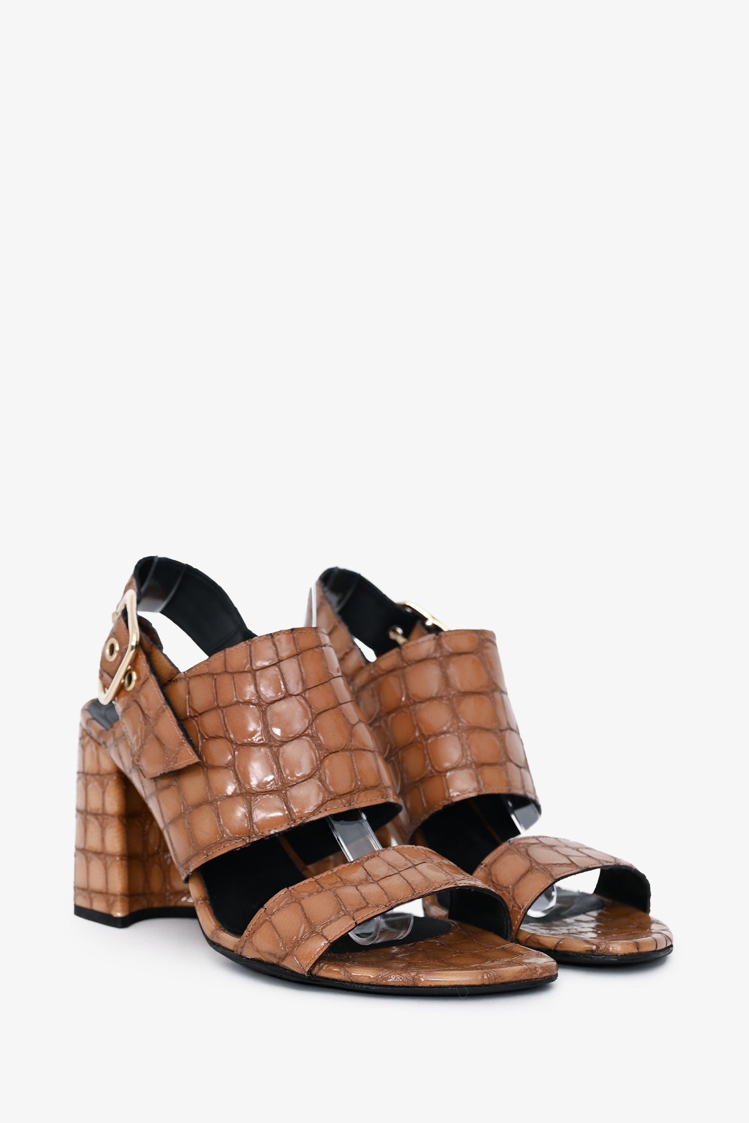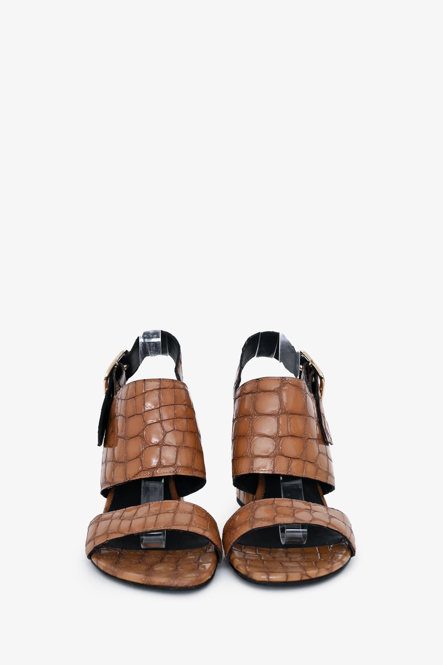 Refresh availabilityDries Van Noten Brown Patent Croc Embossed Leather Sandal Heels. Adjustable buckle strap at ankle. Gold-tone hardware. Tonal stitching.