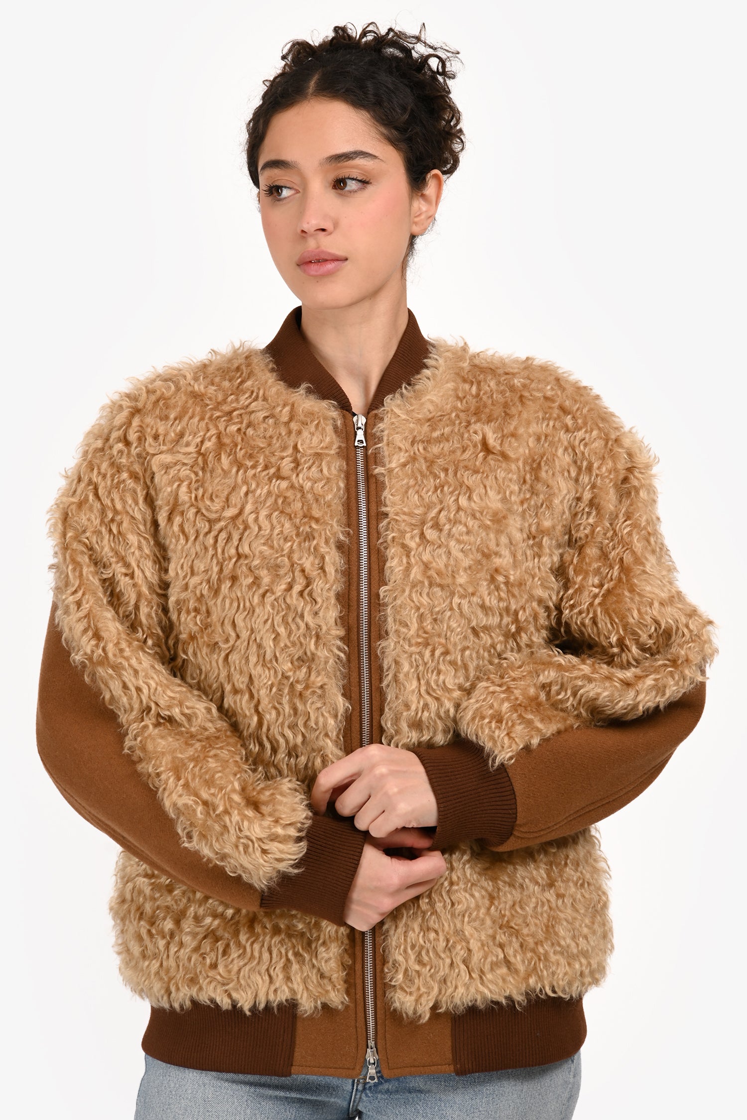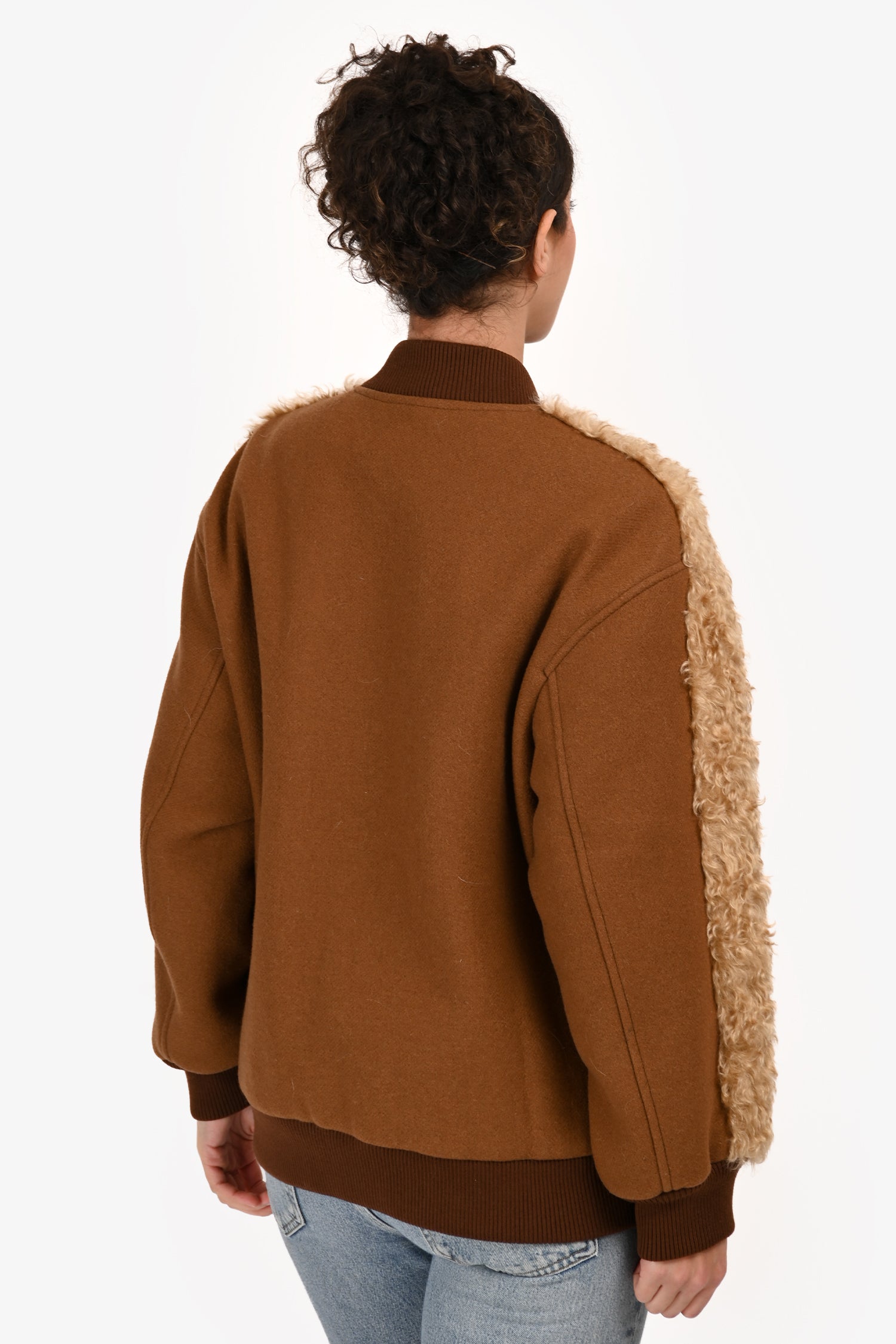 Refresh availabilityDries Van Noten Faux Shearling Wool Blend Bomber Jacket. Slip-on. Round neckline. 2-way front zip closure. 2 side slip pockets. Ribbed neckline, cuffs and hem. Lined interior. Silver-tone hardware. Tonal stitching.