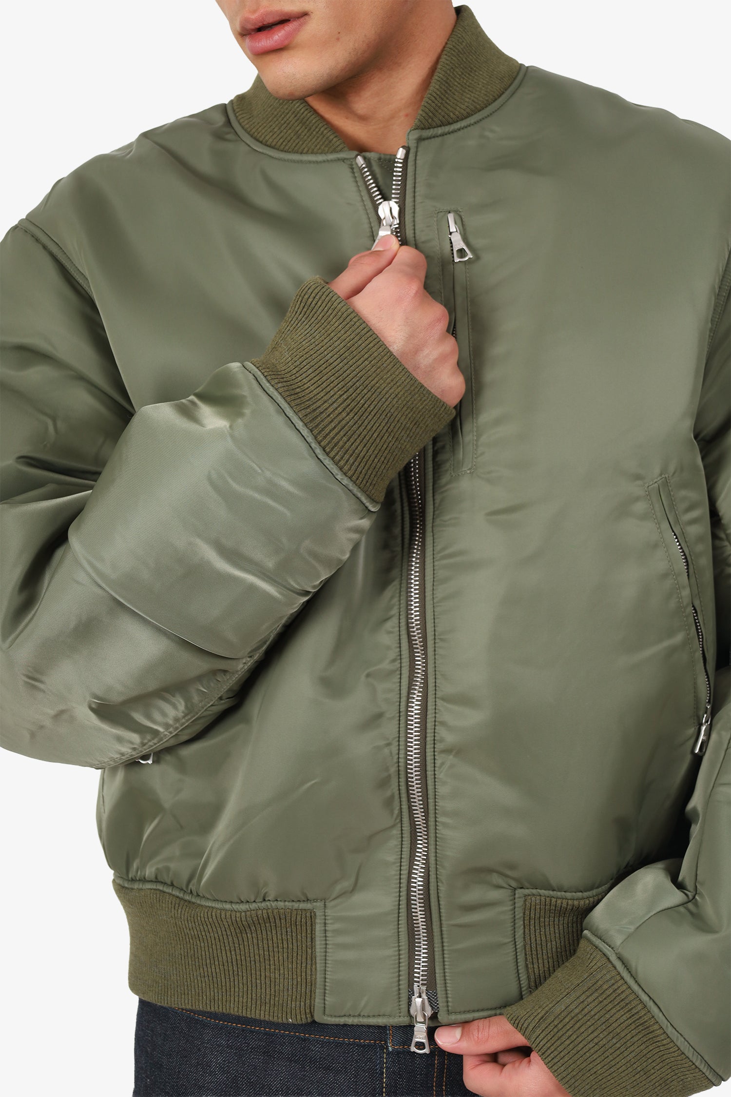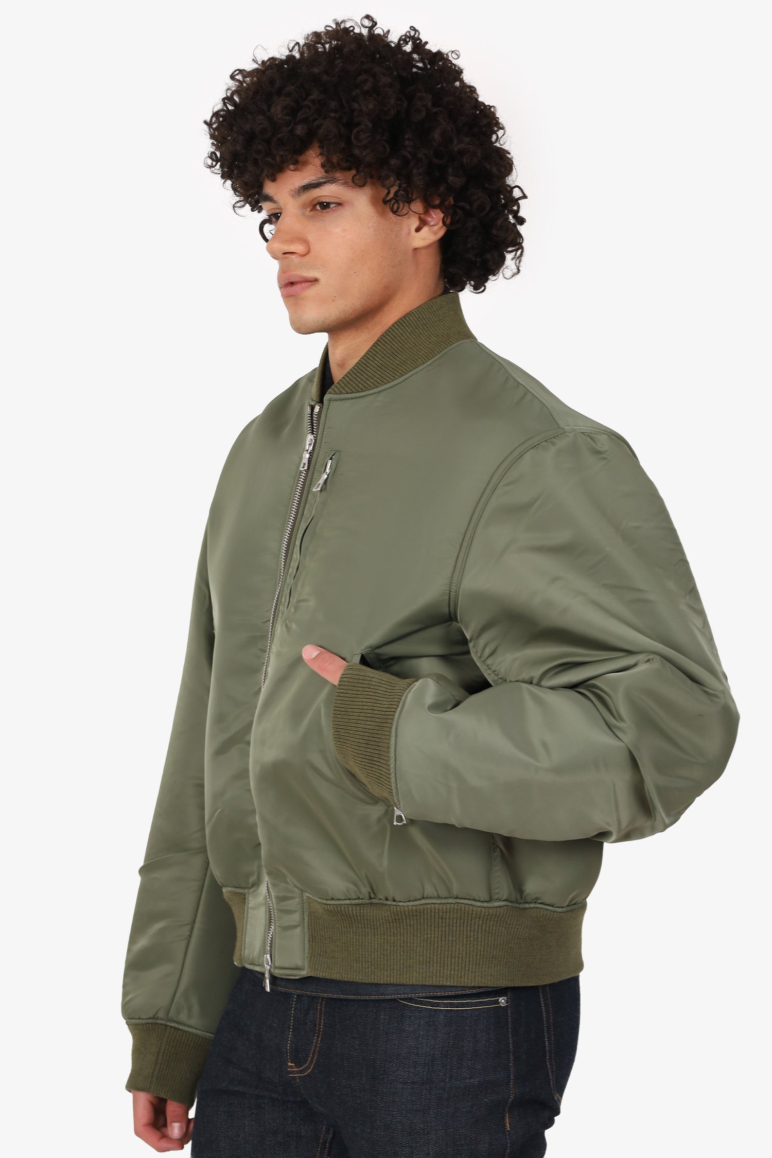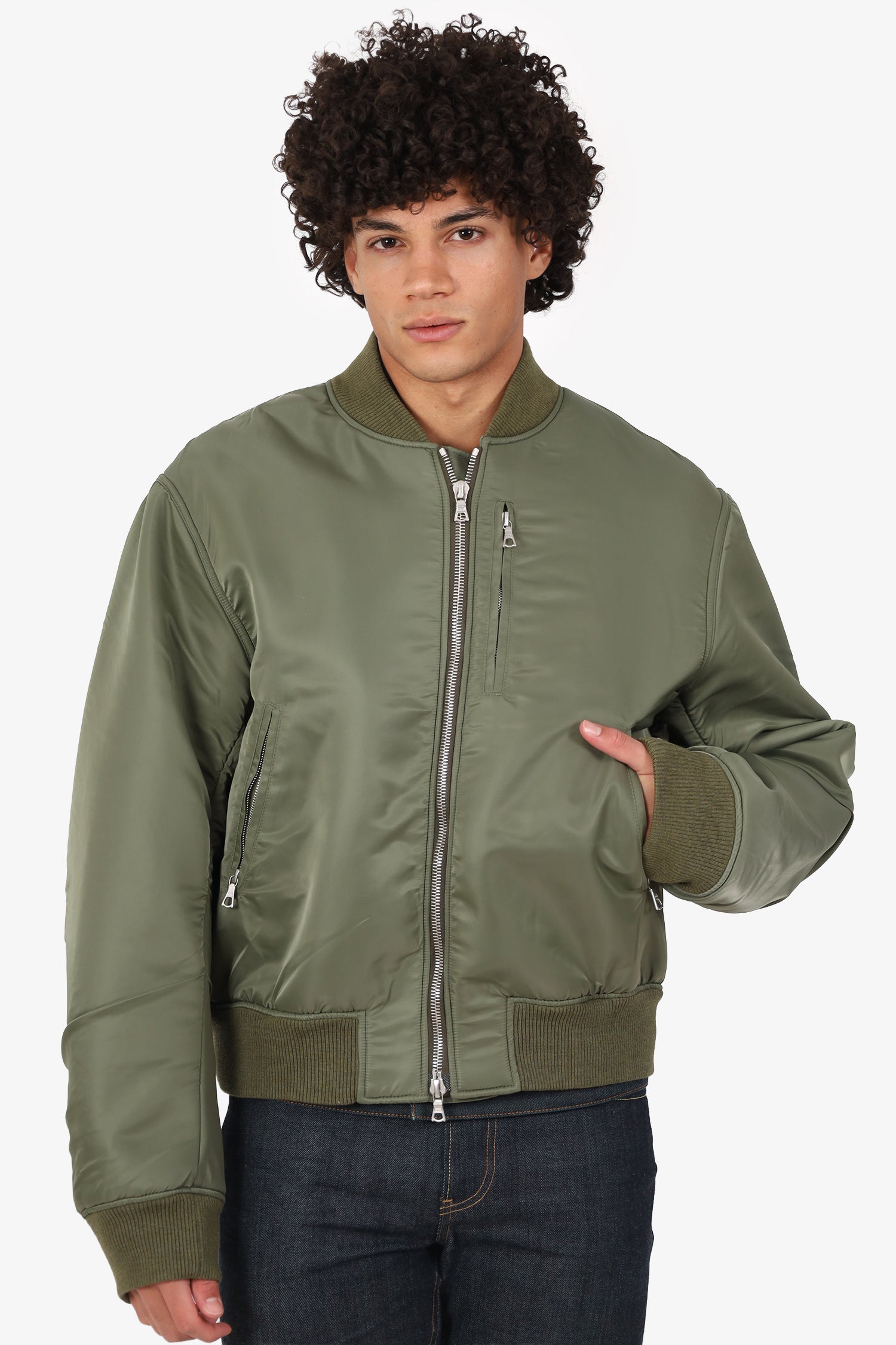 Refresh availabilityDries Van Noten Green Nylon Bomber Jacket. Pull-on. Round neckline. 2-way front zip-up closure. 3 exterior zip pockets; 1 chest, and 2 front. Lined interior with single button-up pocket. Silver-tone hardware. Tonal stitching.