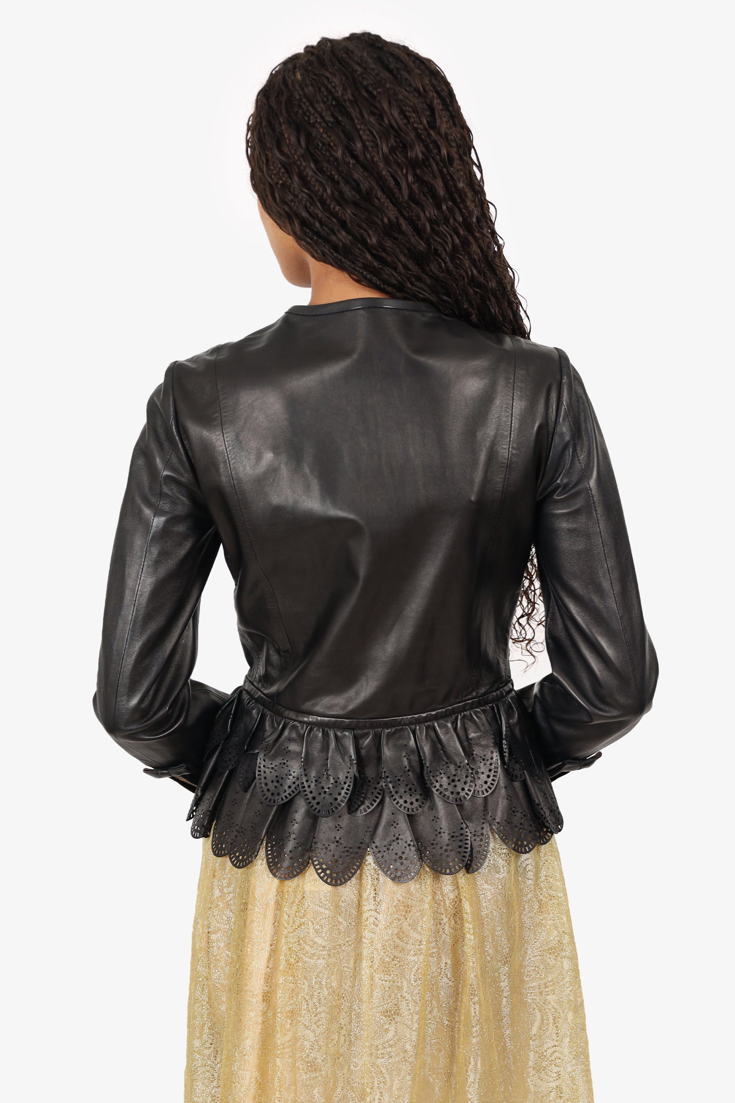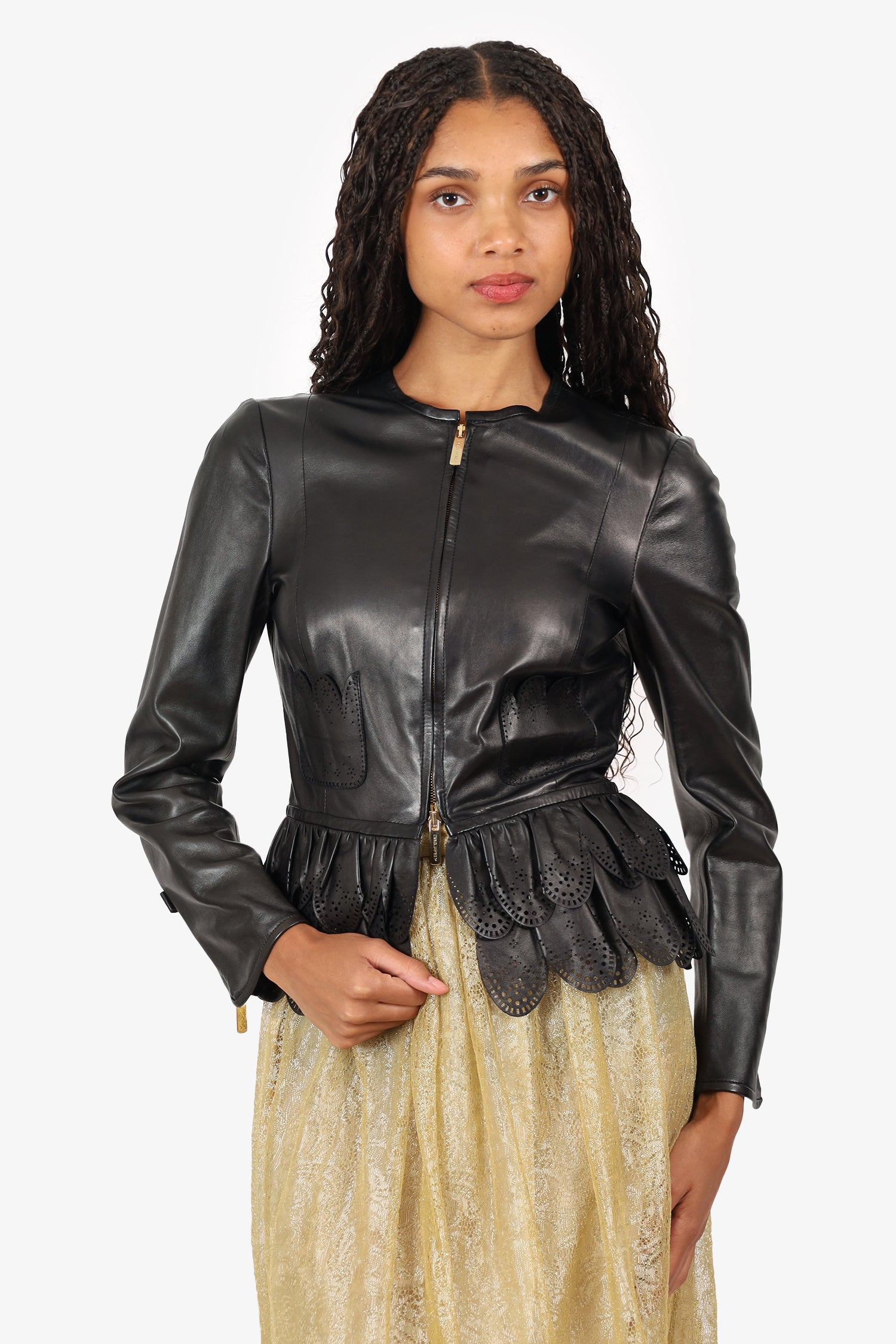 Refresh availabilityDsquared² Black Leather Ruffled Laser Cut Jacket. Pull-on. Round neckline. Front zip up closure. Sleeve cuffs with zip closure. 2 front exterior slip pockets. Gold-tone hardware. Tonal stitching.