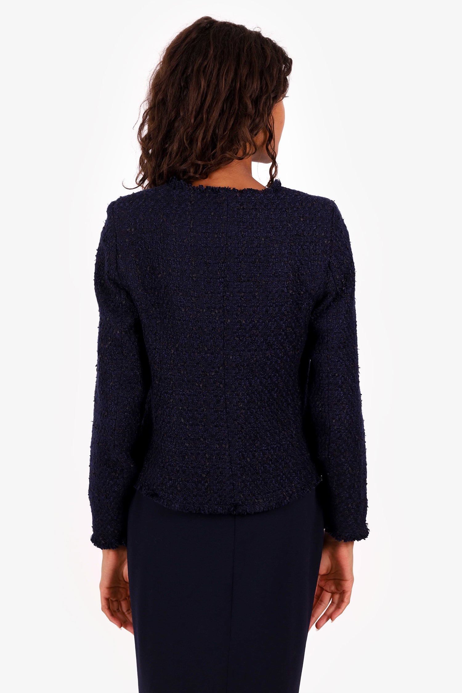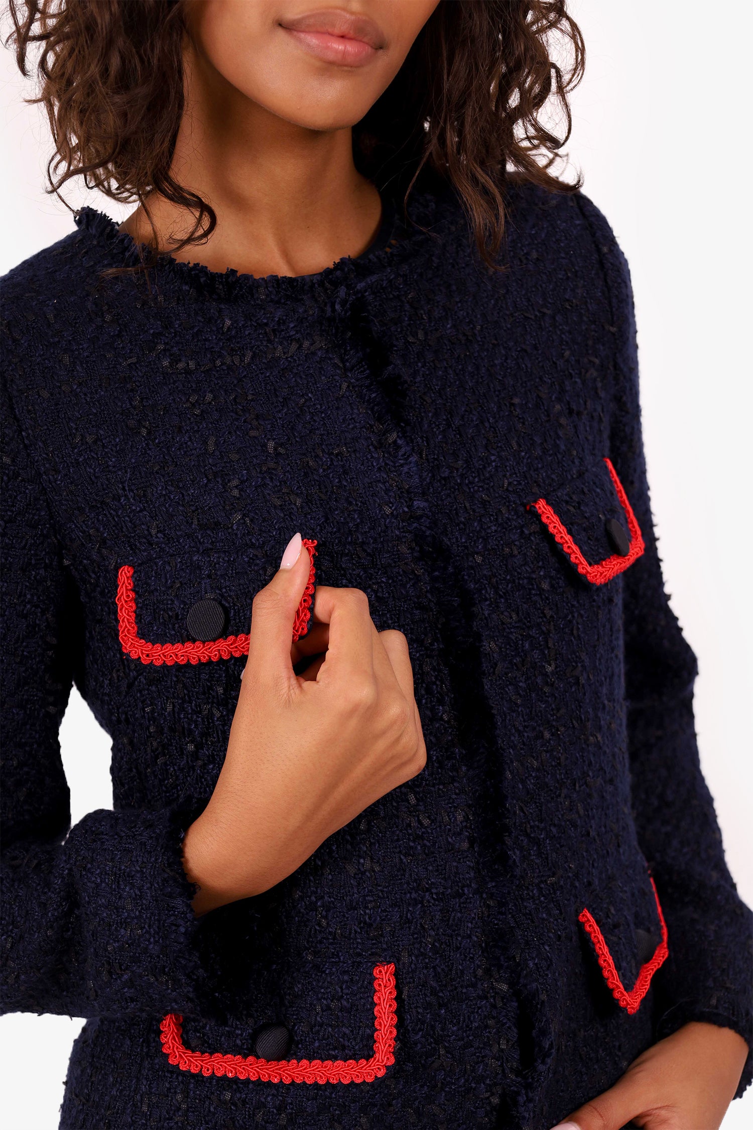 Refresh availabilityEdward Achour Navy Blue Tweed Jacket With Red Trim. Pull-on. Round-neckline. Front hook closure. 4 front exterior flap pockets. Lined interior. Shoulder pads. Tonal stitching.