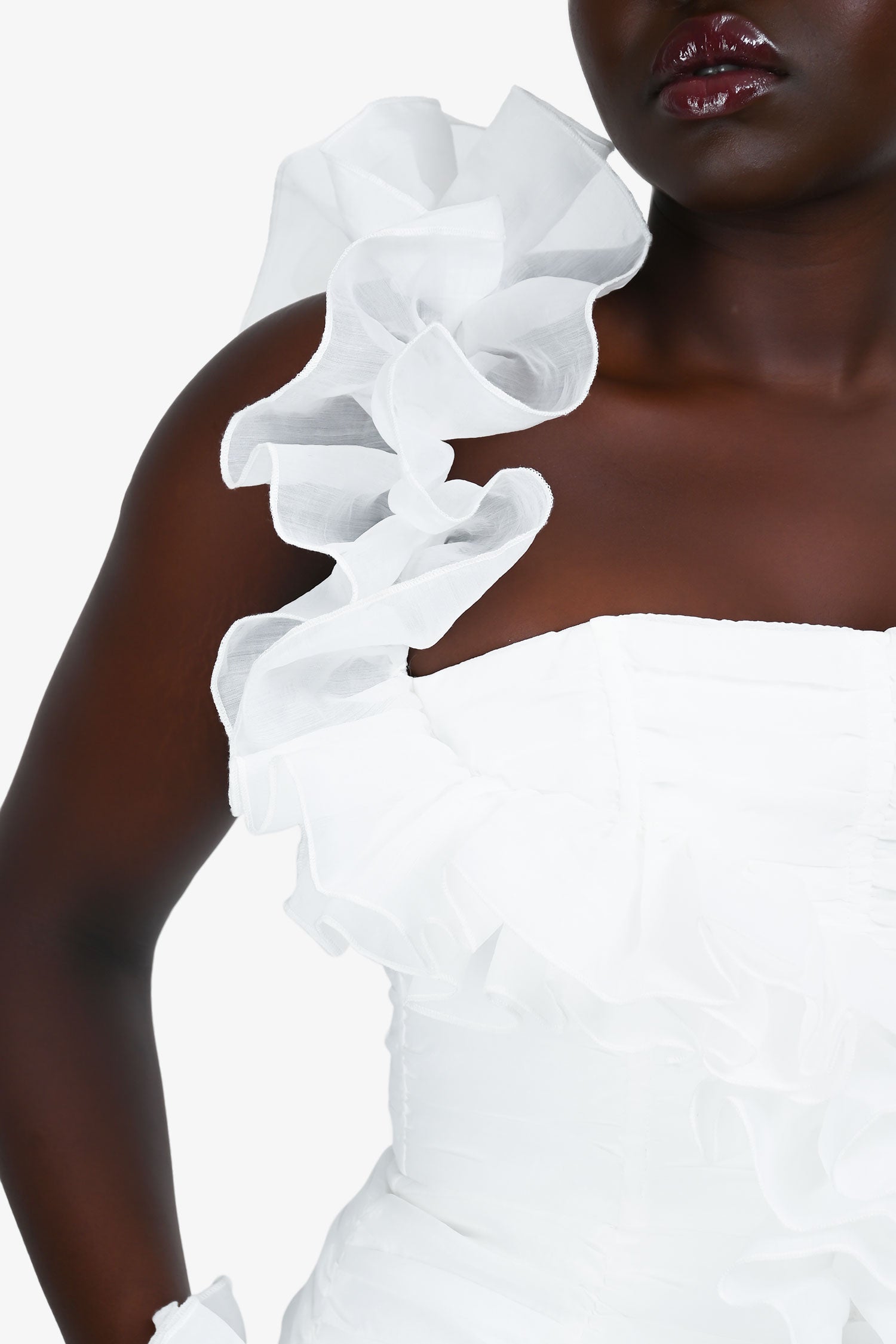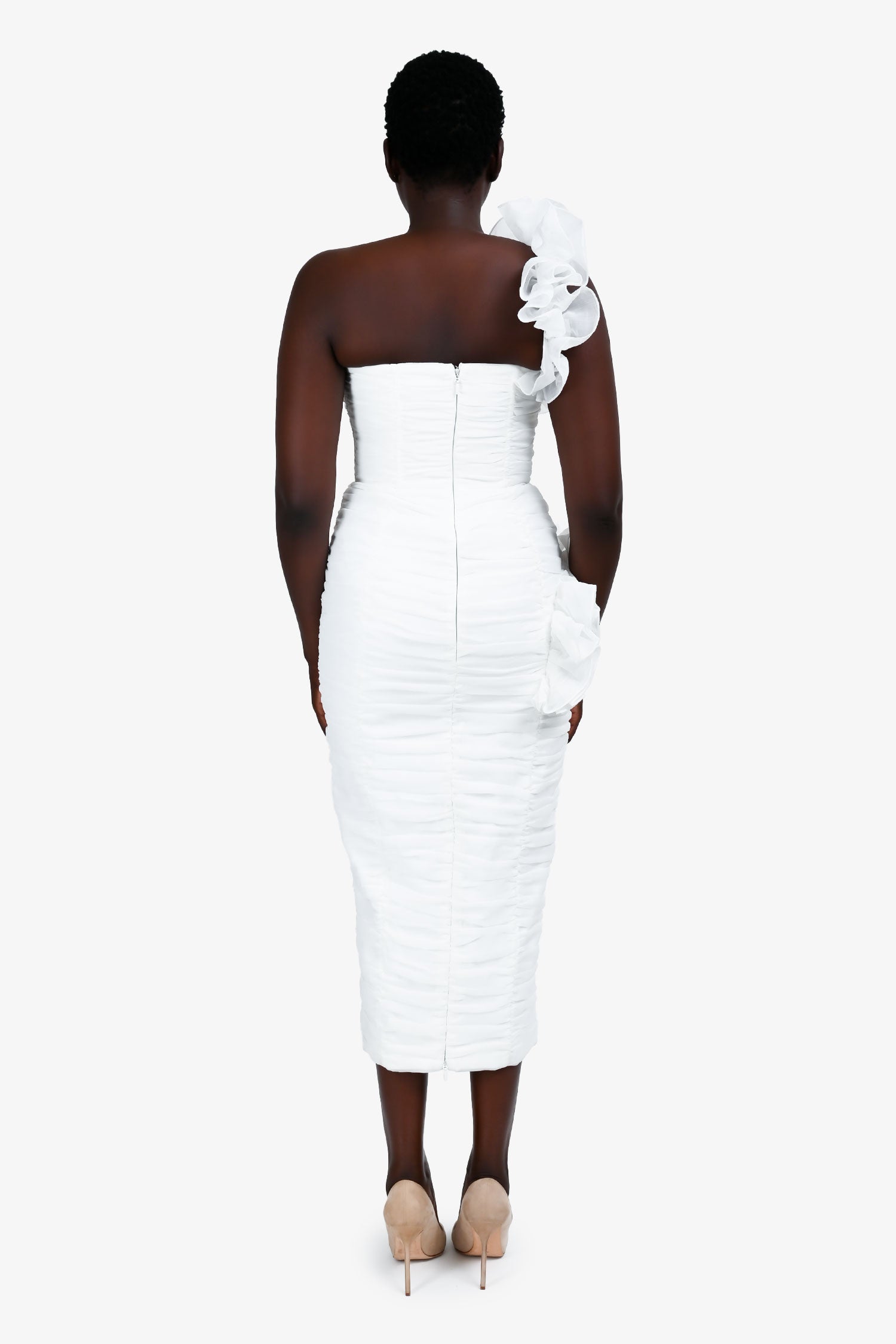 Refresh availabilityEliya The Label White One Shoulder Ruched 'Vana' Midi Dress. Back zip-up and zip-down closure. Silicone grip along the top edge to prevent slipping. Lined interior. Tonal stitching. *Modelled in Size S