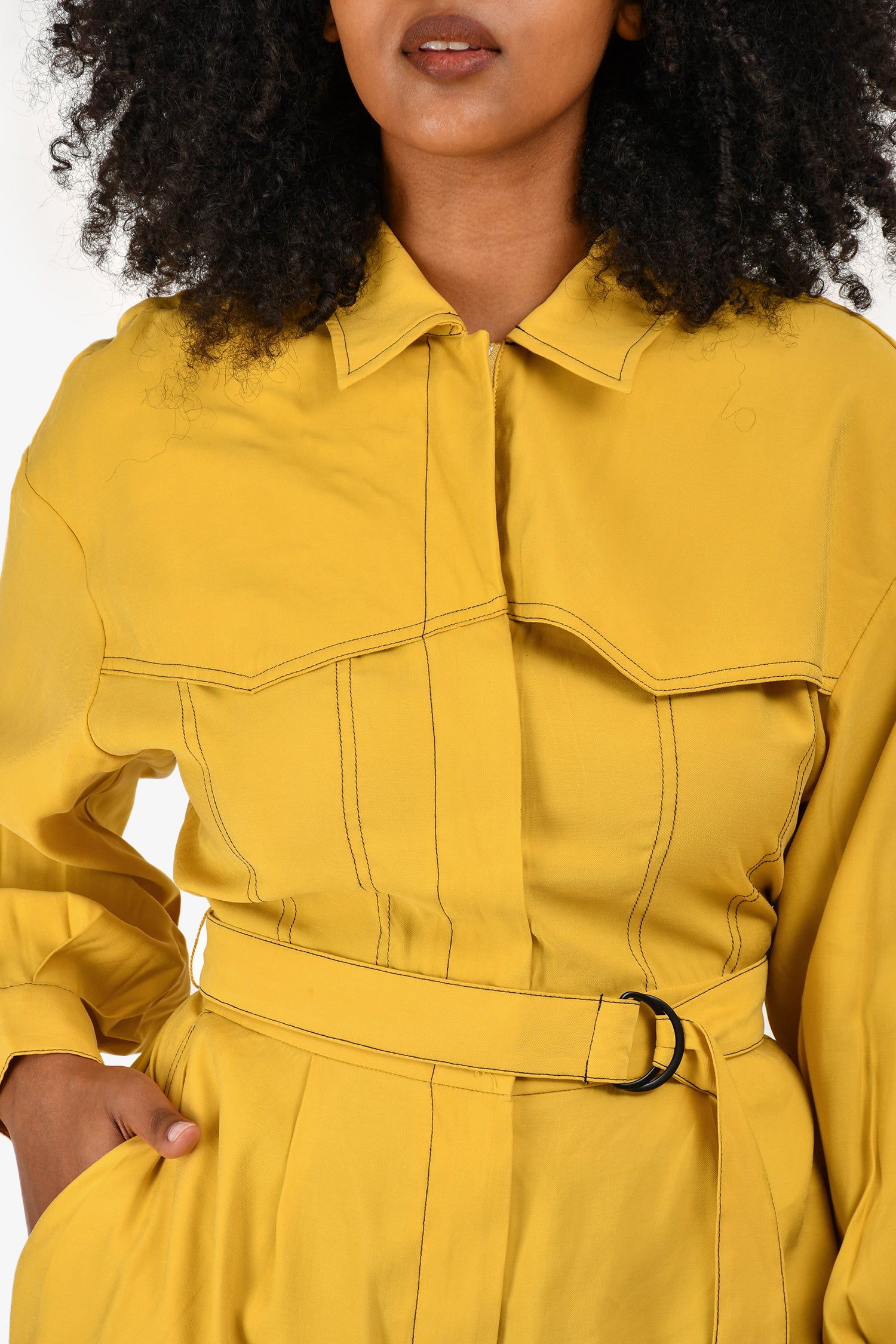Refresh availabilityElliatt Yellow Long Sleeve 'Ellie' Playsuit. Pointed neckline. Long sleeves with buttoned cuffs. Fitted waist with flared shorts. Front zip-up zip closure. Side pockets. Tonal stitching.