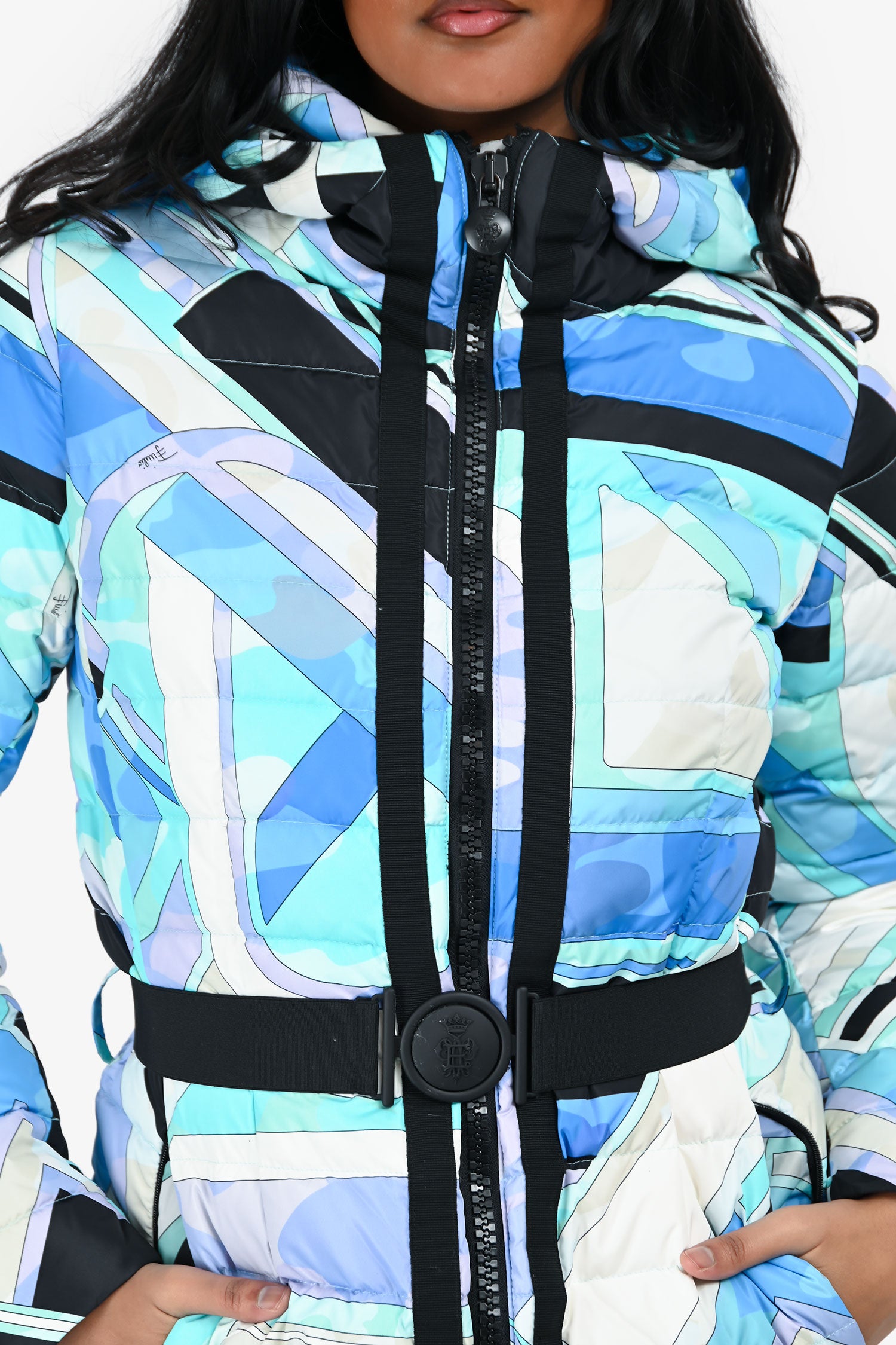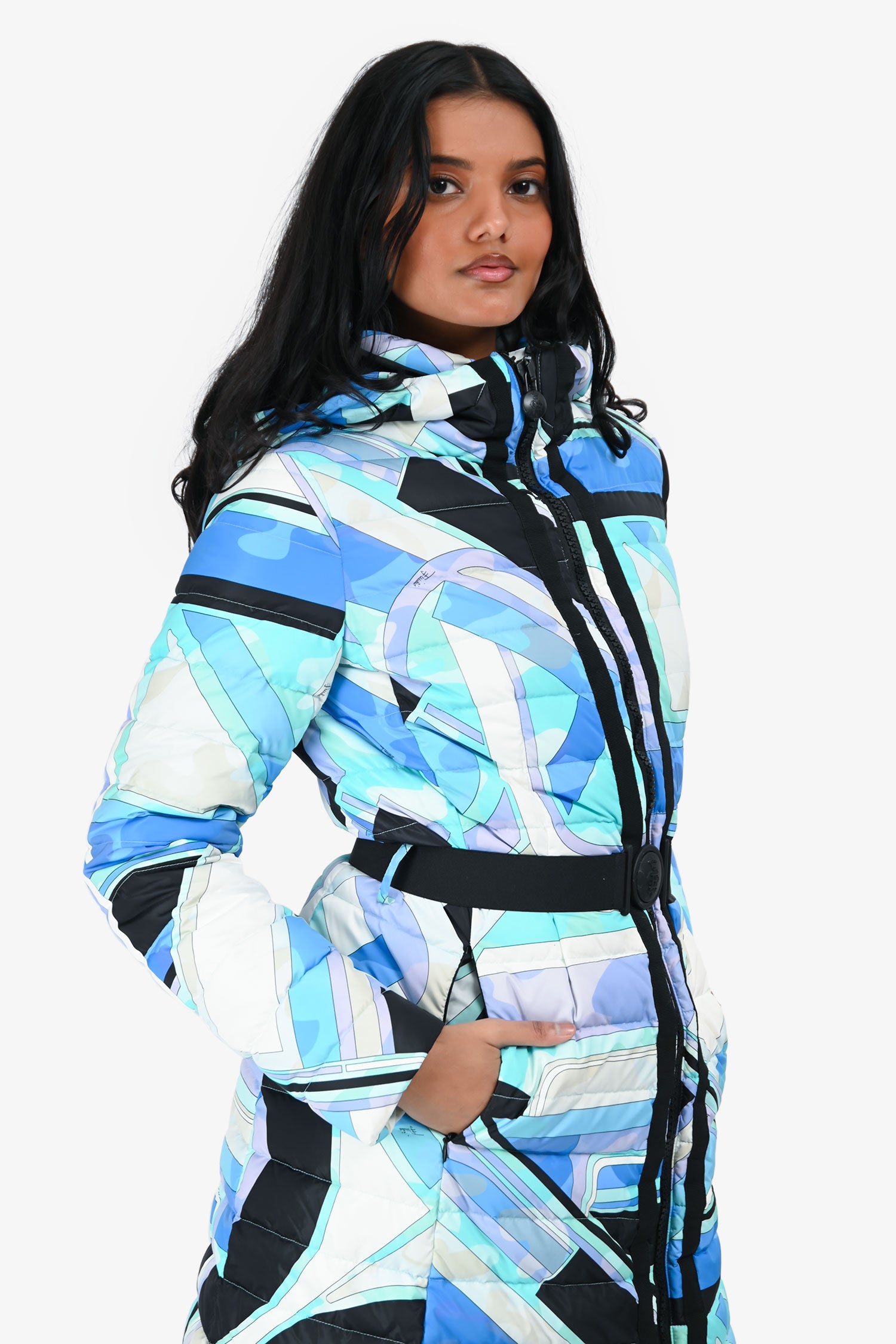 Refresh availabilityEmilio Pucci Blue/White Down Hooded Puffer Midi Jacket. Pull on. Front 2-way zipper closure. Detachable belt with magnetic closure. Button-up sleeves. 3 pockets; 2 front exterior zip, 1 interior zip. Tonal stitching.