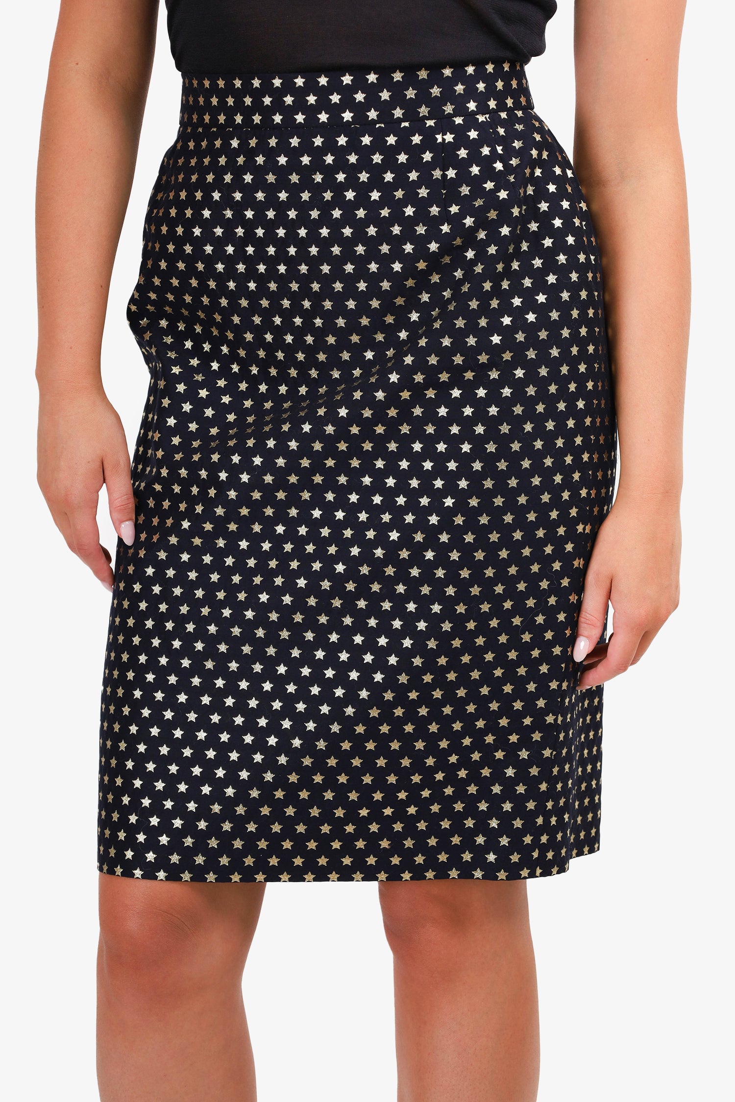 Refresh availabilityEscada Black/Gold Cotton Star Print Skirt. Pull-on. Rear zip with double button-up closure. Lined. Tonal stitching.