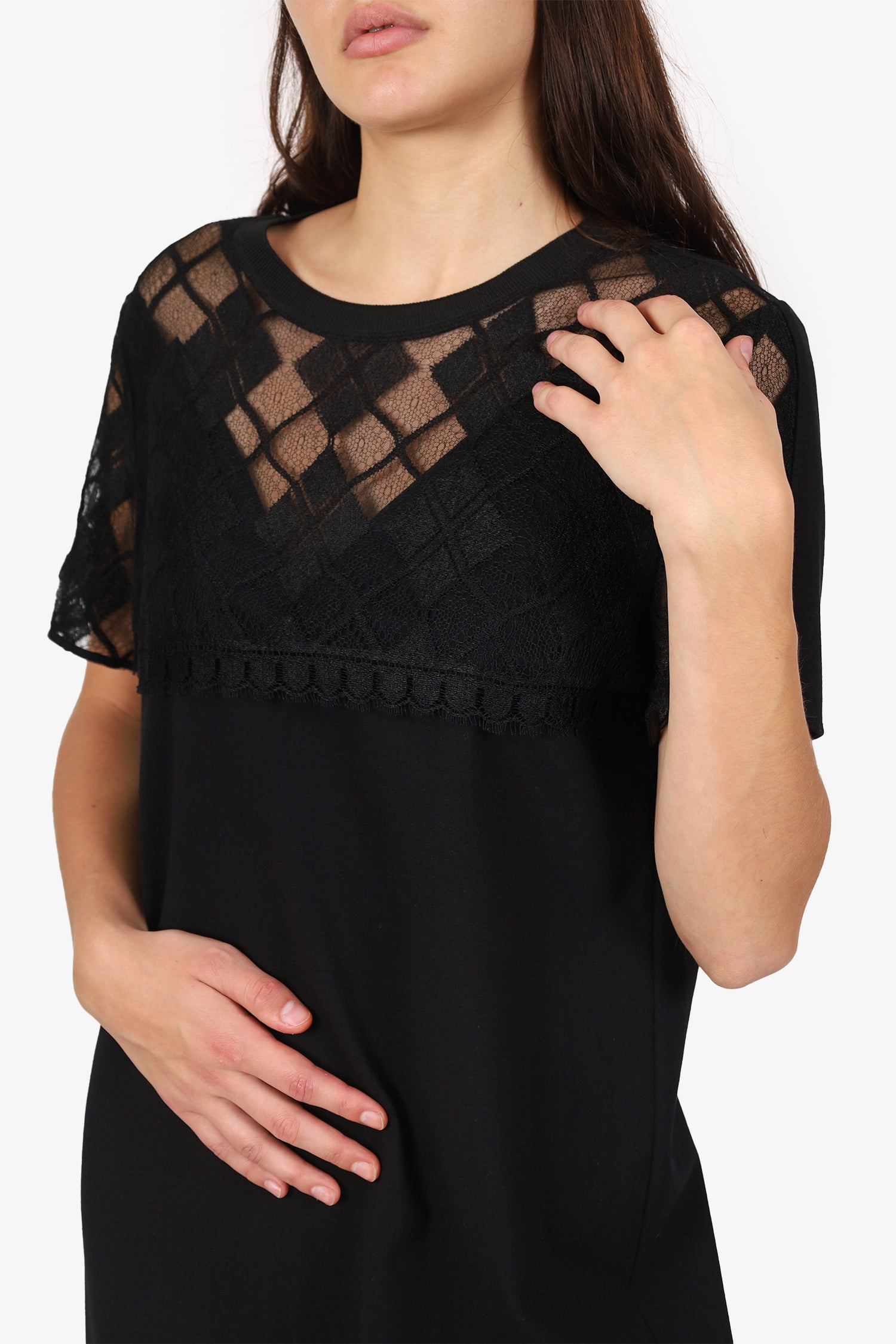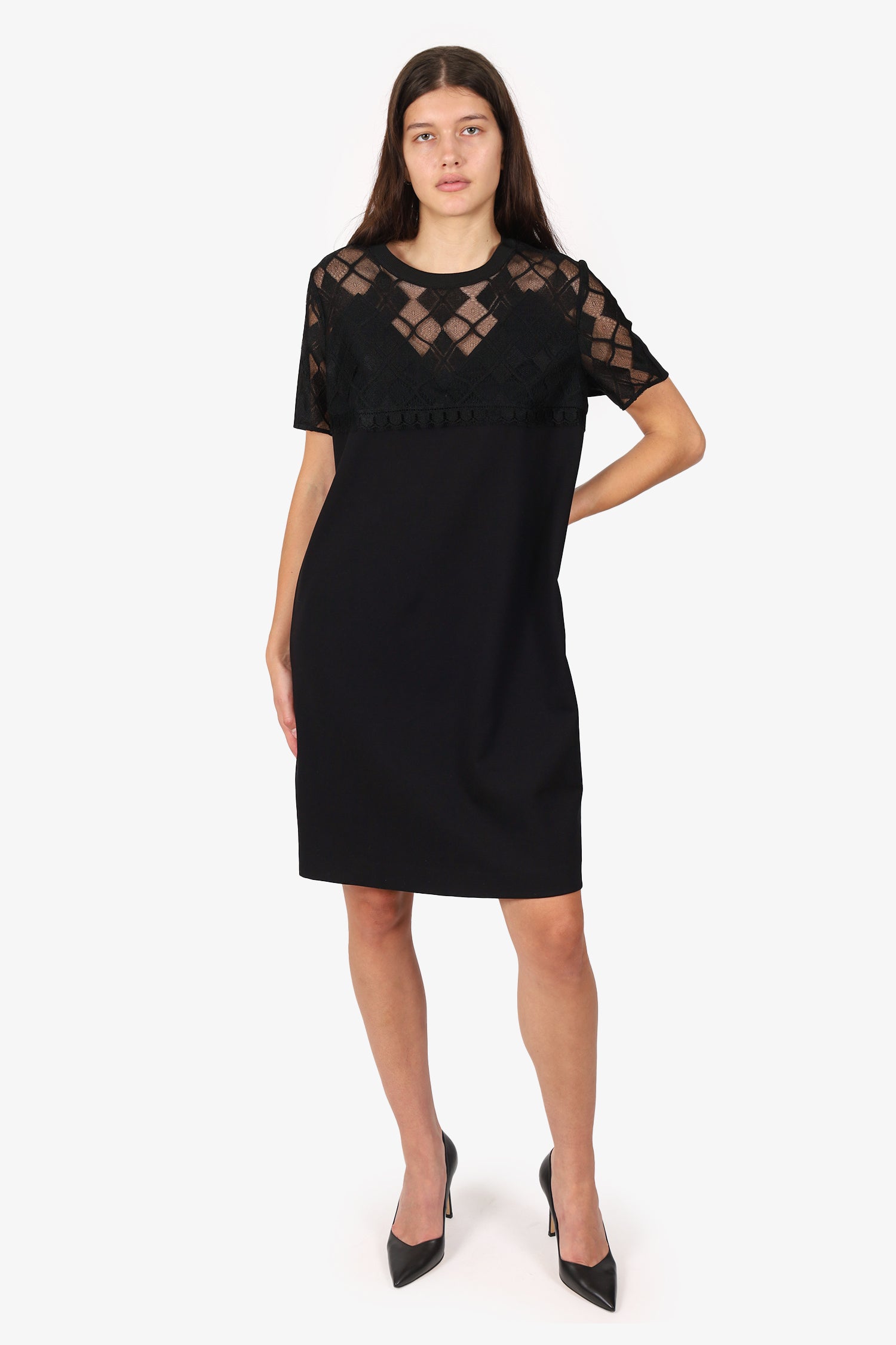 Refresh availabilityEscada Black Lace Detail Short Sleeve Dress. Slip on. Round neckline. Back zip closure. Front lace overlay. Gold-tone hardware. Tonal stitching.