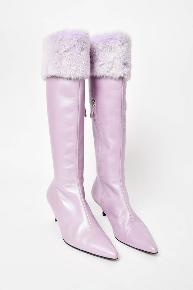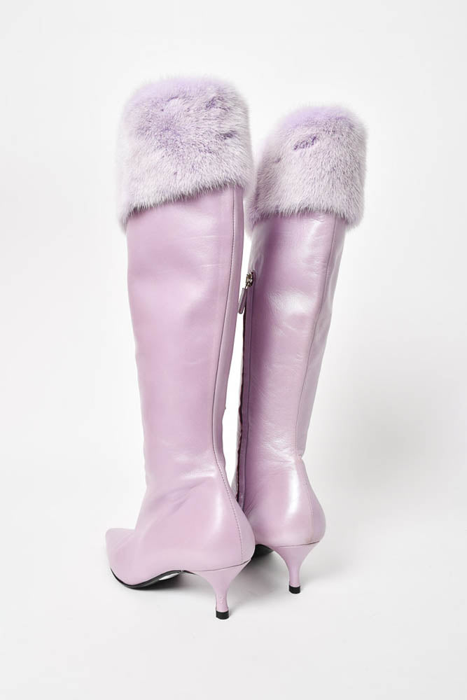 Refresh availabilityEscada Light Purple Knee High Boot with Fur Trim. Pointed toe. Side zip closure. Kitten heel. Tonal stitching.
