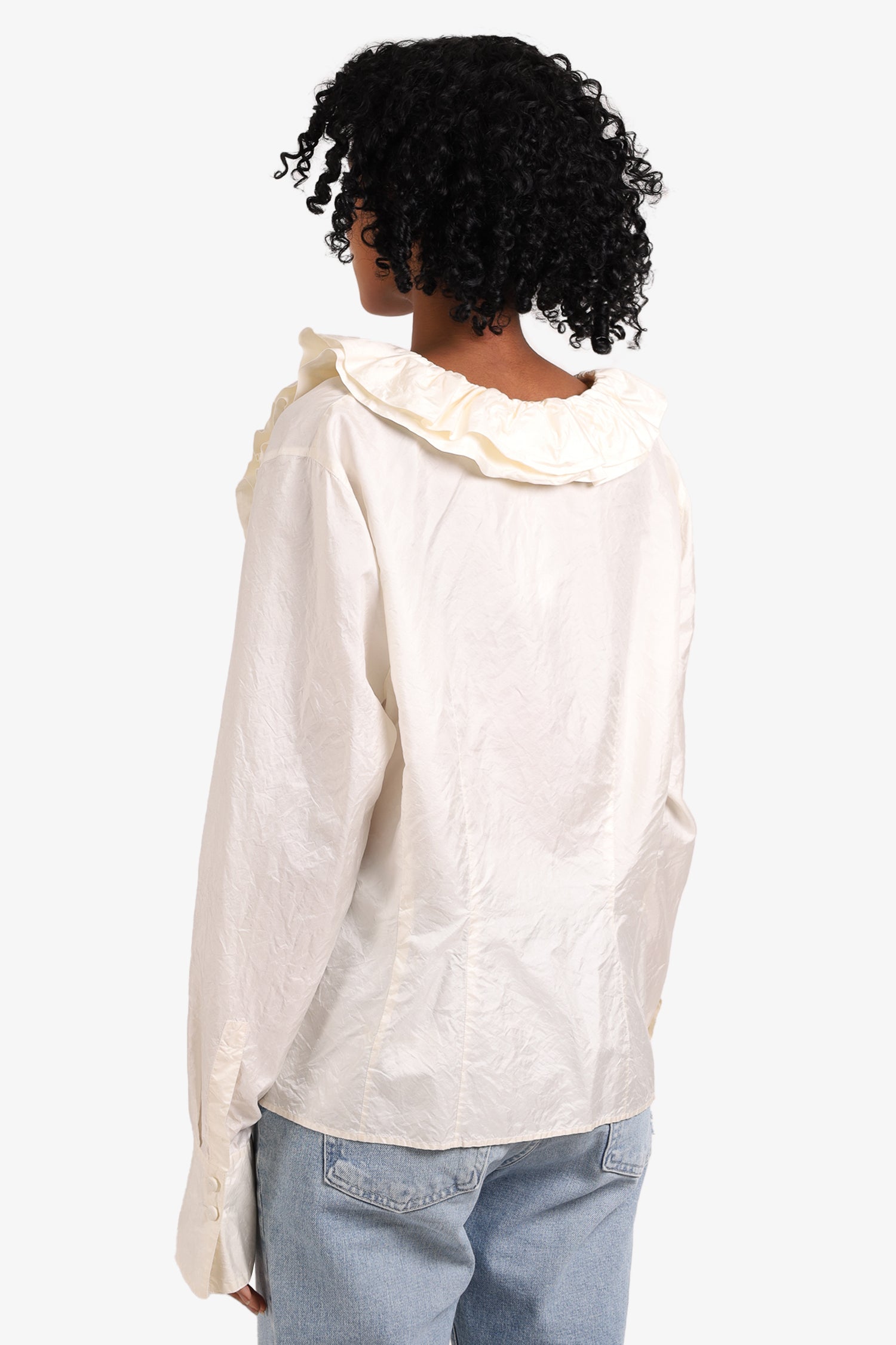 Escada White Silk Ruffle Blouse. Front button-up closure. Sleeve cuff buttons. Unlined. Tonal stitching.