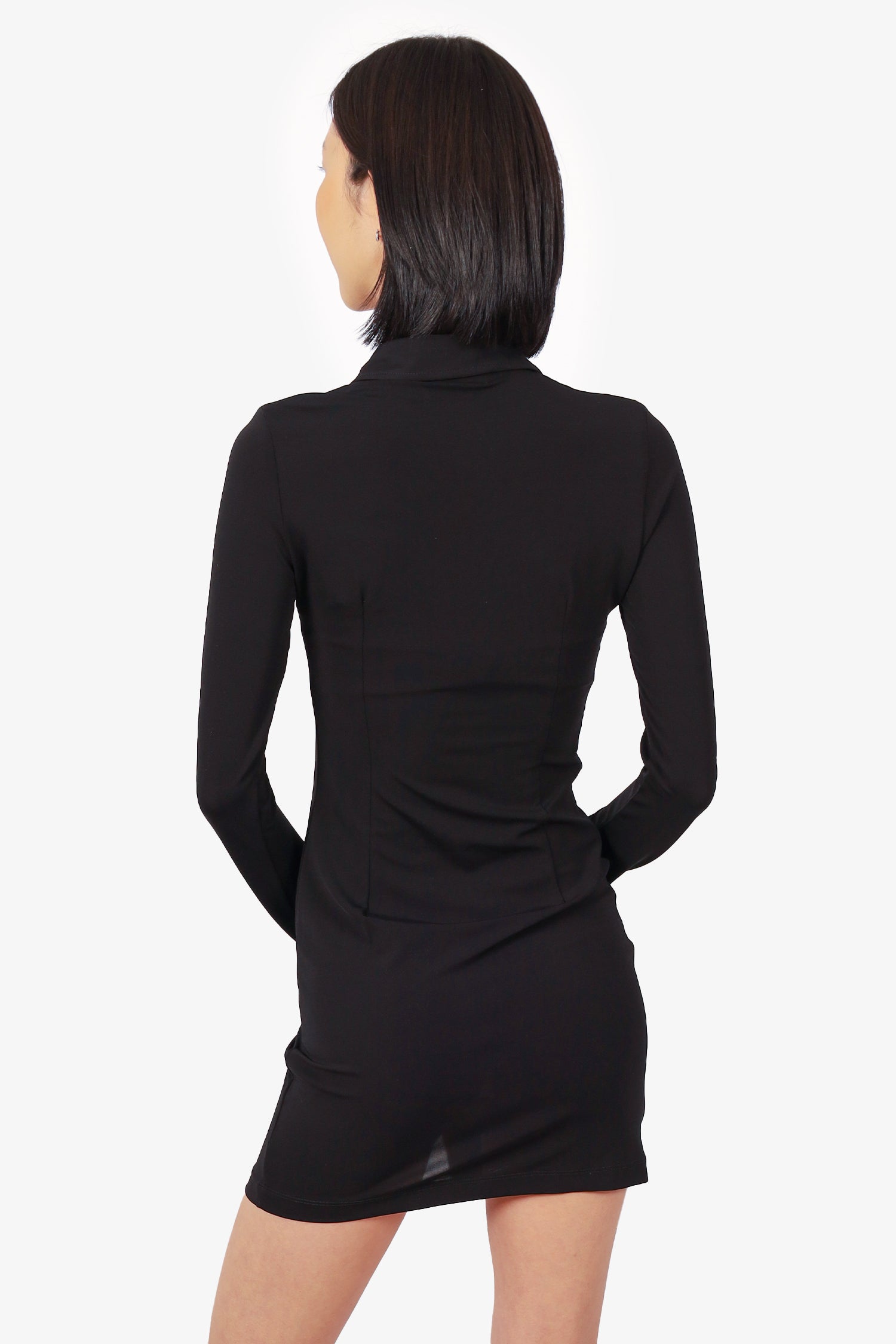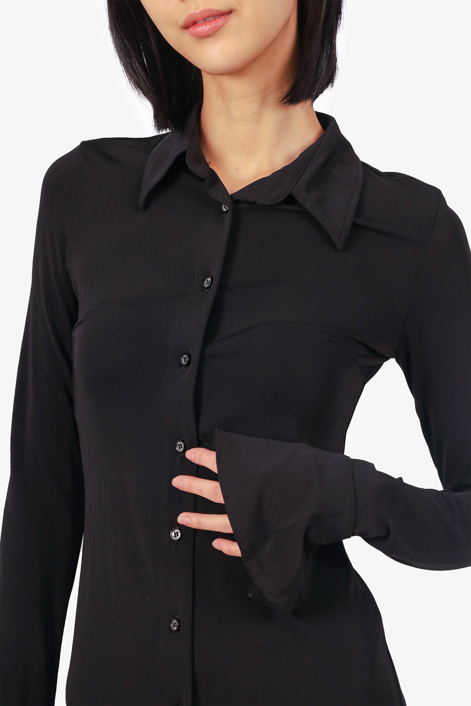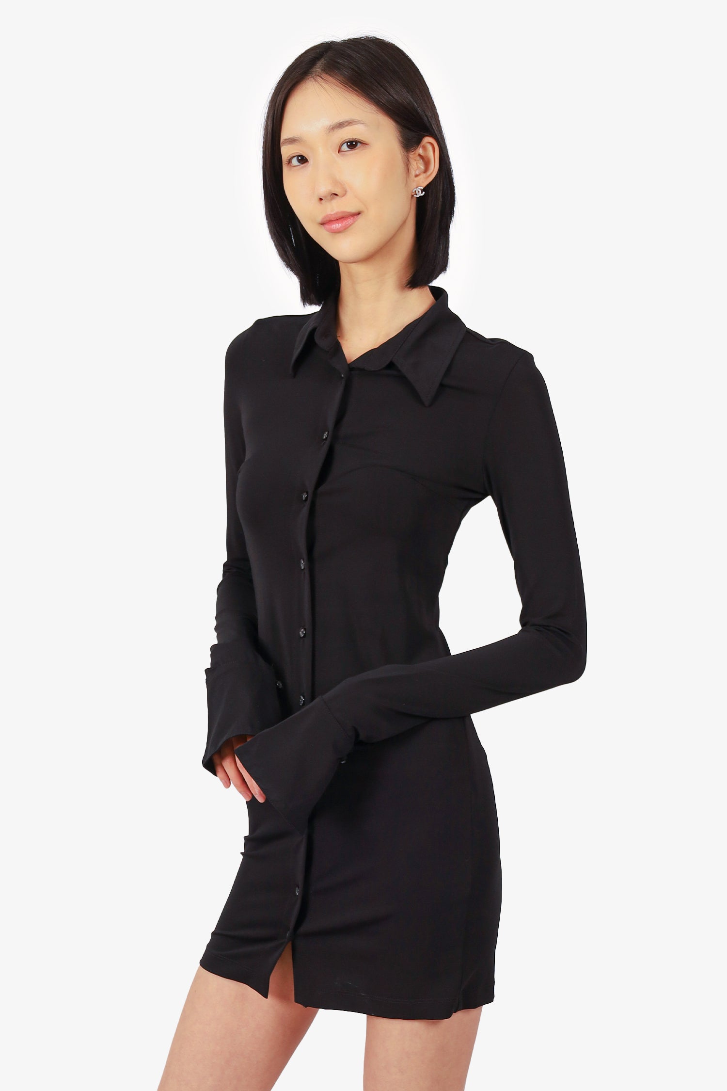 Refresh availabilityEterne Black Button Down Long Sleeve Mini Dress. Collared-neckline. Front button-up closure. Split hem with single button closure at sleeve cuffs. Tonal stitching.