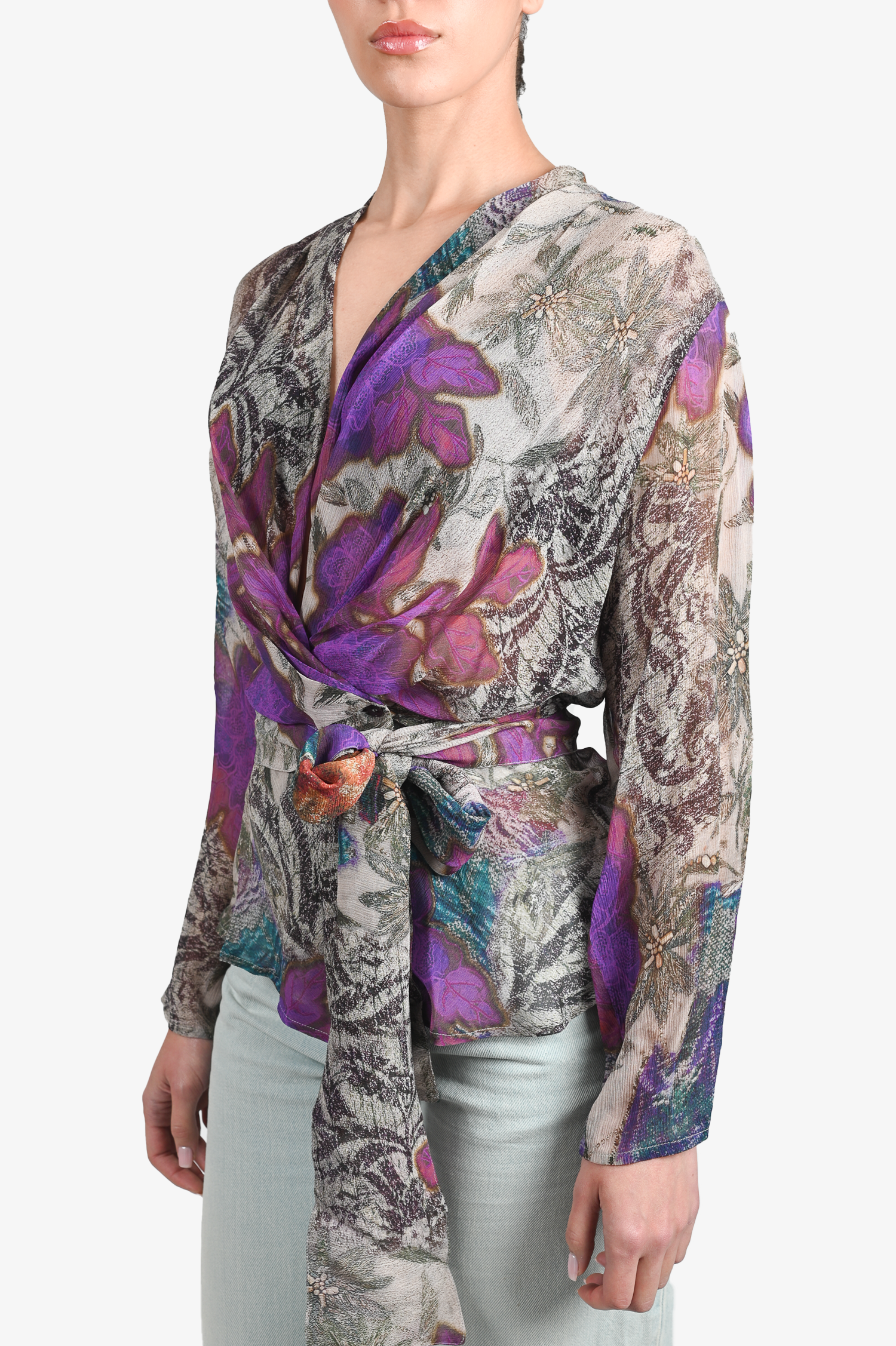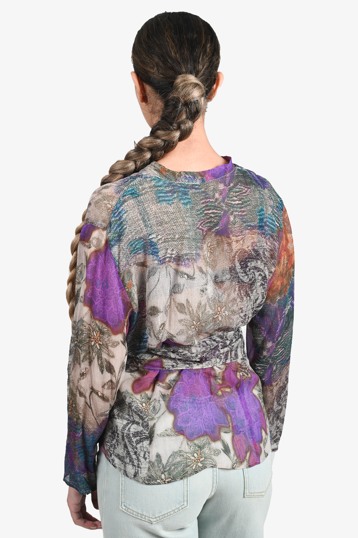 Refresh availabilityEtro Beige/Purple Silk Belted Blouse. Belt closure. Sheer. Tonal stitching.