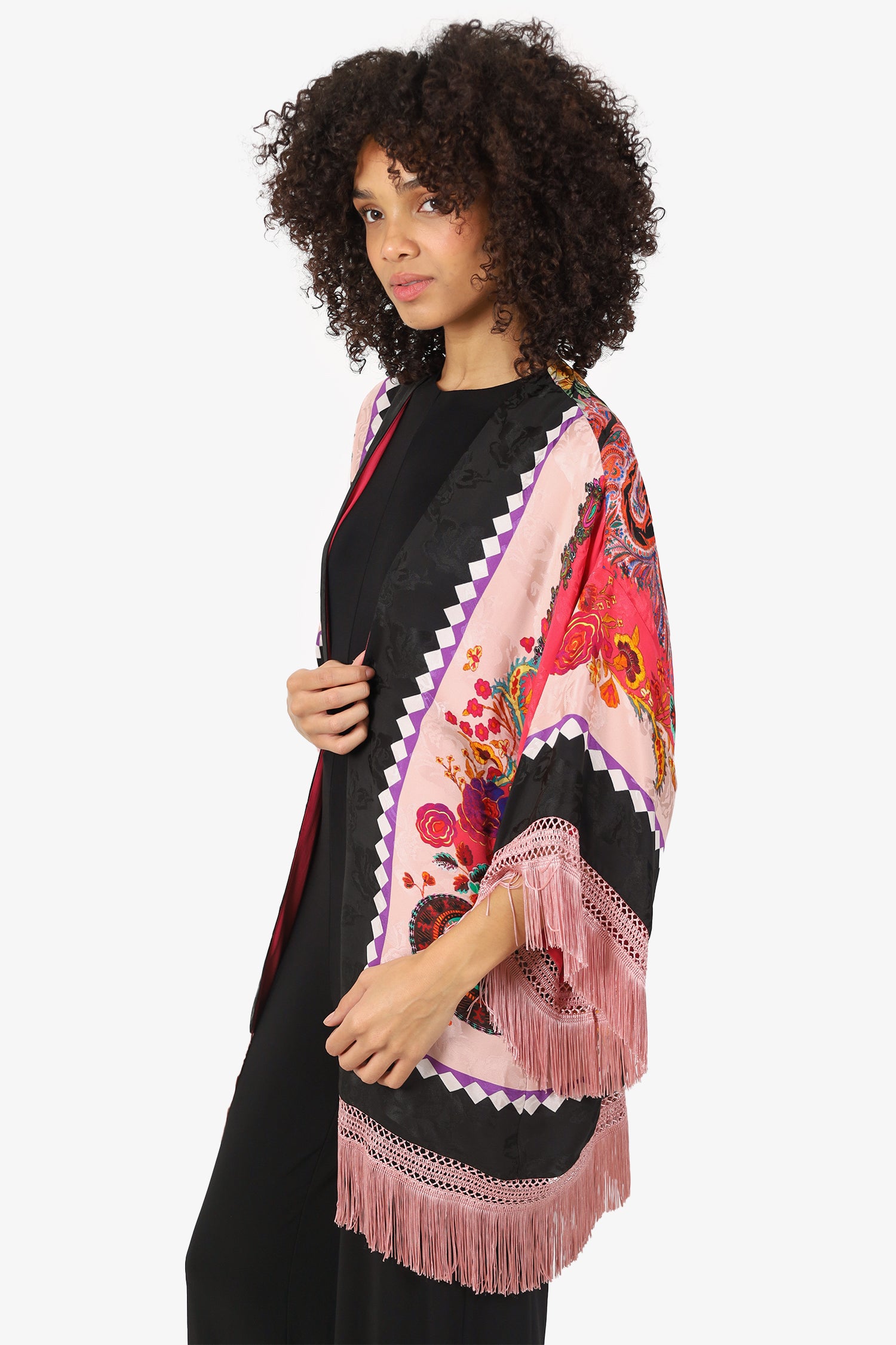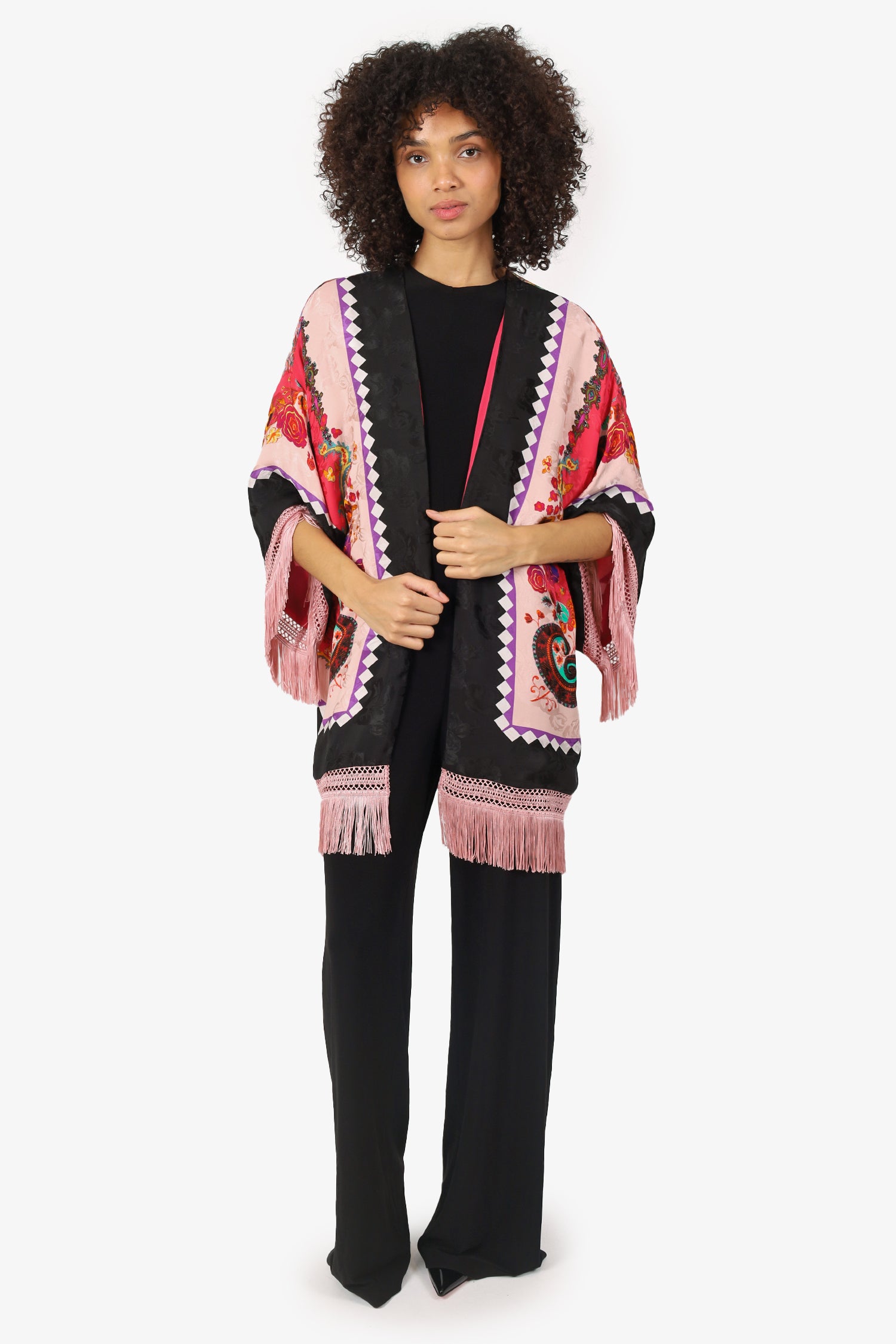 Refresh availabilityEtro Black/Pink Silk Printed Fringed Robe. Pull-on. Open front. Lined interior. Tonal stitching.