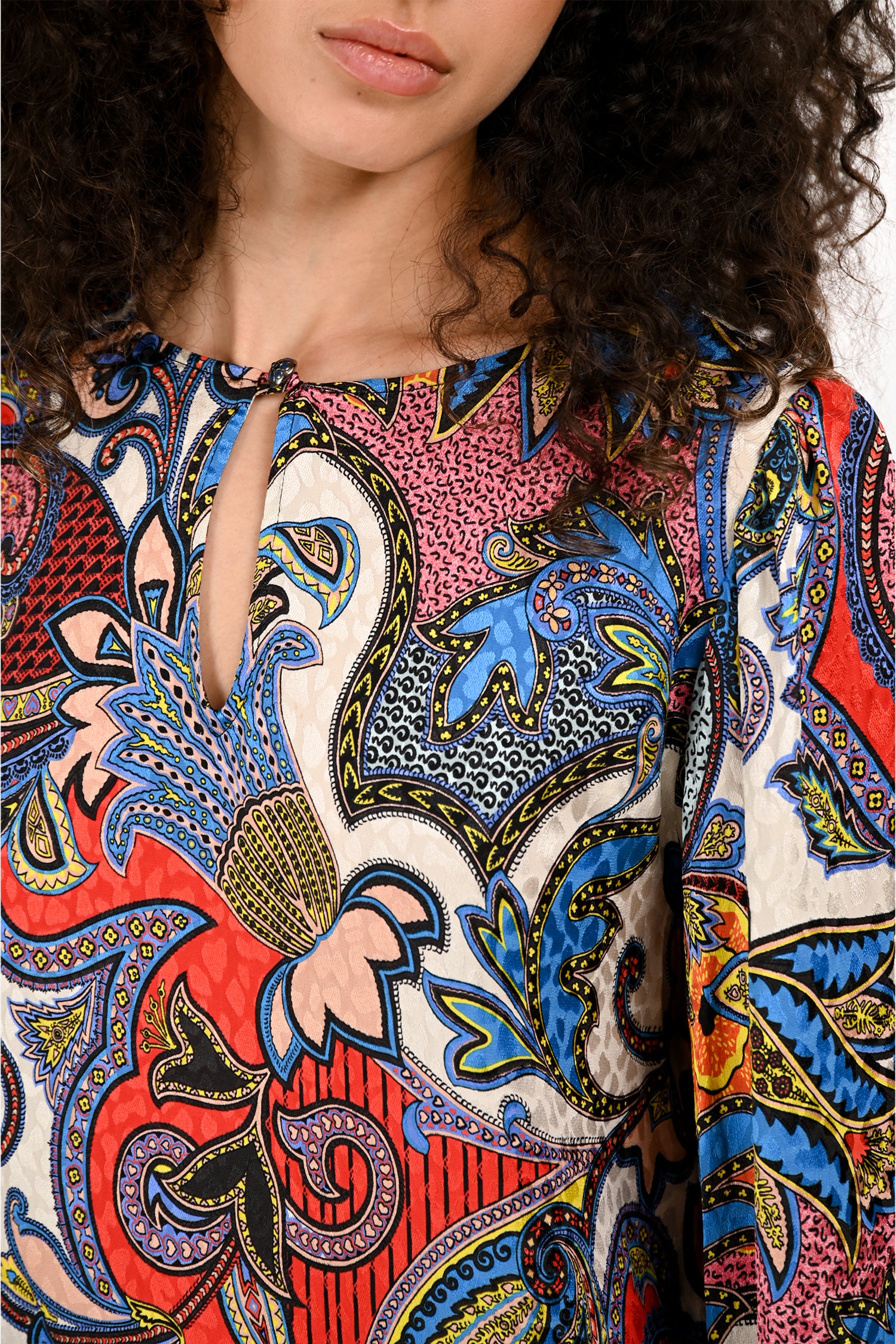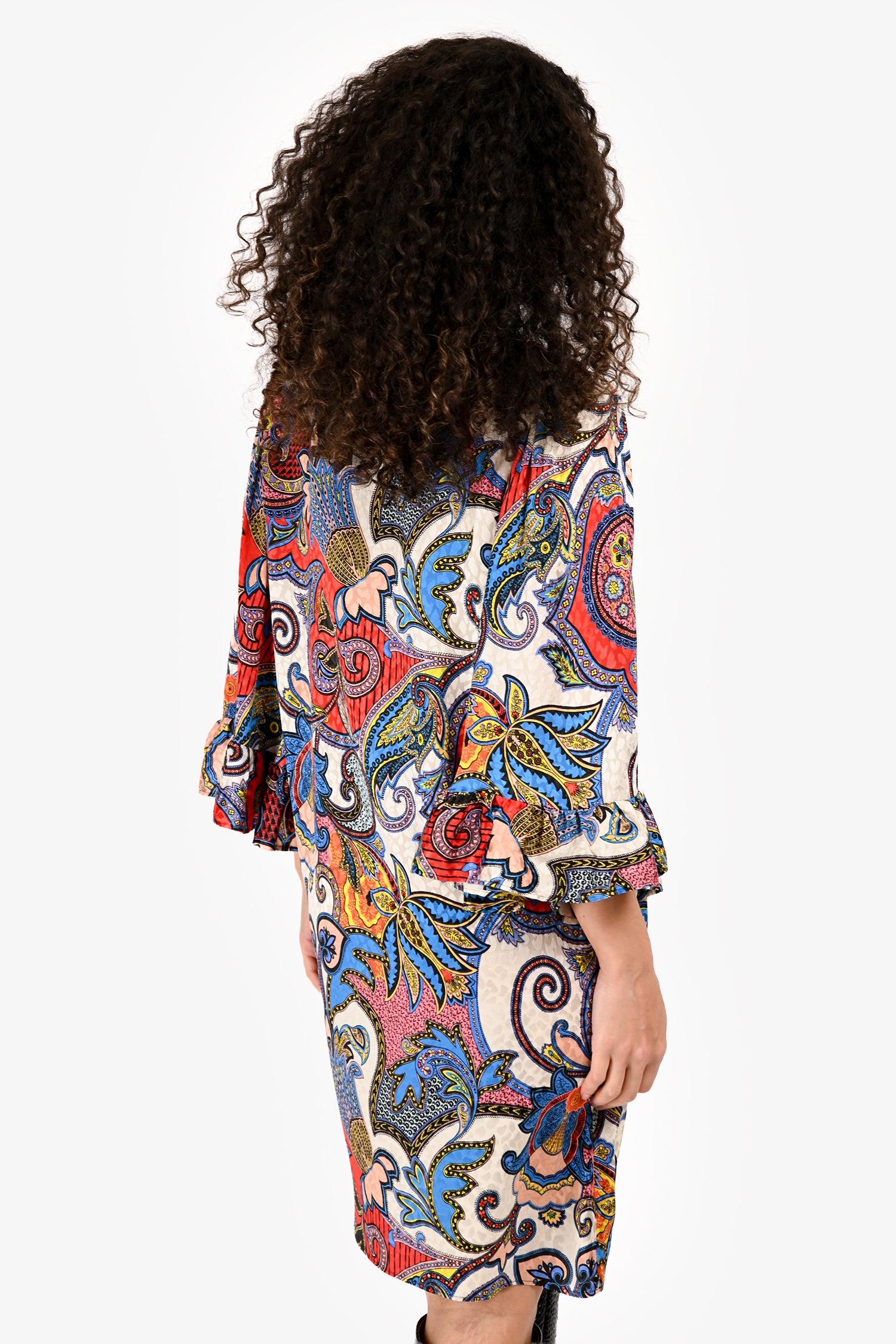Refresh availabilityEtro Blue/Red Printed Silk Kaftan Dress. Pull-on. Round neckline. Button detailing in the front. Silver-tone hardware. Tonal stitching.