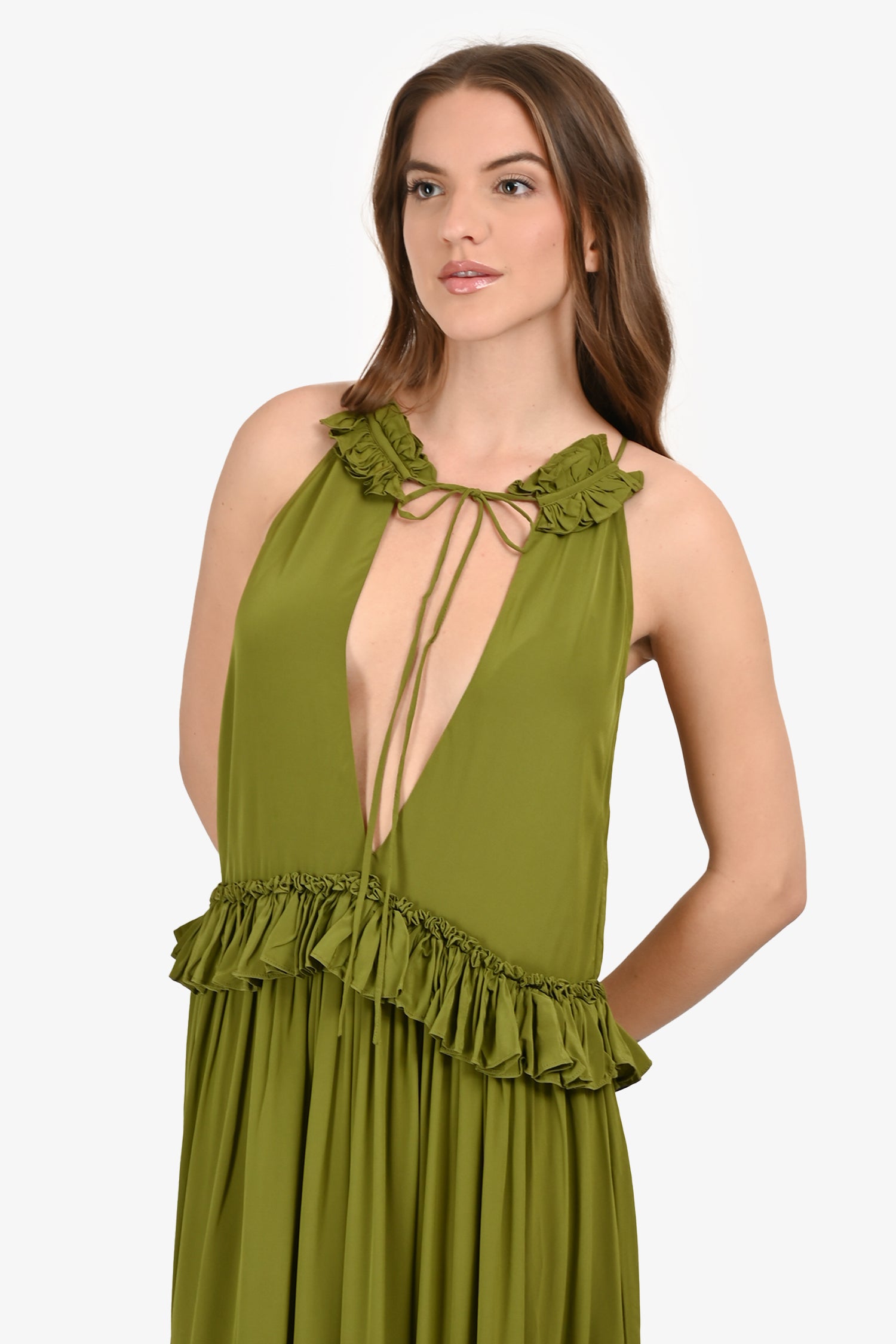 Refresh availabilityEvarae Green Ruffled Front-Tie Maxi Dress. Slip-on. V-neckline with front tie closure. Lined interior. Tonal stitching.