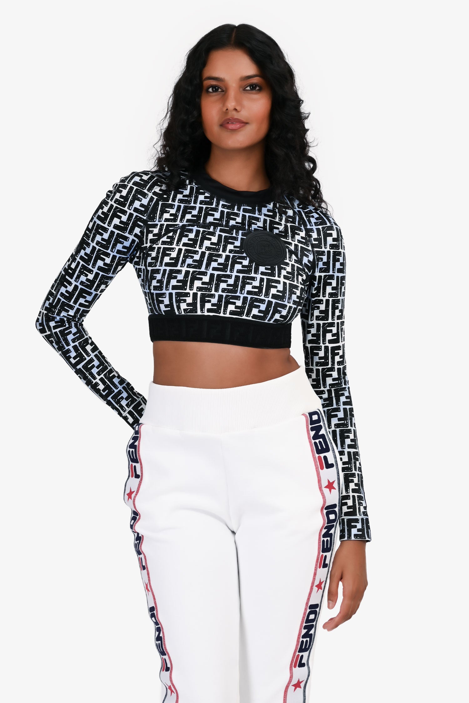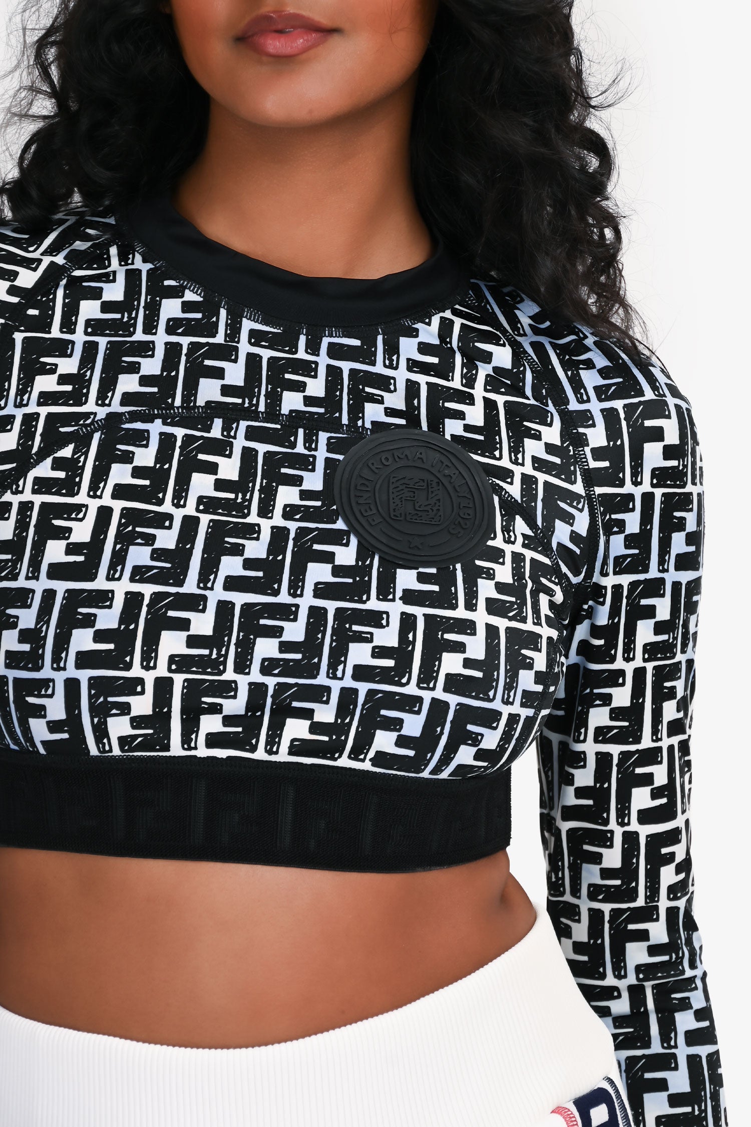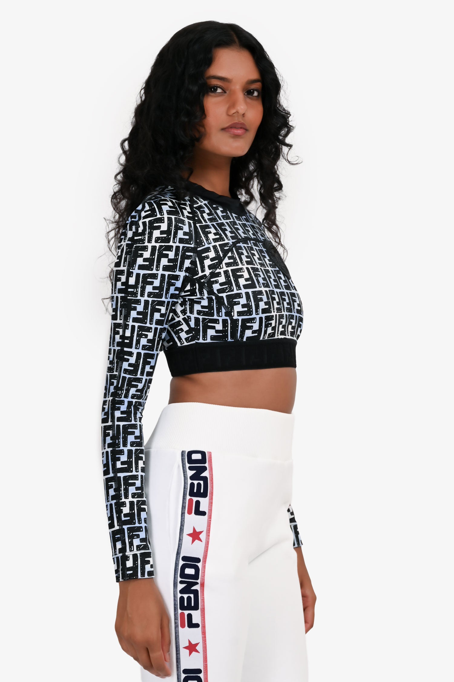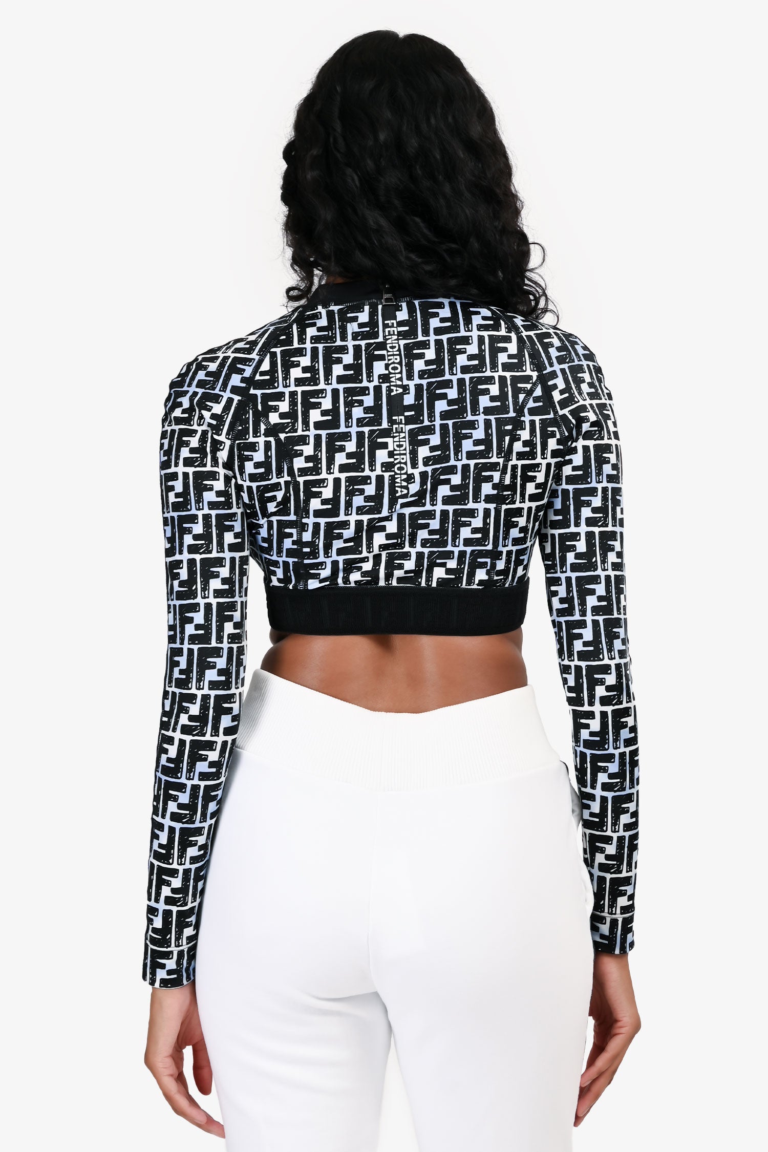 Refresh availabilityFendi Black/Blue FF Print Long Sleeves Active Crop Top. Crew neckline. Long sleeves. Stretch fit. Back zip closure. Tonal stitching.
