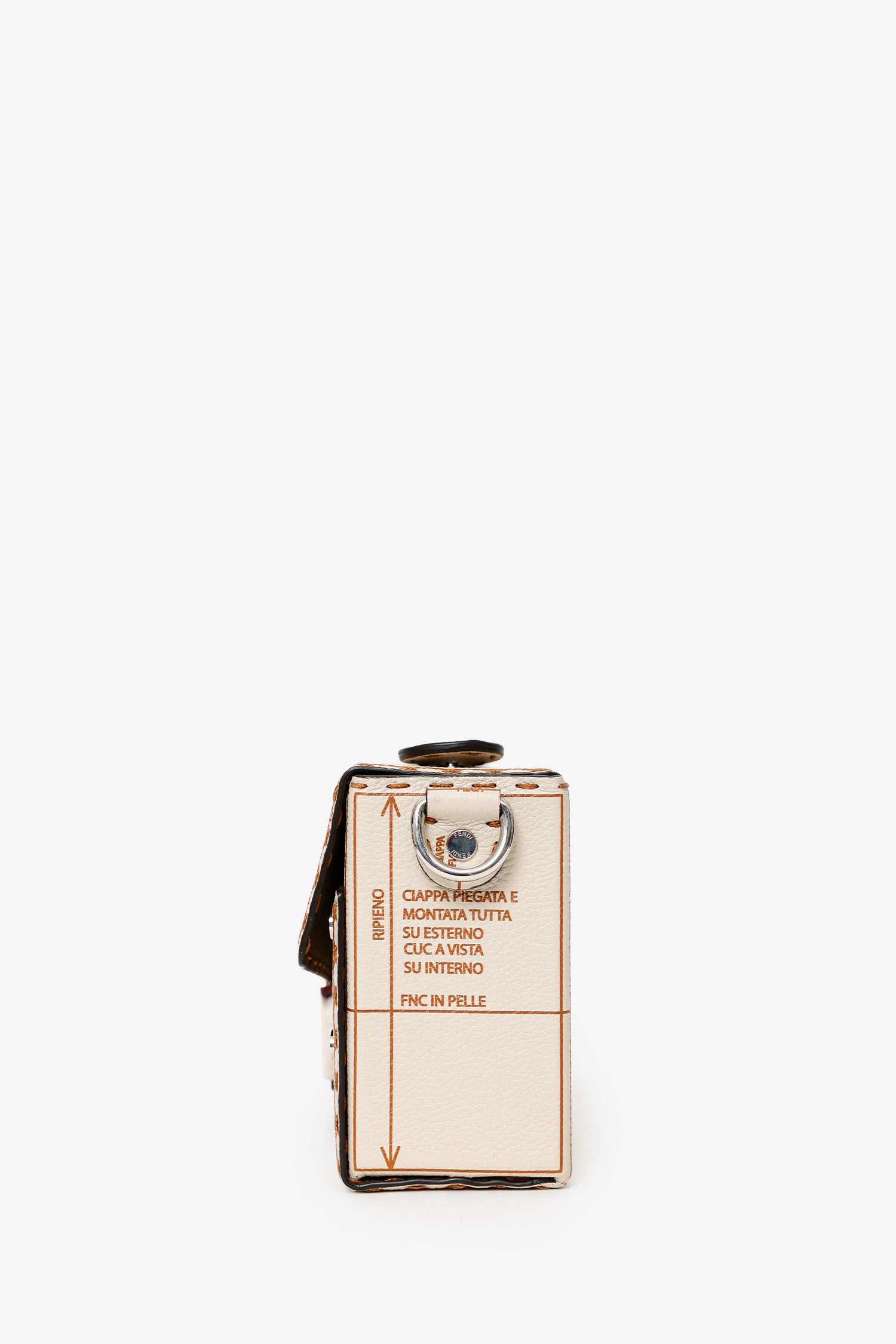 Refresh availabilityFendi Beige Calfskin 'Sac En Cuir Convertible' Trunk Baguette. Front fold-over flap with magnetic button-up closure. Top handle. Removable and adjustable push-pin buckle shoulder strap with clasp closure. Lined interior. Single interior compartment with 6 card slots. Silver-tone hardware. Contrast stitching.