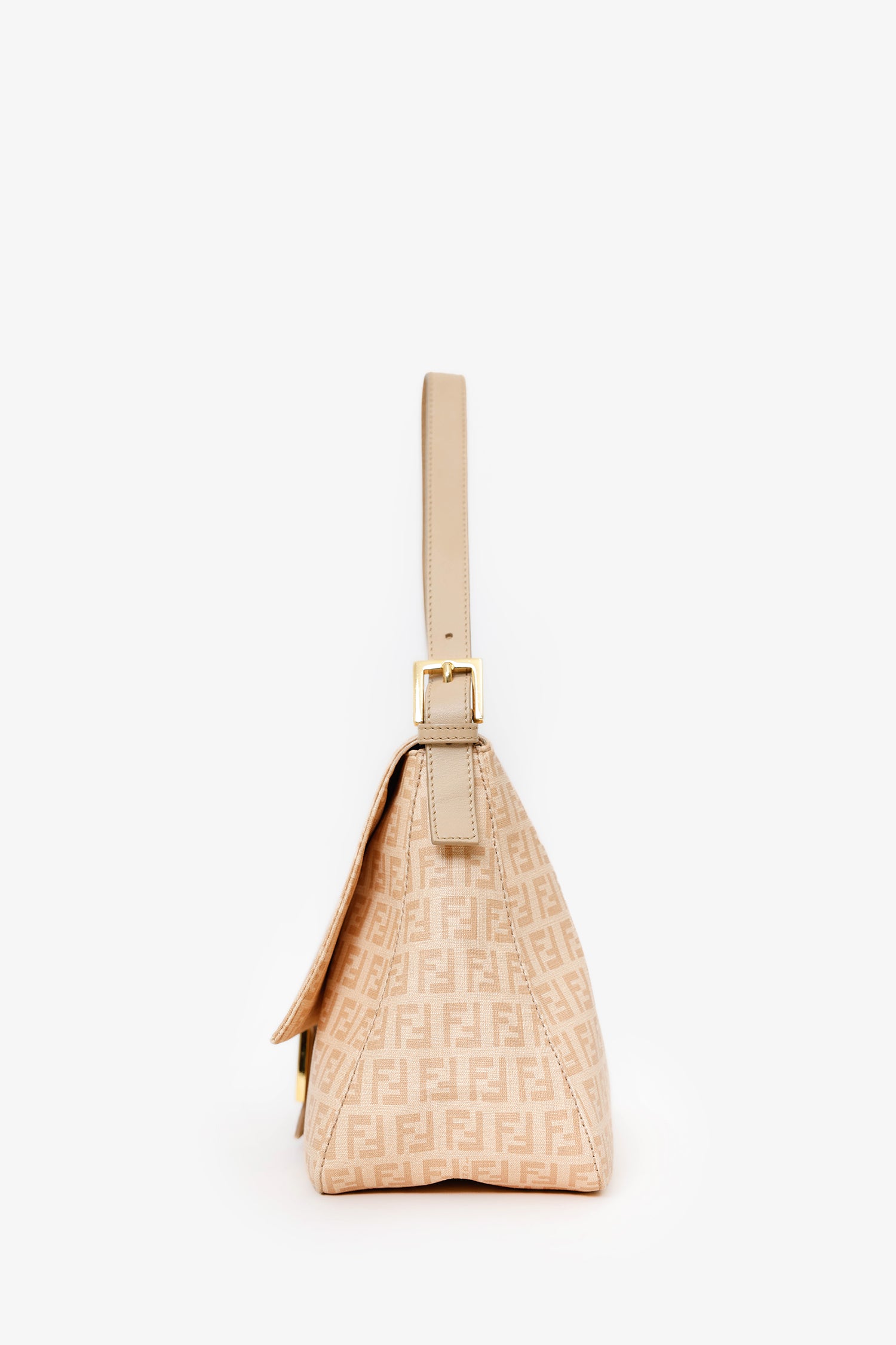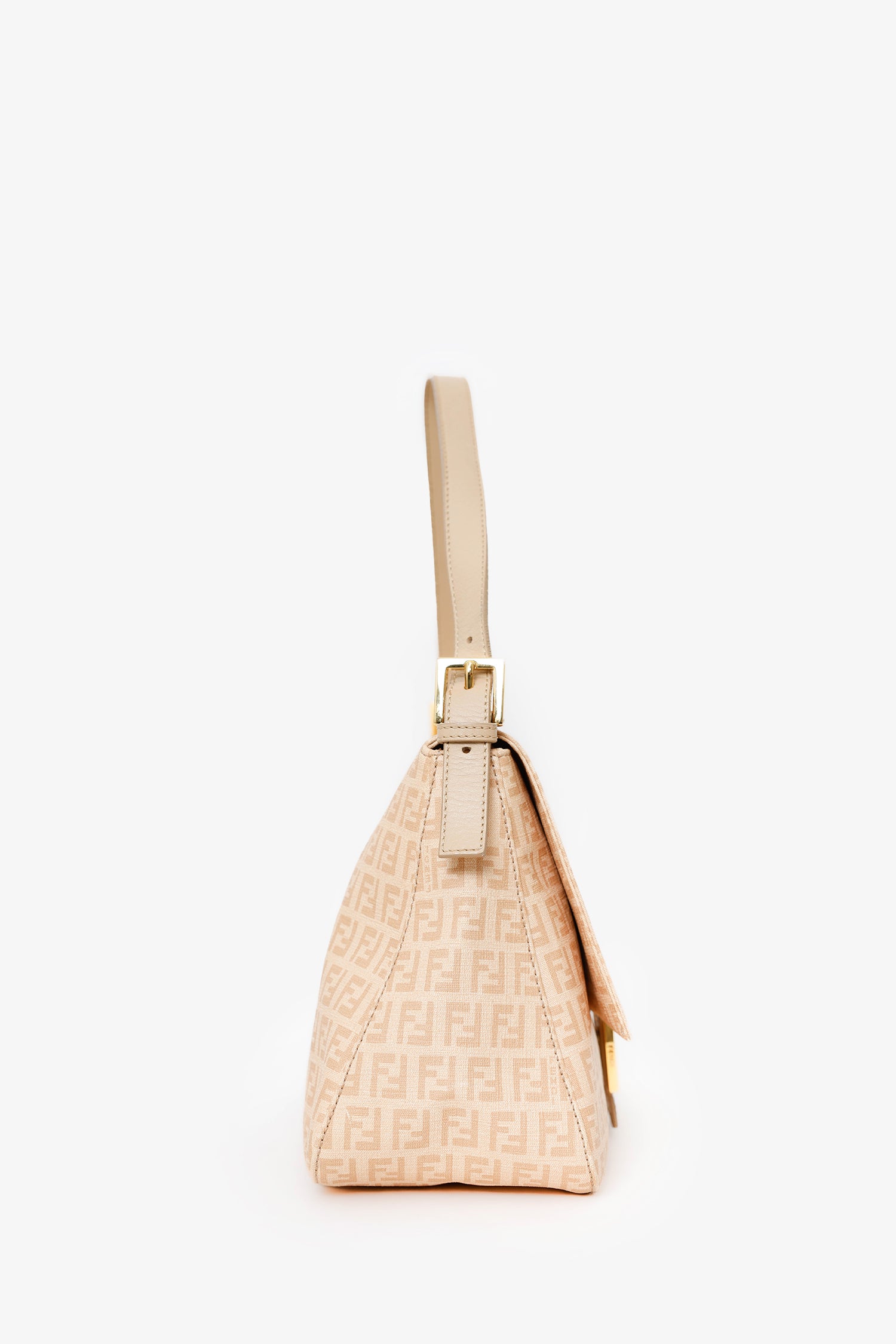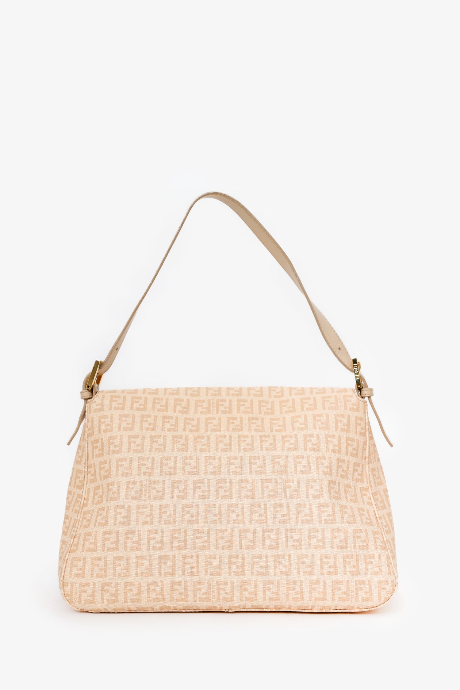 Refresh availabilityFendi Beige FF Zucca Mama Forever Baguette. Front-fold-over-flap with snap-button-up closure. Shoulder strap with adjustable pull-through buckle closure. Lined interior with single rear zip-up pocket. Gold-tone hardware. Tonal stitching.