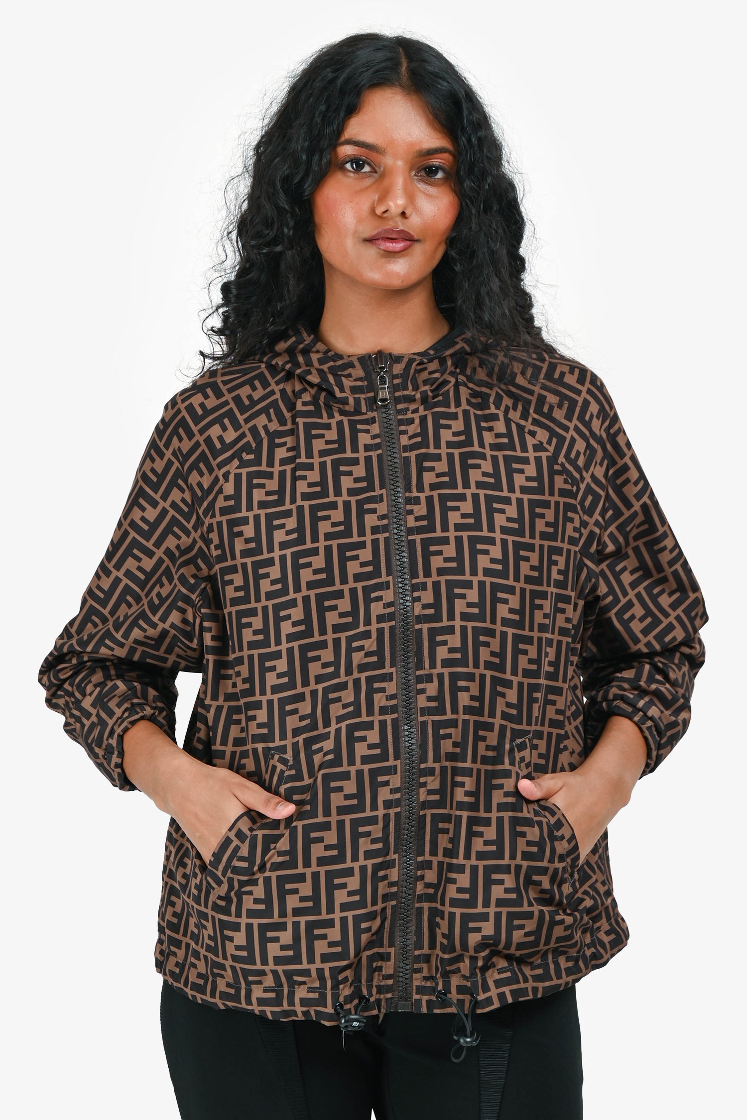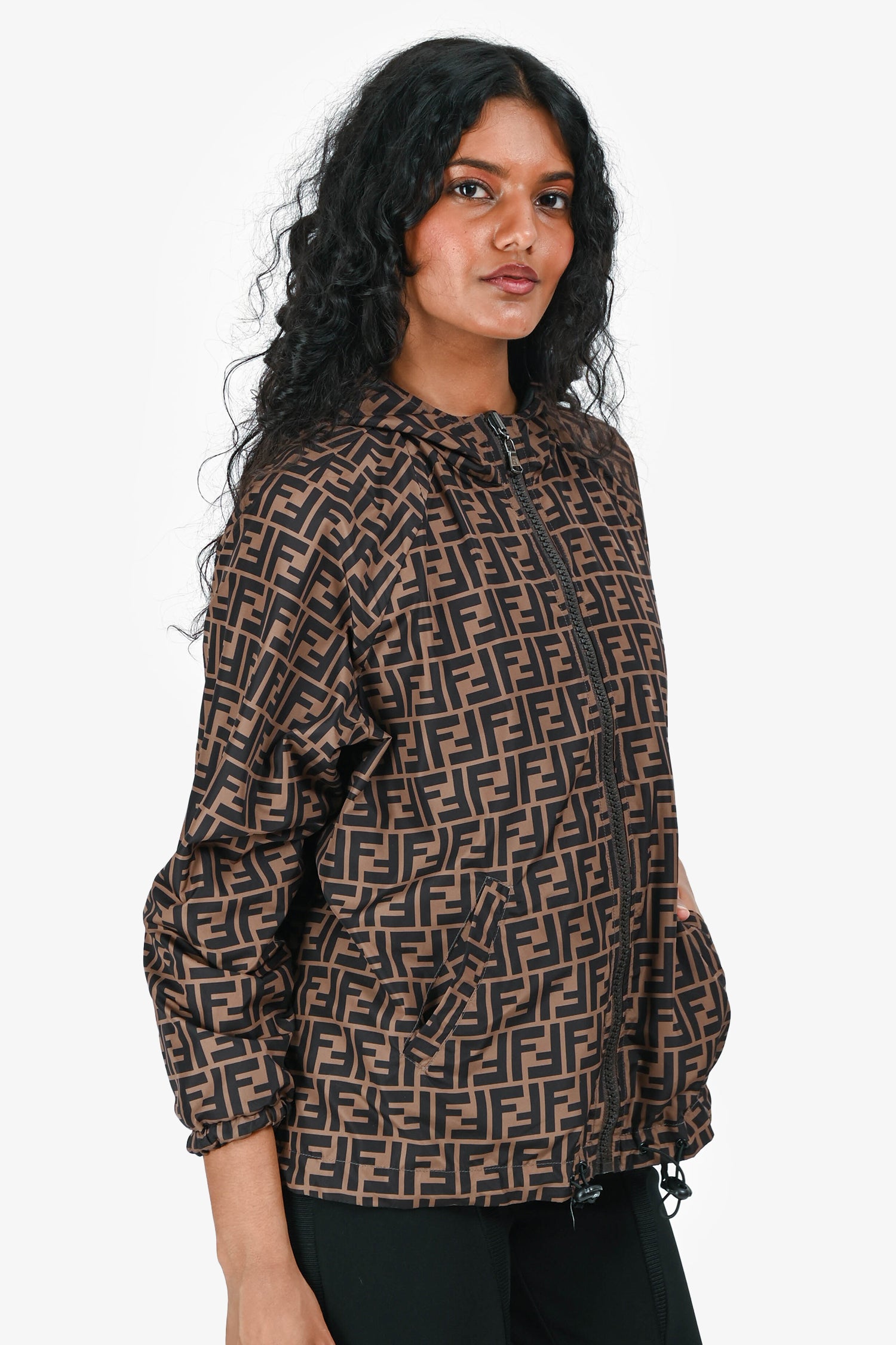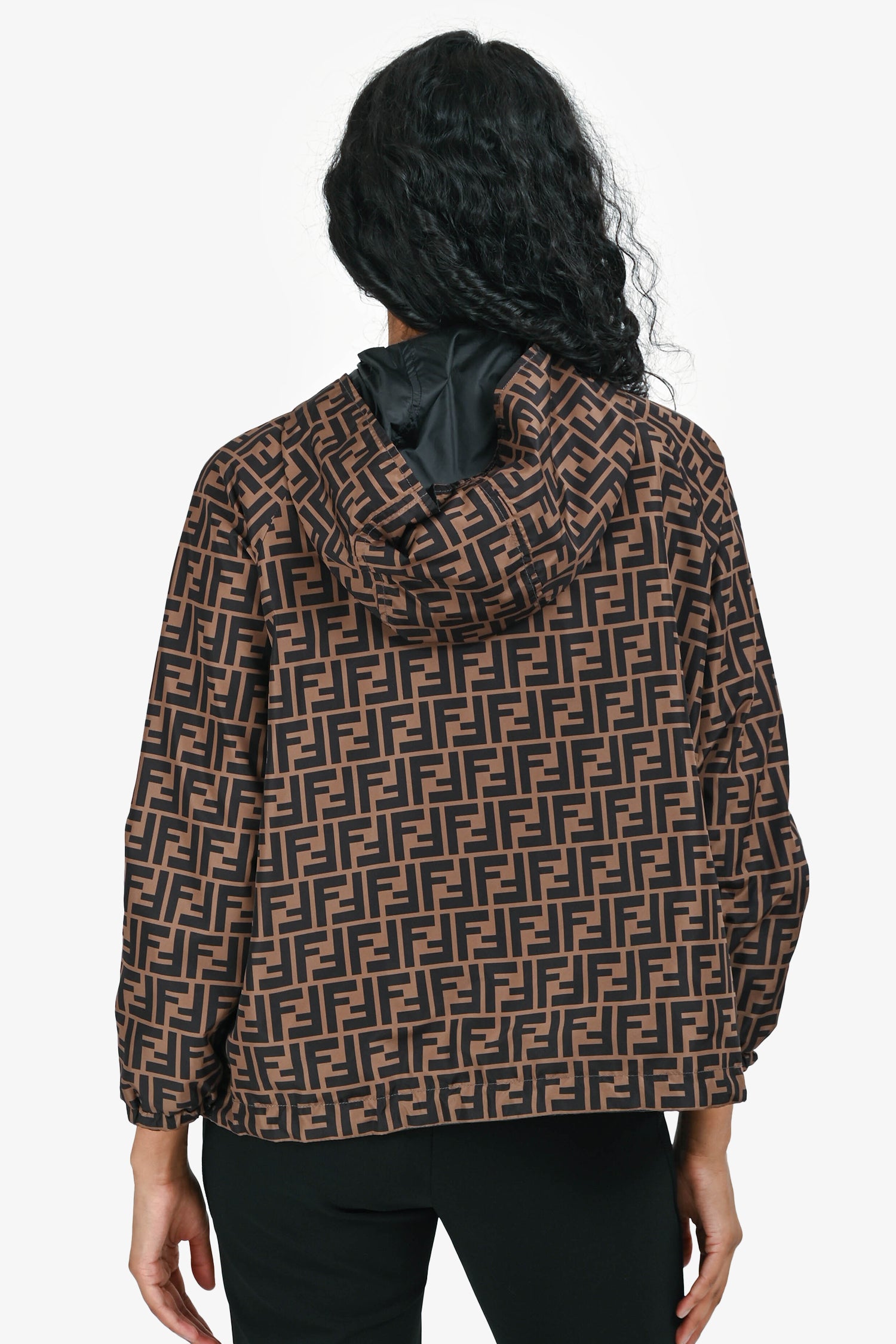 Refresh availabilityFendi Black/Brown Zucca Printed Nylon Reversible Windbreaker Jacket. Front zip closure. Hooded neckline. Side pockets. Elasticized cuffs. Drawstring at hem. Tonal stitching.