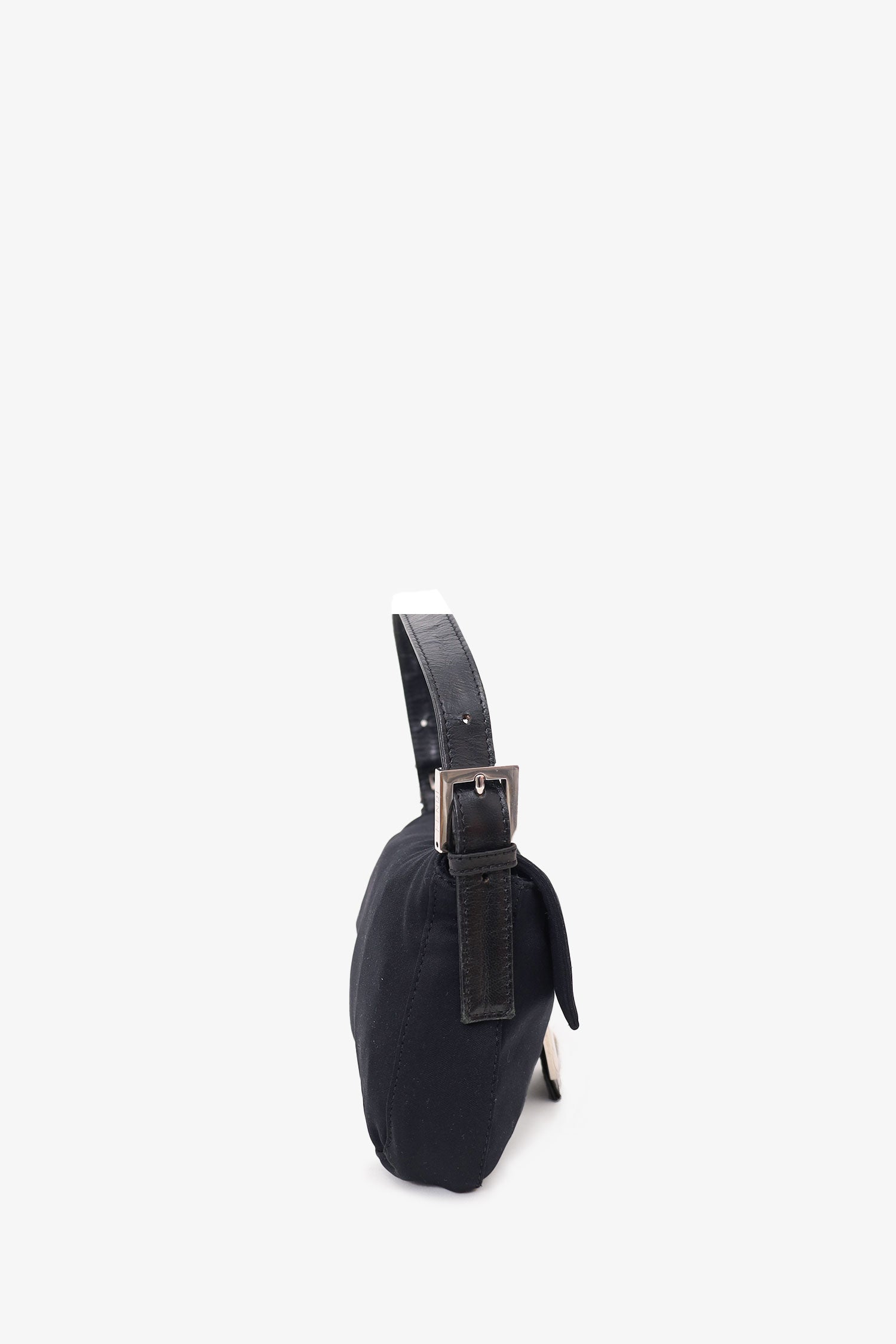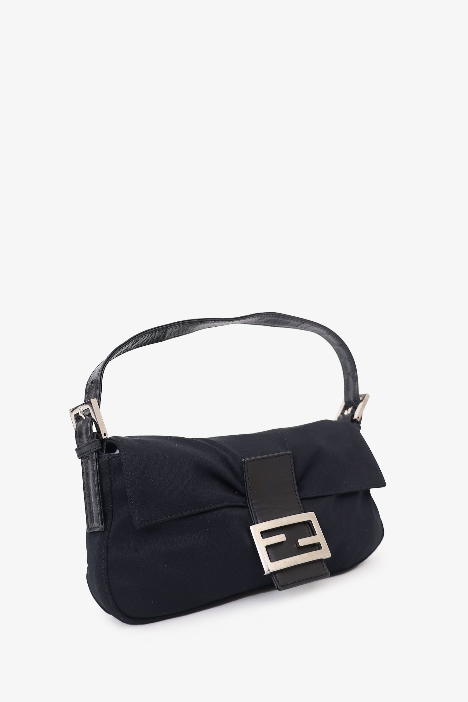 Refresh availabilityFendi Black Cotton Jersey FF Mamma Baguette. Fold-over flap with magnetic closure. Leather adjustable shoulder strap. Single interior zip compartment. Logo on interior hardware. Silver-tone hardware. Tonal stitching.