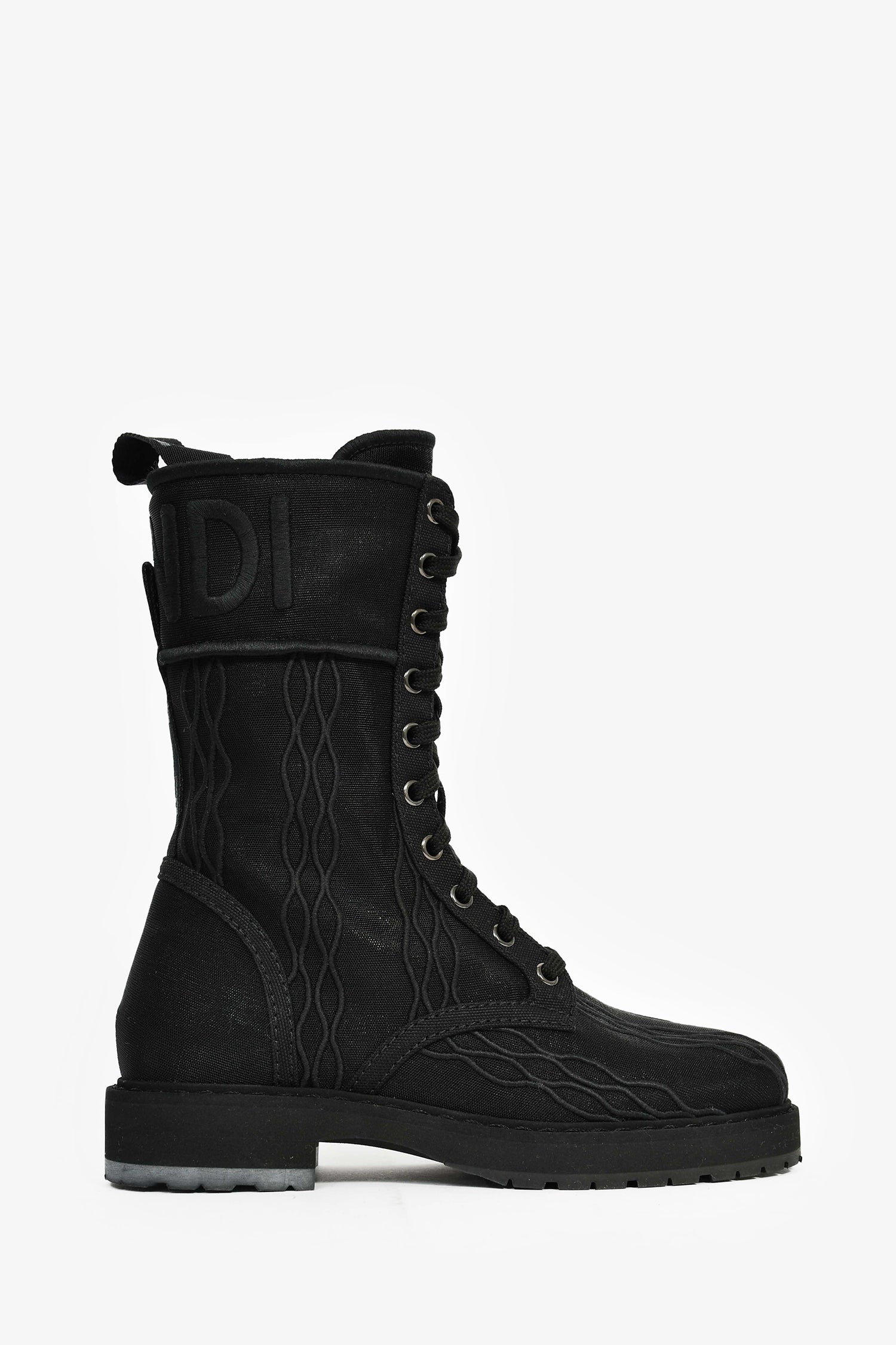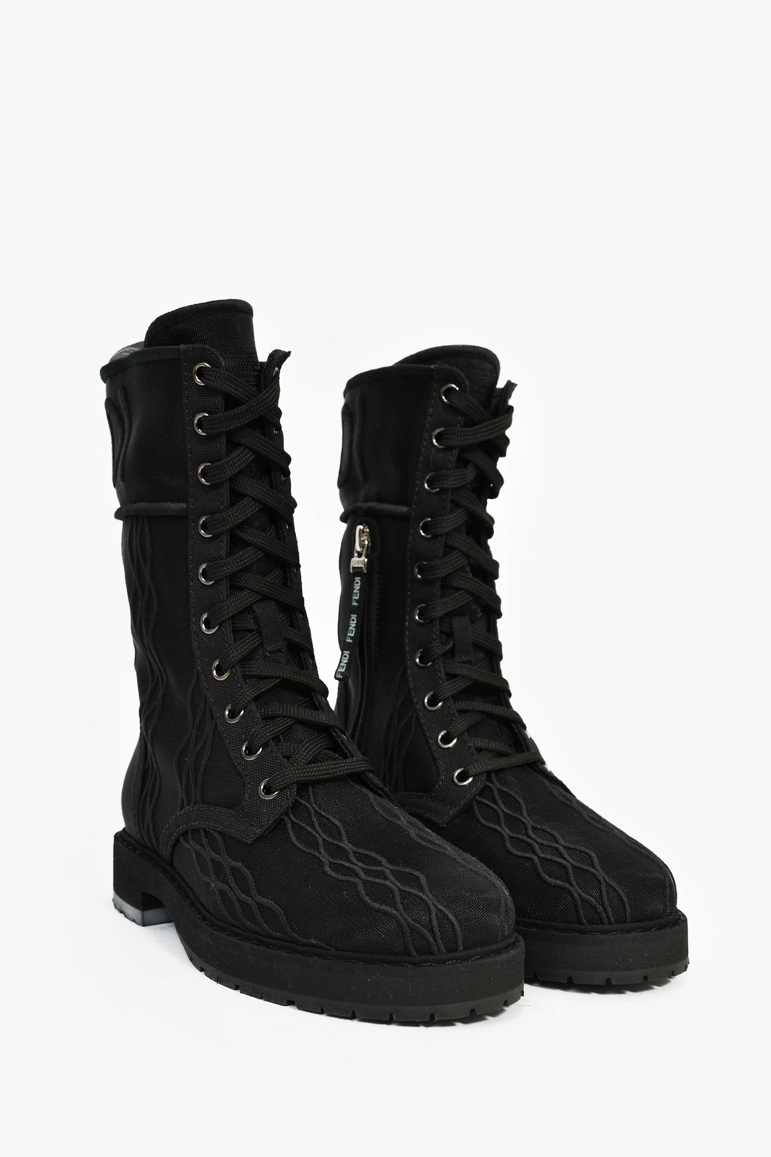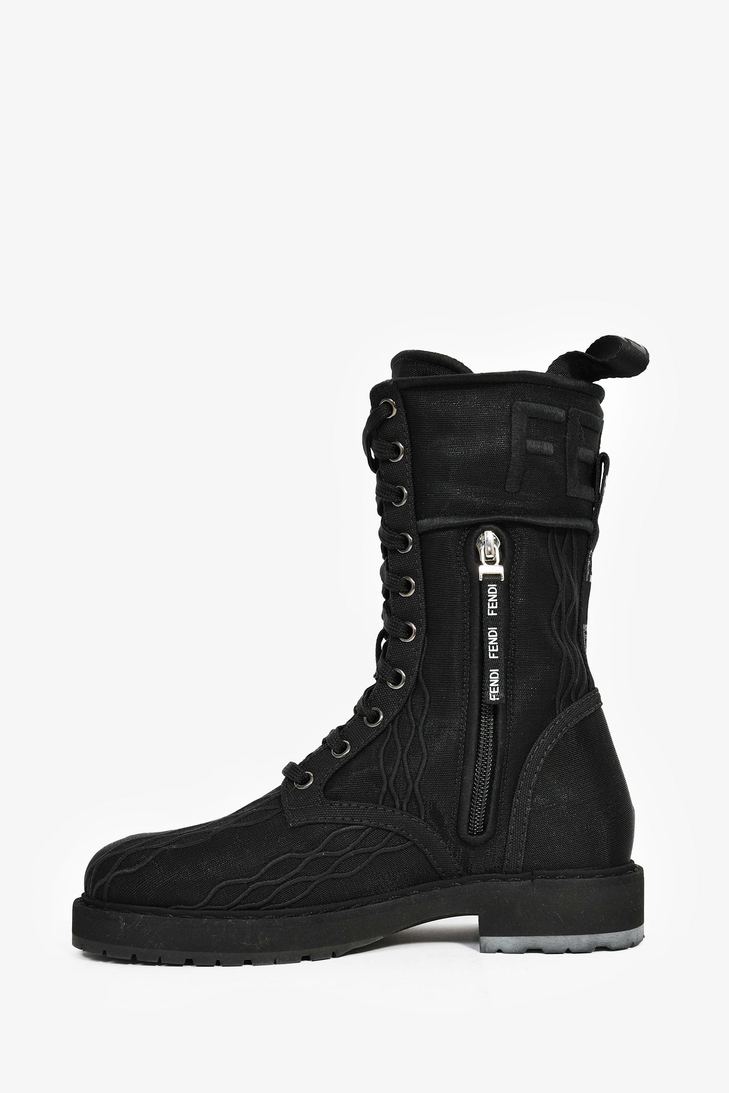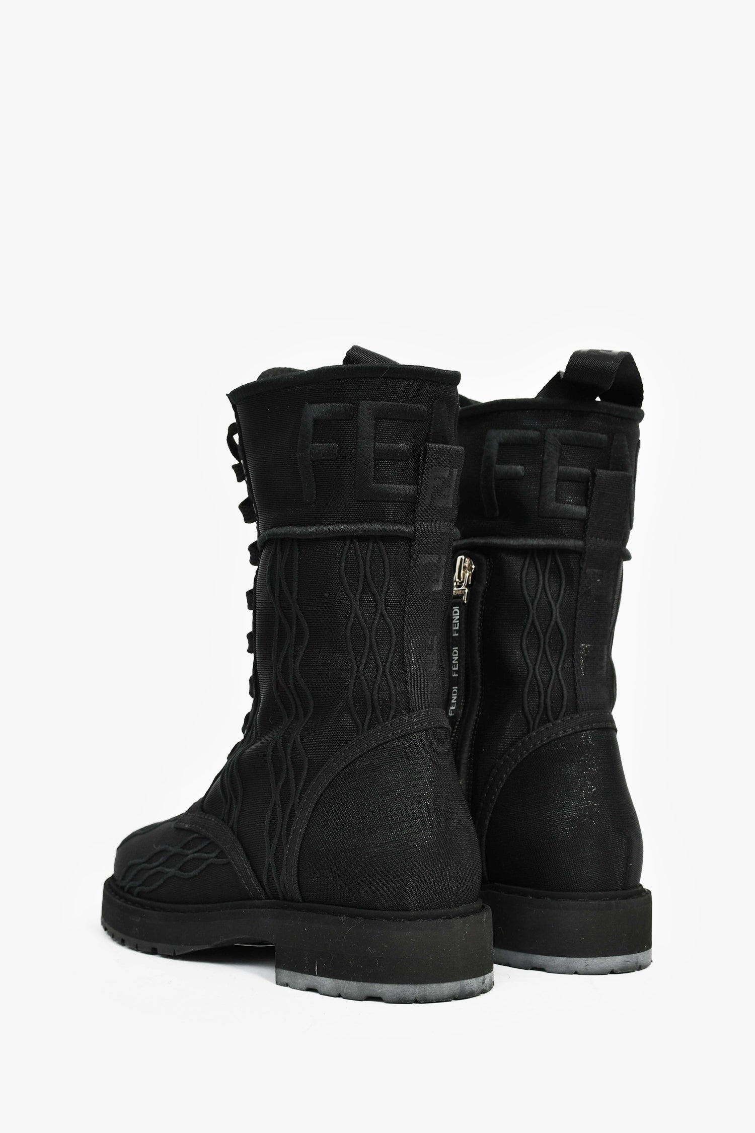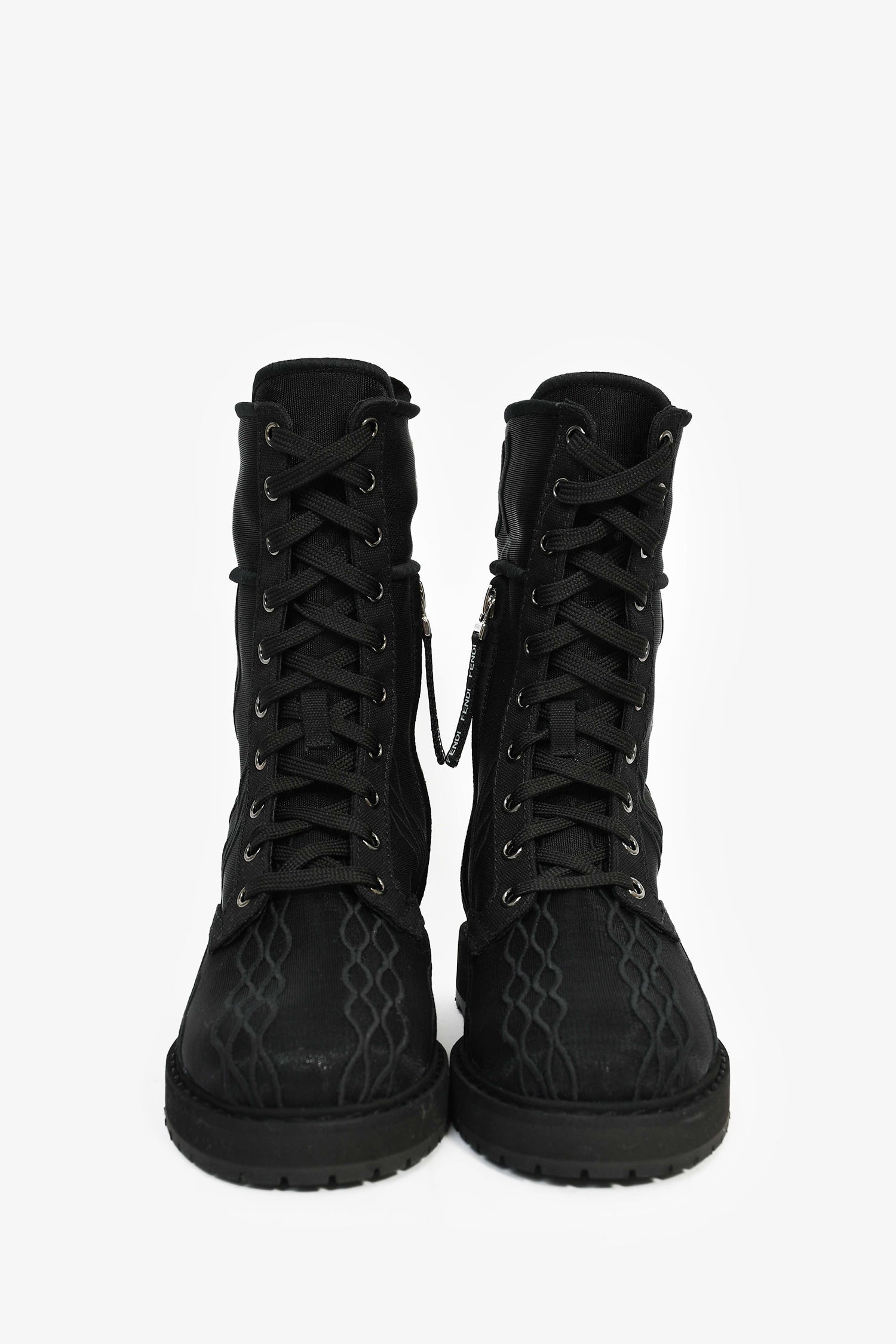 Refresh availabilityFendi Black Fabric Metallic Logo Combat Boots. Round toe. Side zip and front lace-up closure.