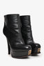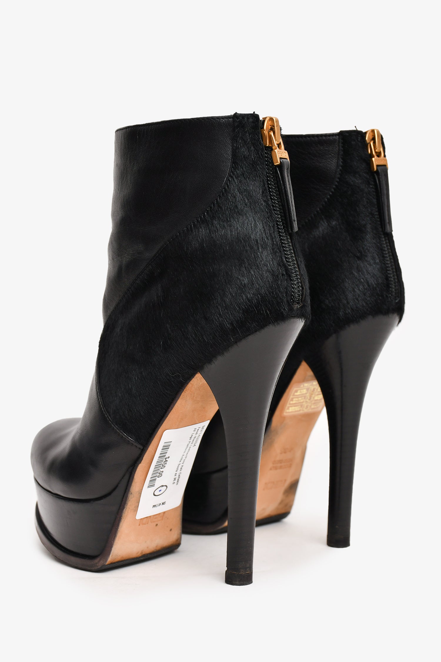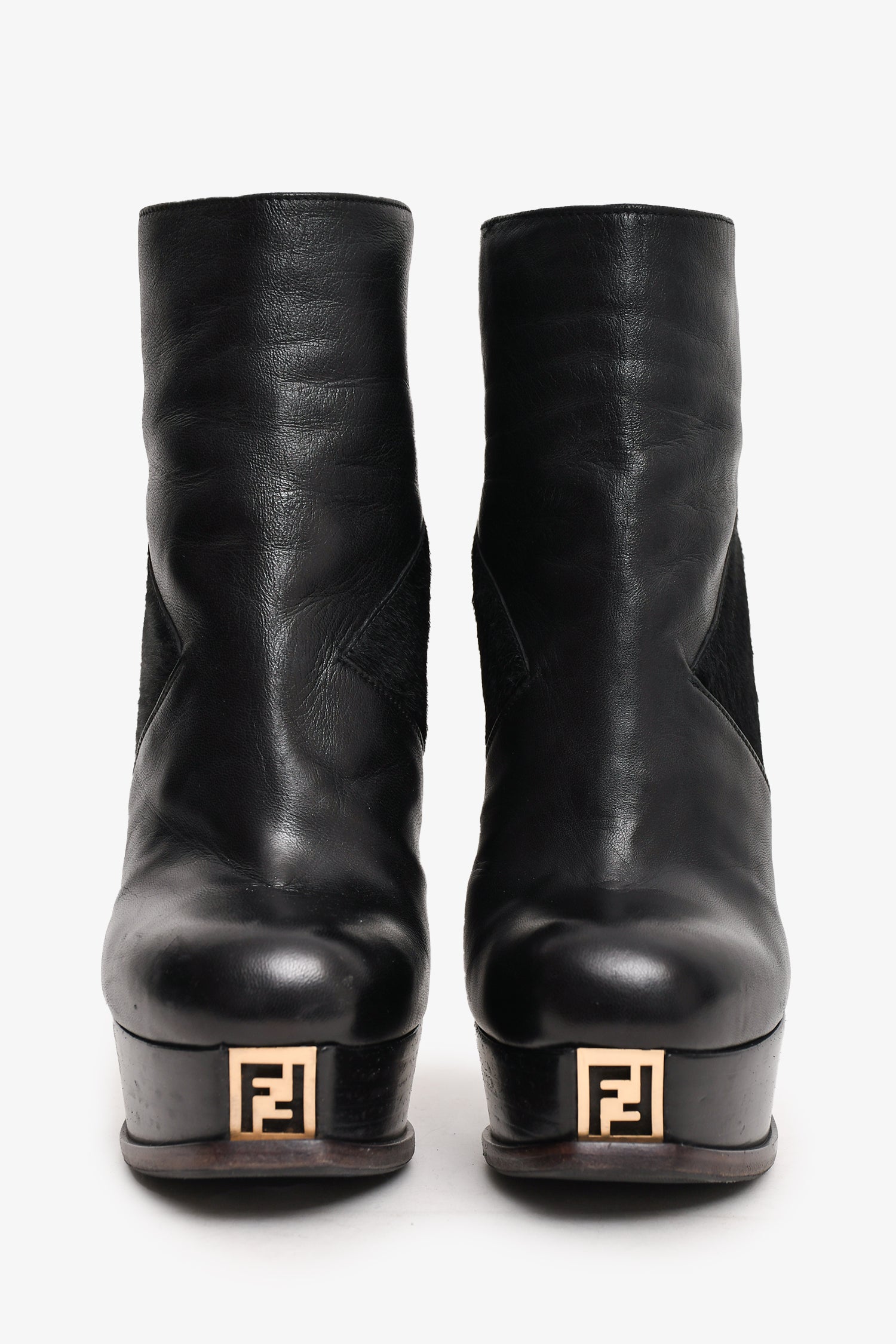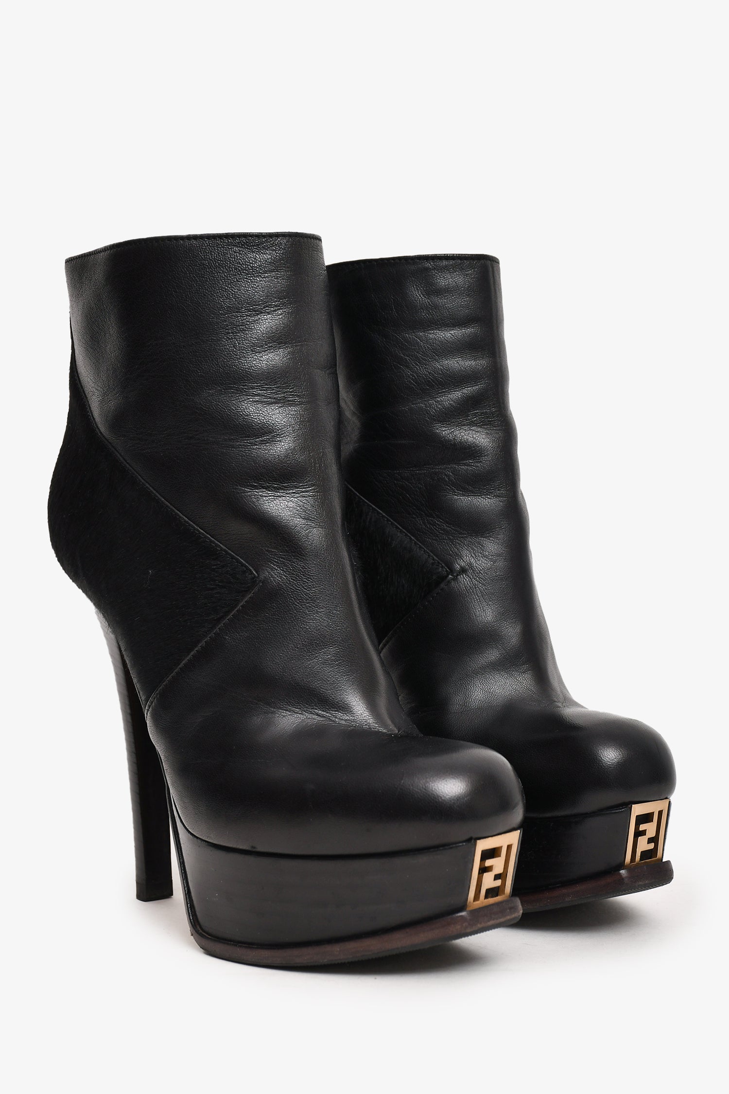 Refresh availabilityFendi Black Leather/Pony Hair Calfskin FF Logo Platform Ankle Boots. Back zipper closure. Platform heel. Gold-tone hardware. Tonal stitching.