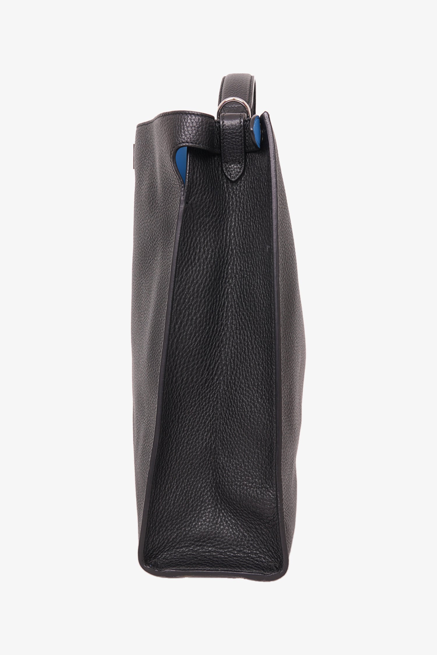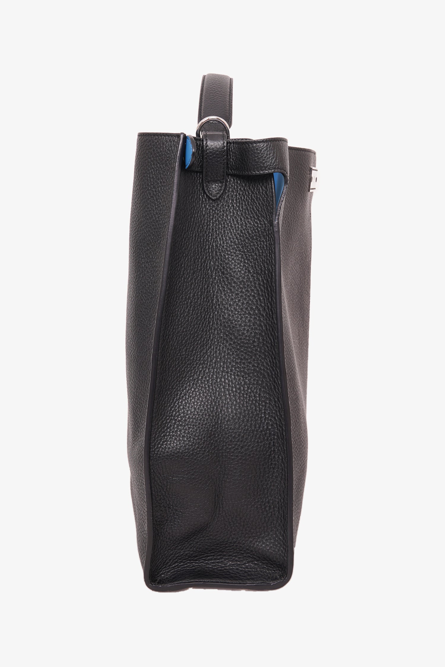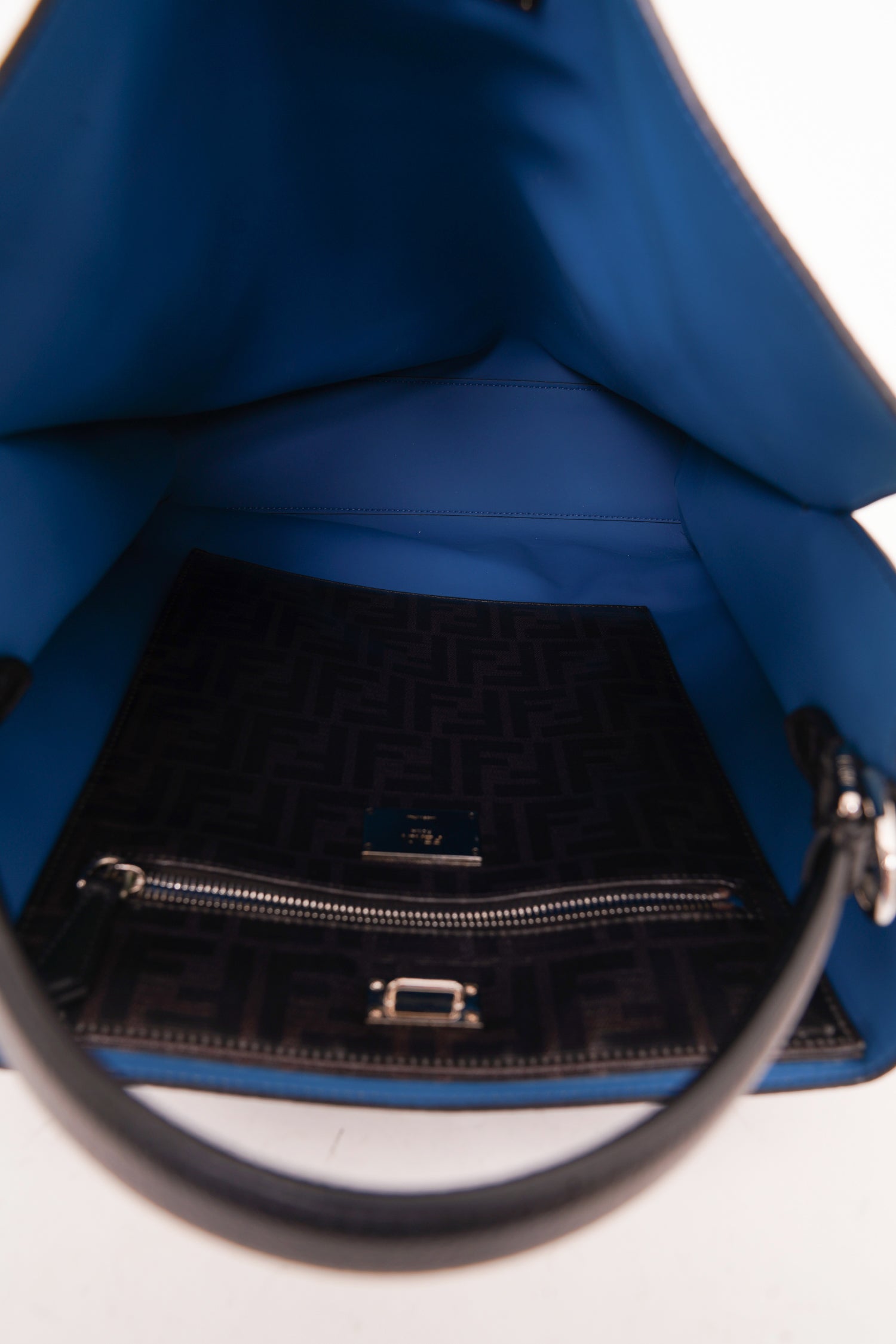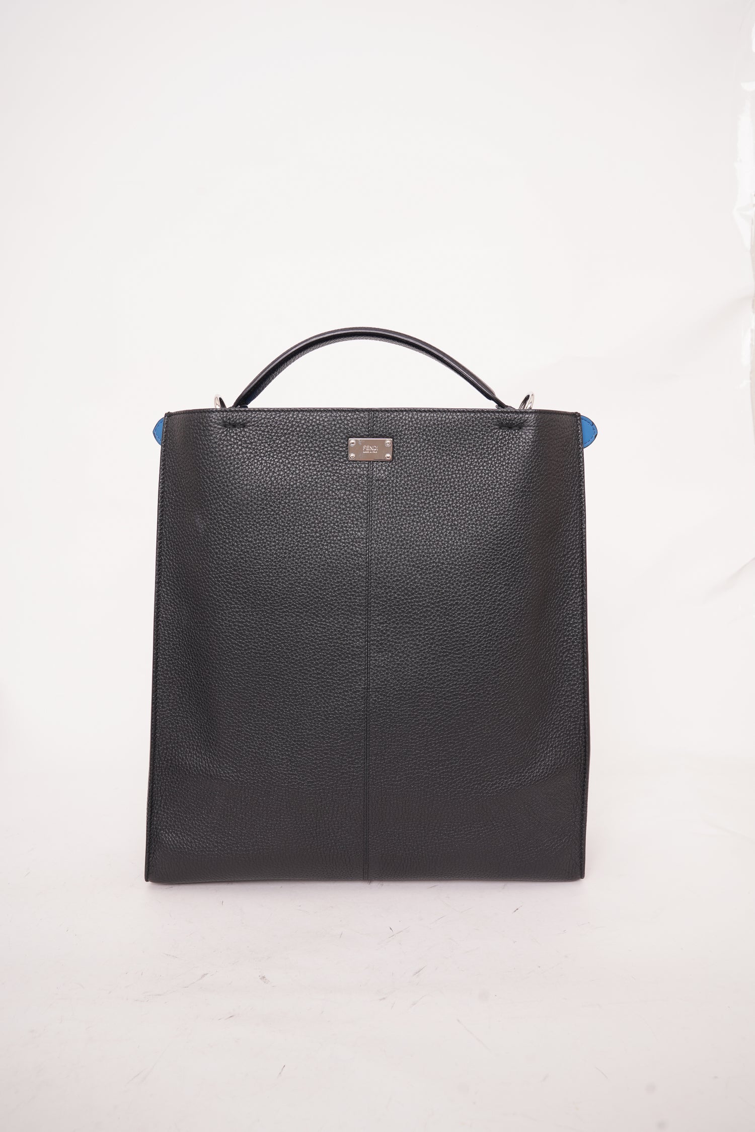 Fendi Black Leather Romano Peekaboo X-Lite Toto With Strap. Top hook closure. Blue interior lining. 1 interior zip pocket. Adjustable removable strap. Silver-tone hardware. Tonal stitching.