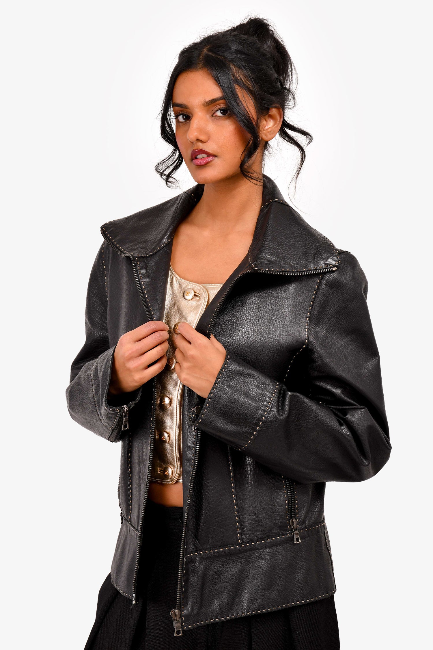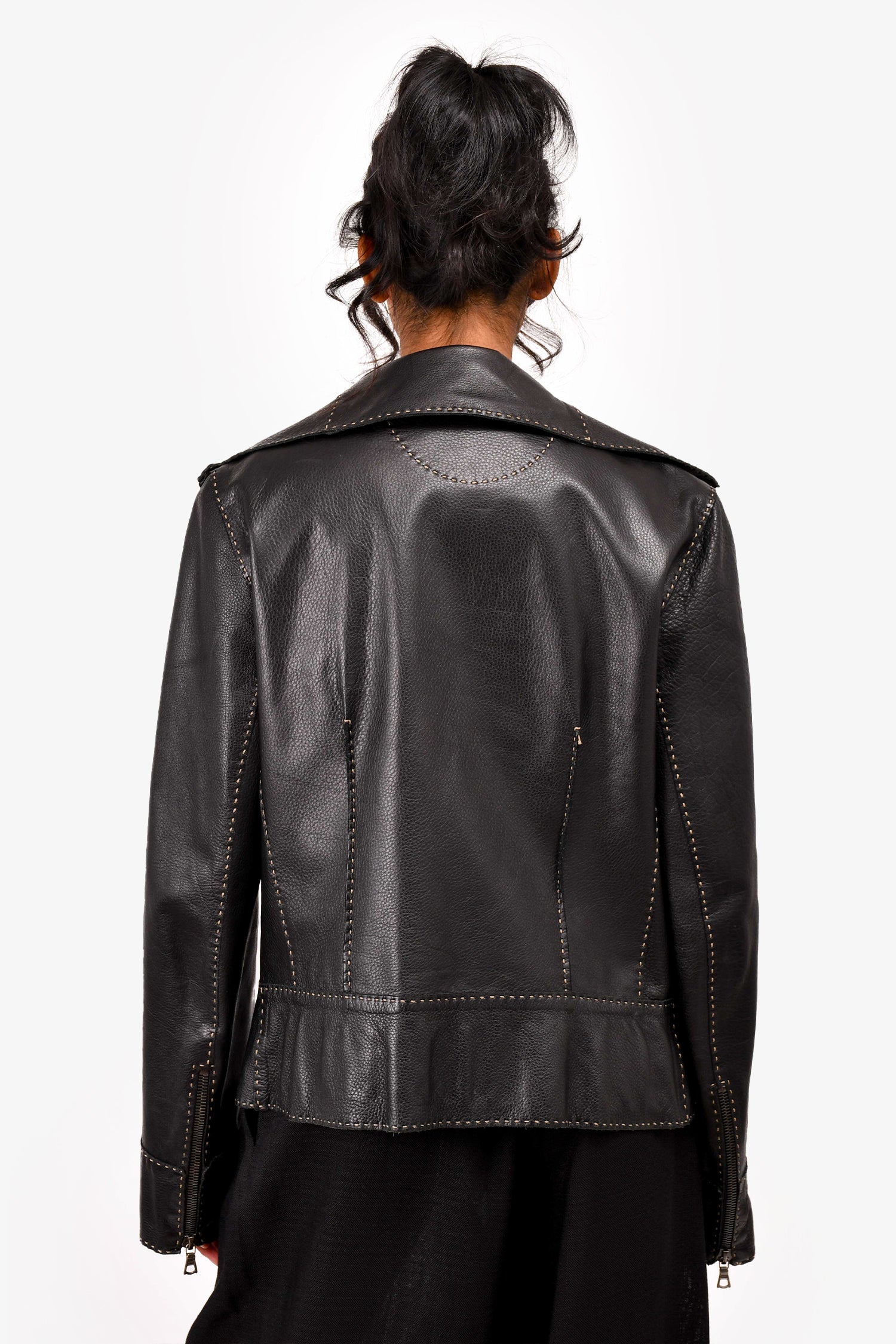 Refresh availabilityFendi Black Leather Selliar Stitch Detail Jacket. Contrast stitching. Side zipped pockets. Riri zipper.
