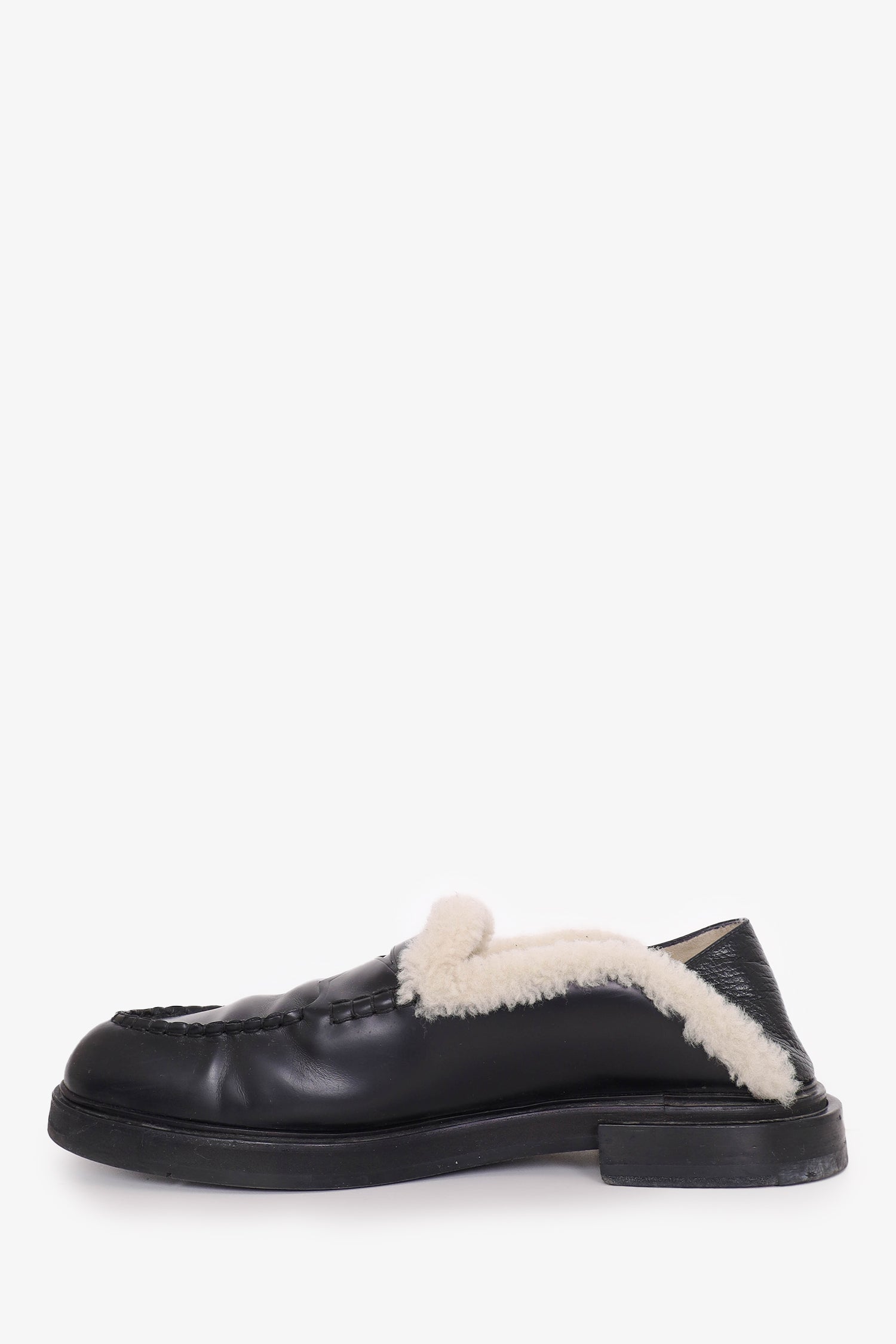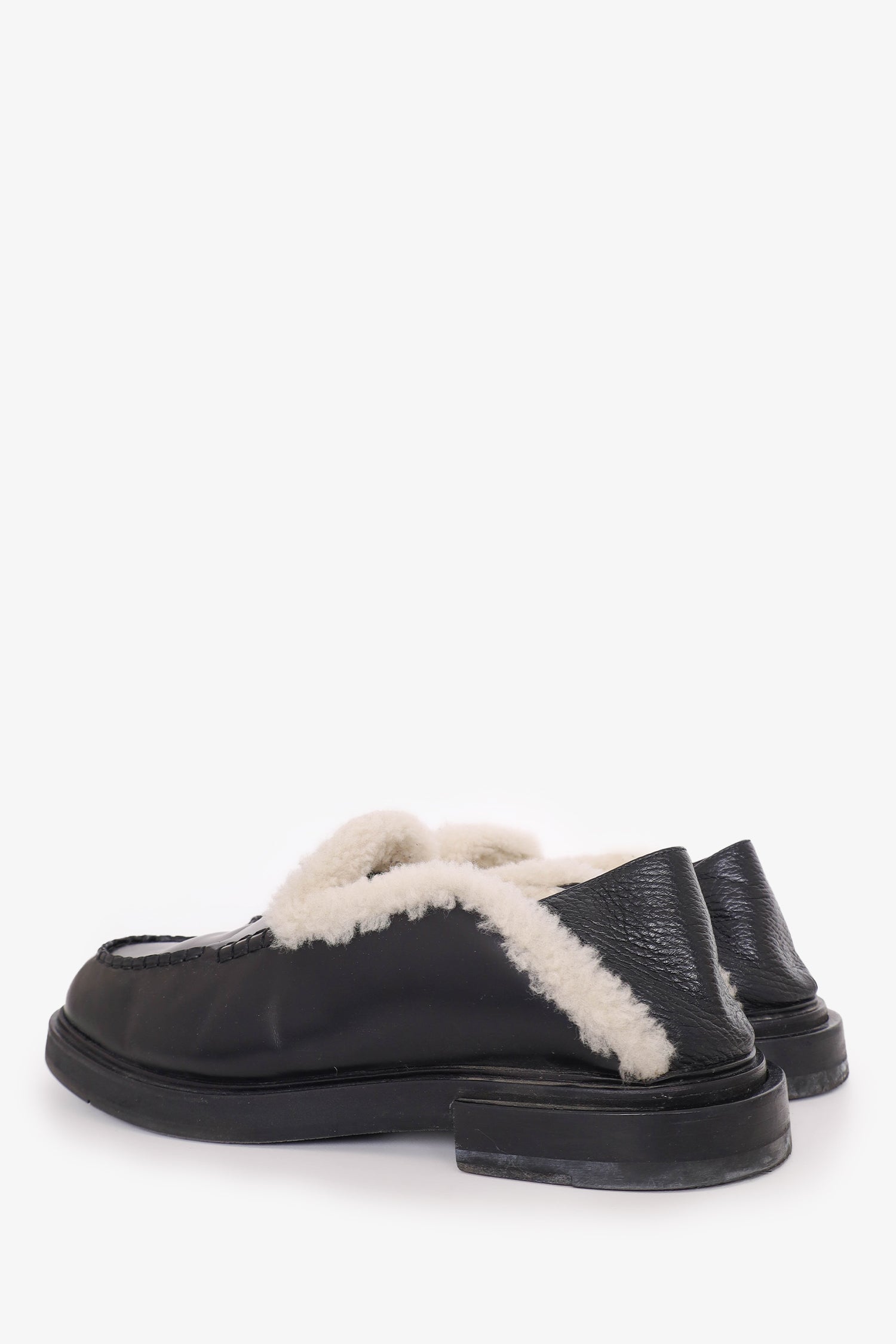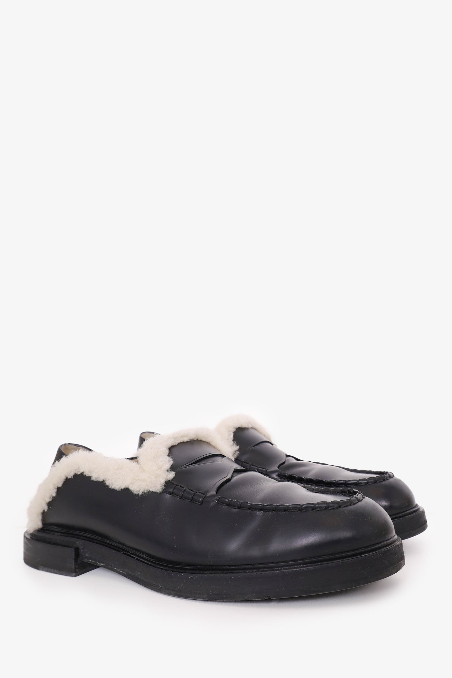 Refresh availabilityFendi Black Leather/Shearling Penny Slip-On Loafers. Round toe. Tonal stitching.