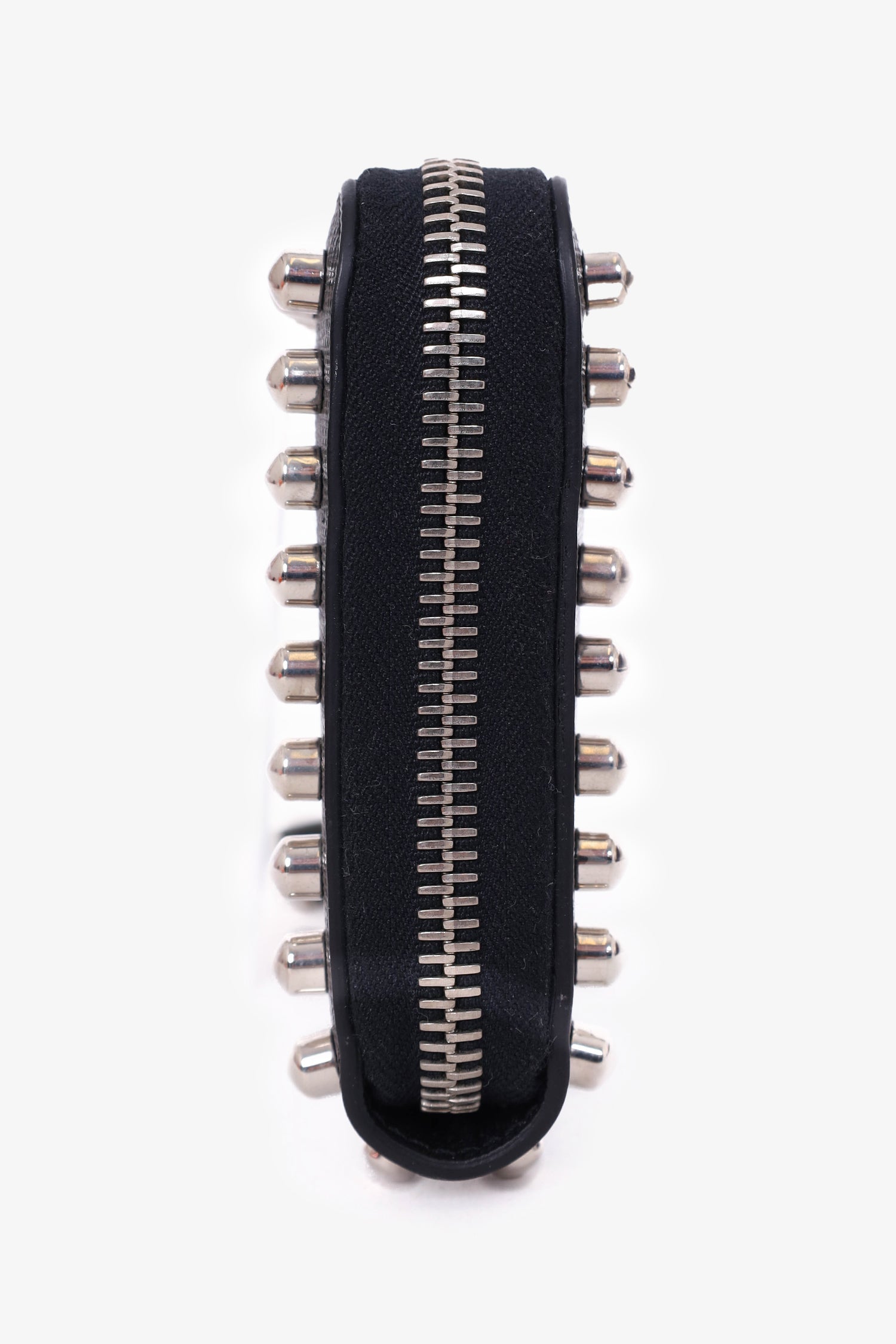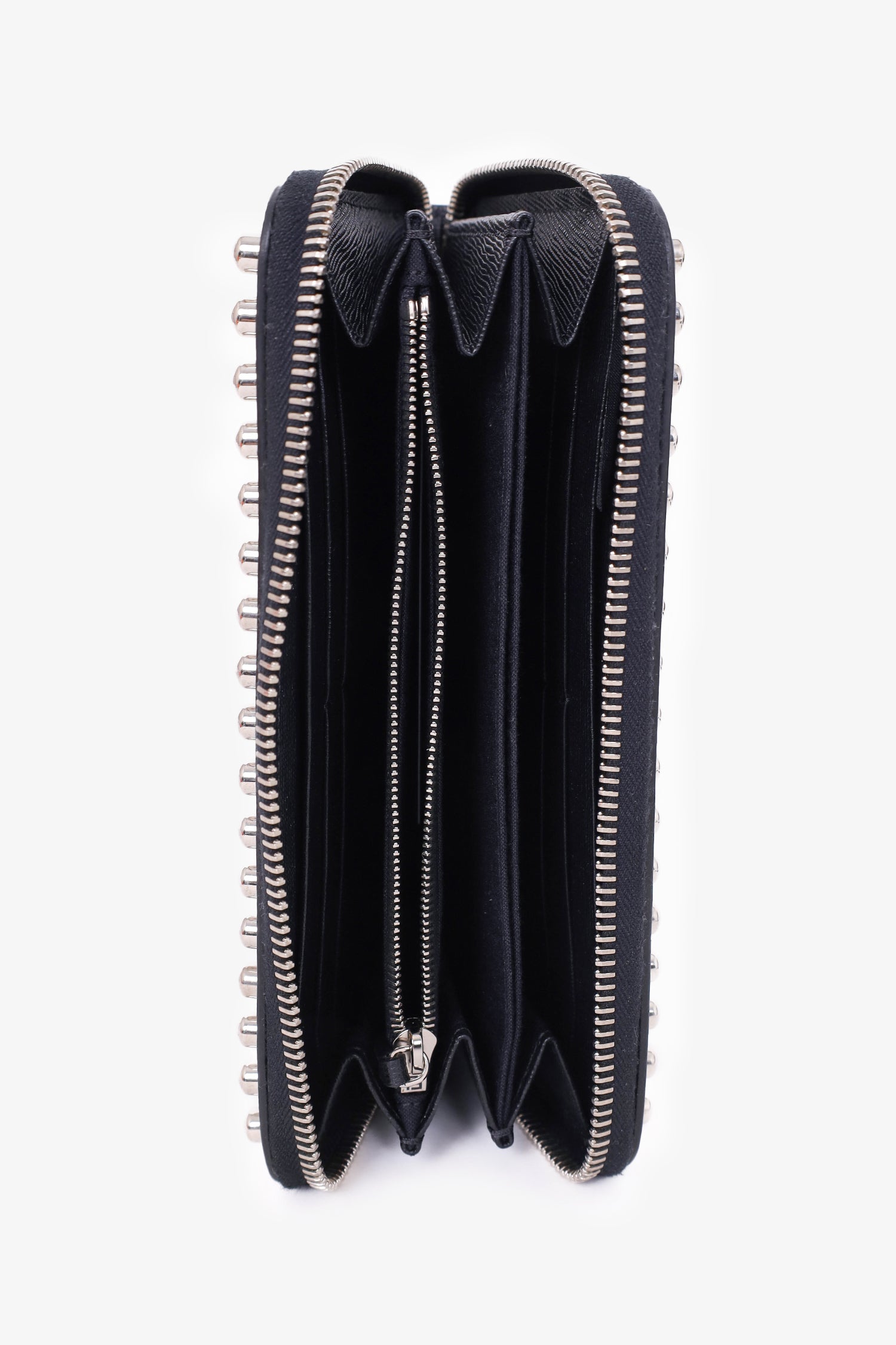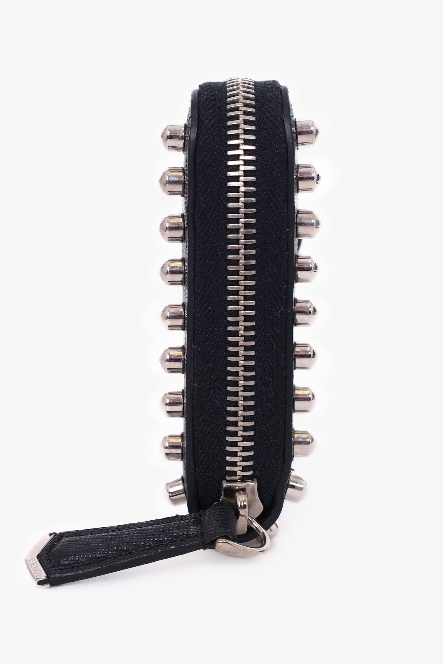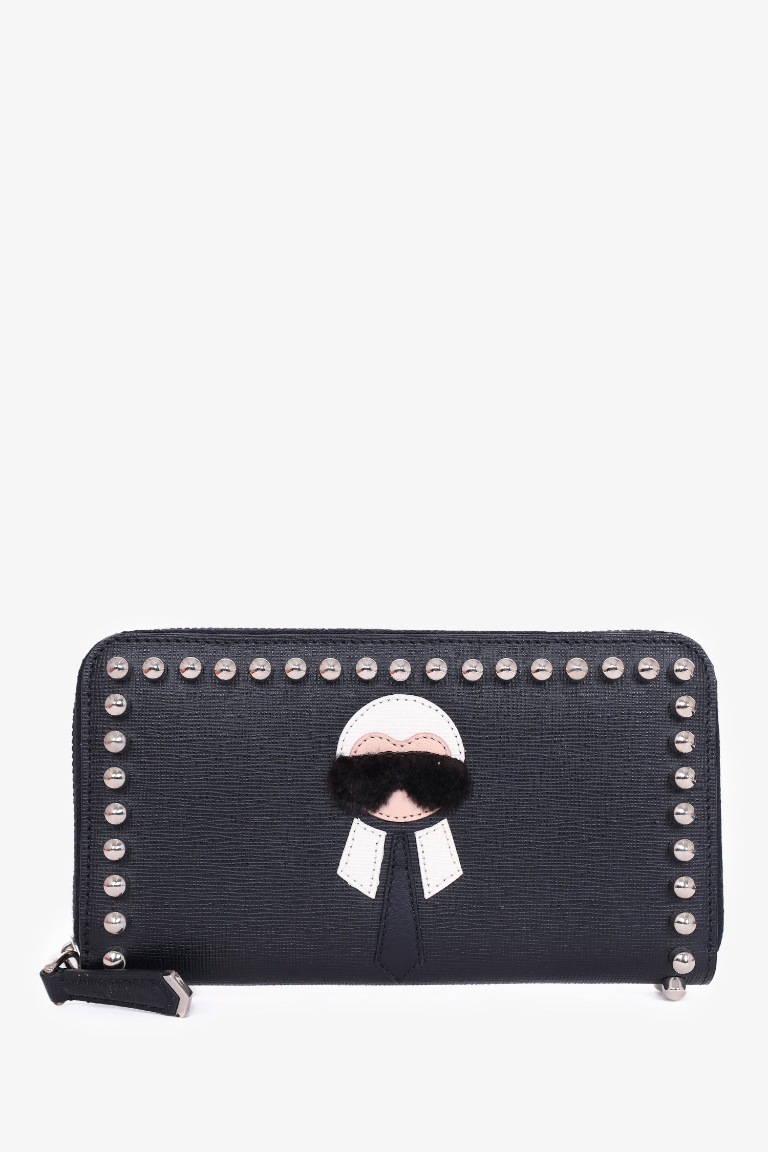 Refresh availabilityFendi Black Leather Studded Karlito Continental Wallet. Zipper closure. 8 interior card slips. 3 interior slip pockets. 1 interior zip pocket. Silver-toned stud detailing. Karl Lagerfeld design on front. Tonal stitching.