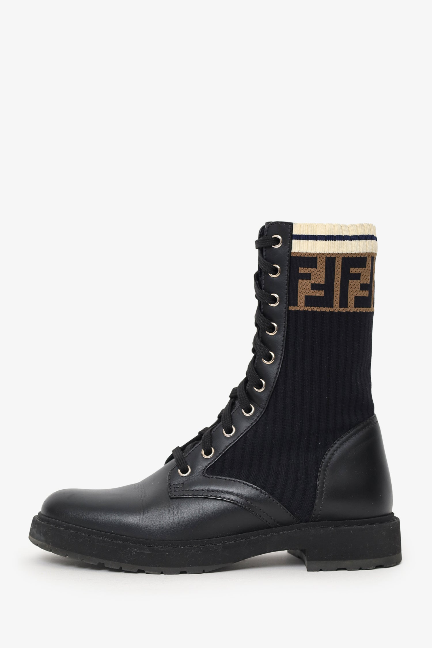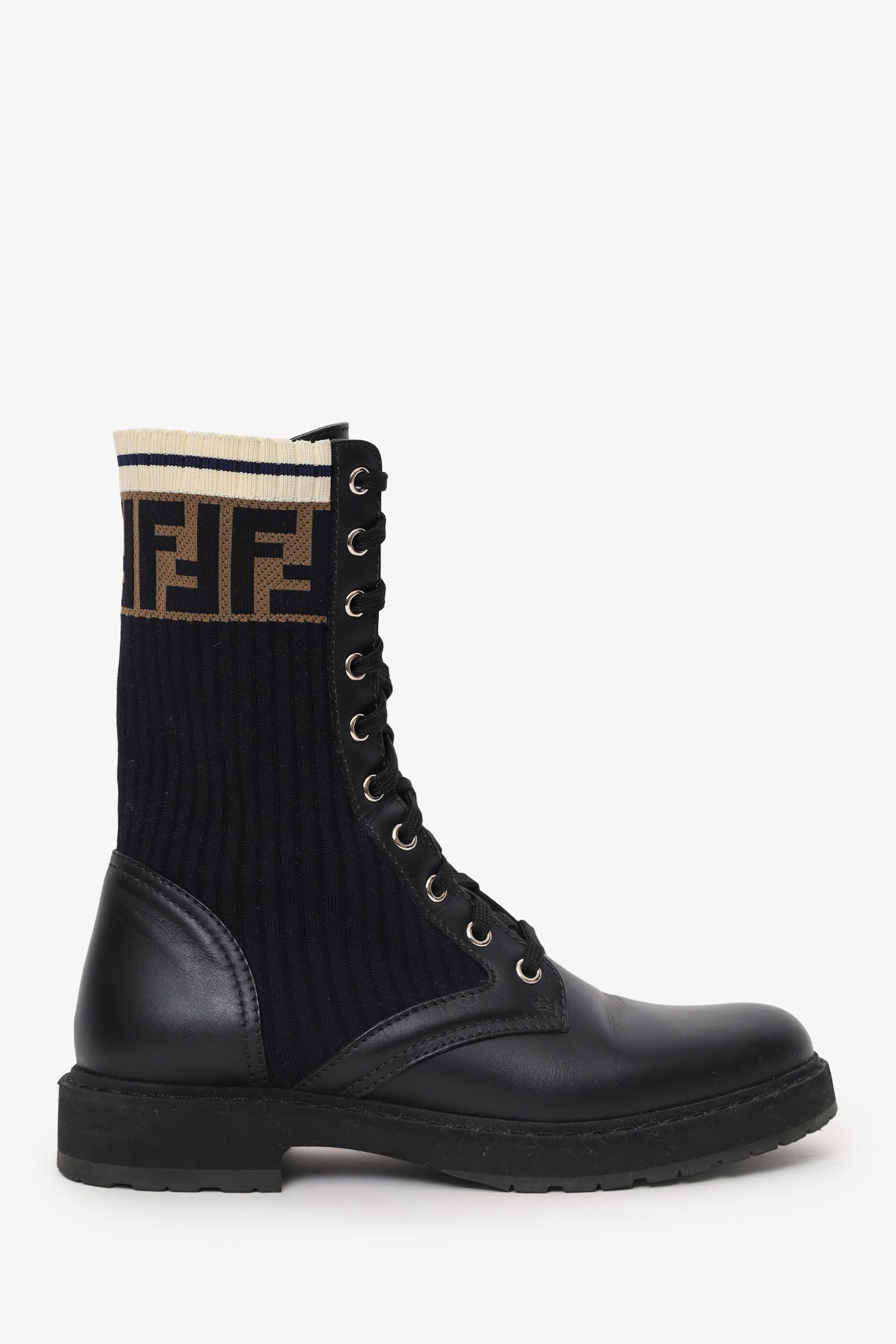 Refresh availabilityFendi Black Leather Zucca Stretch Knit Combat Boots. Pull-on. Almond toe. Front lace-up closure. Silver-tone hardware. Tonal stitching.