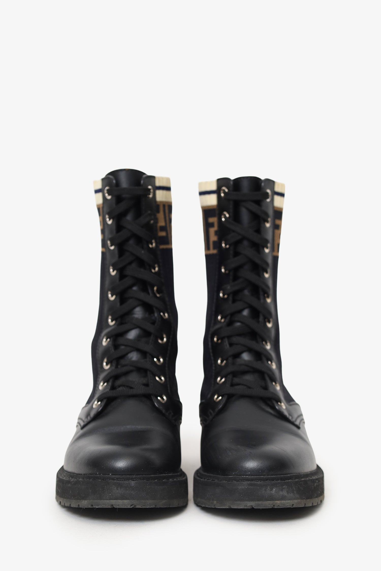 Fendi Black Leather Zucca Stretch Knit Combat Boots Size 38