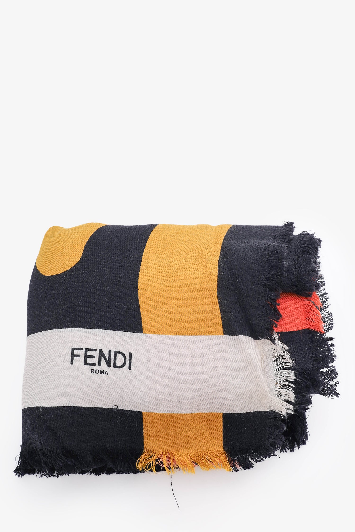 Refresh availabilityFendi Black/Multicolour Silk/Wool Logo Print Scarf. Frayed hem. Tonal stitching.