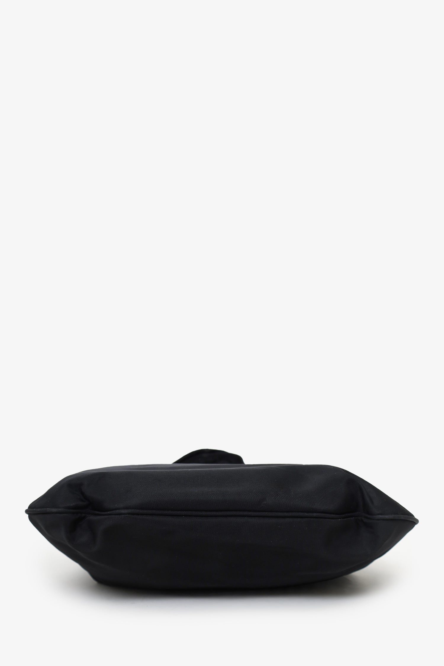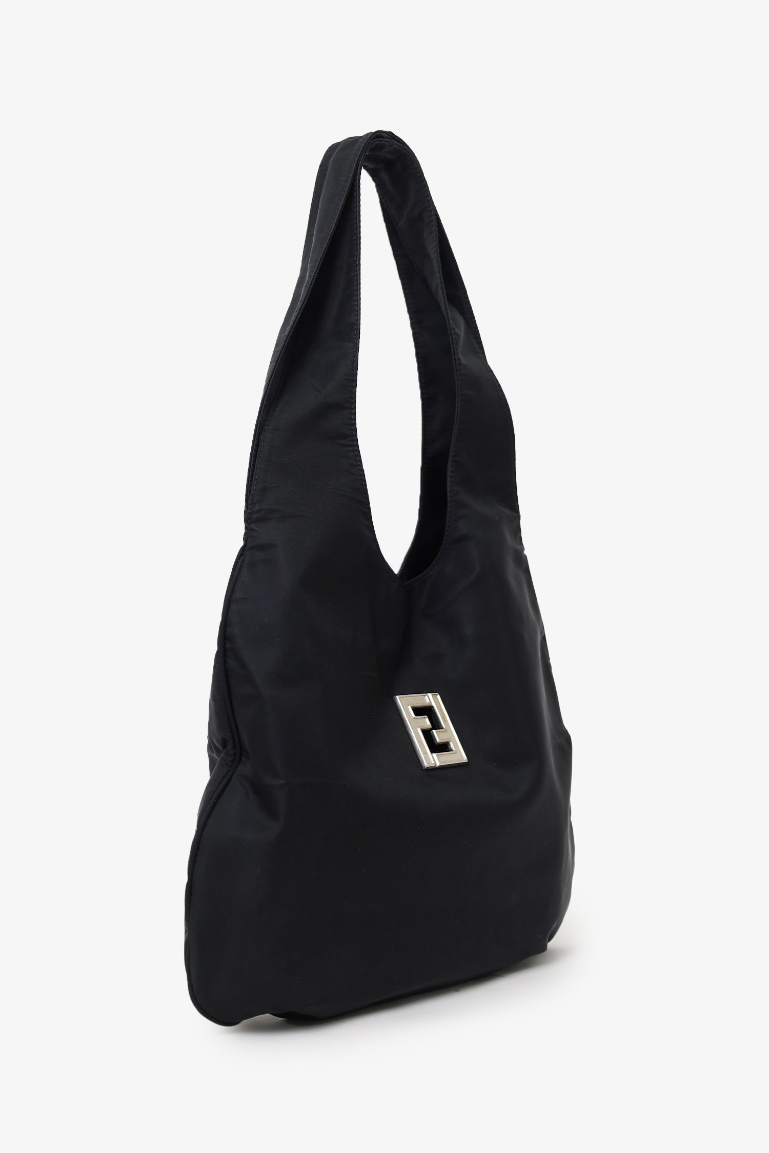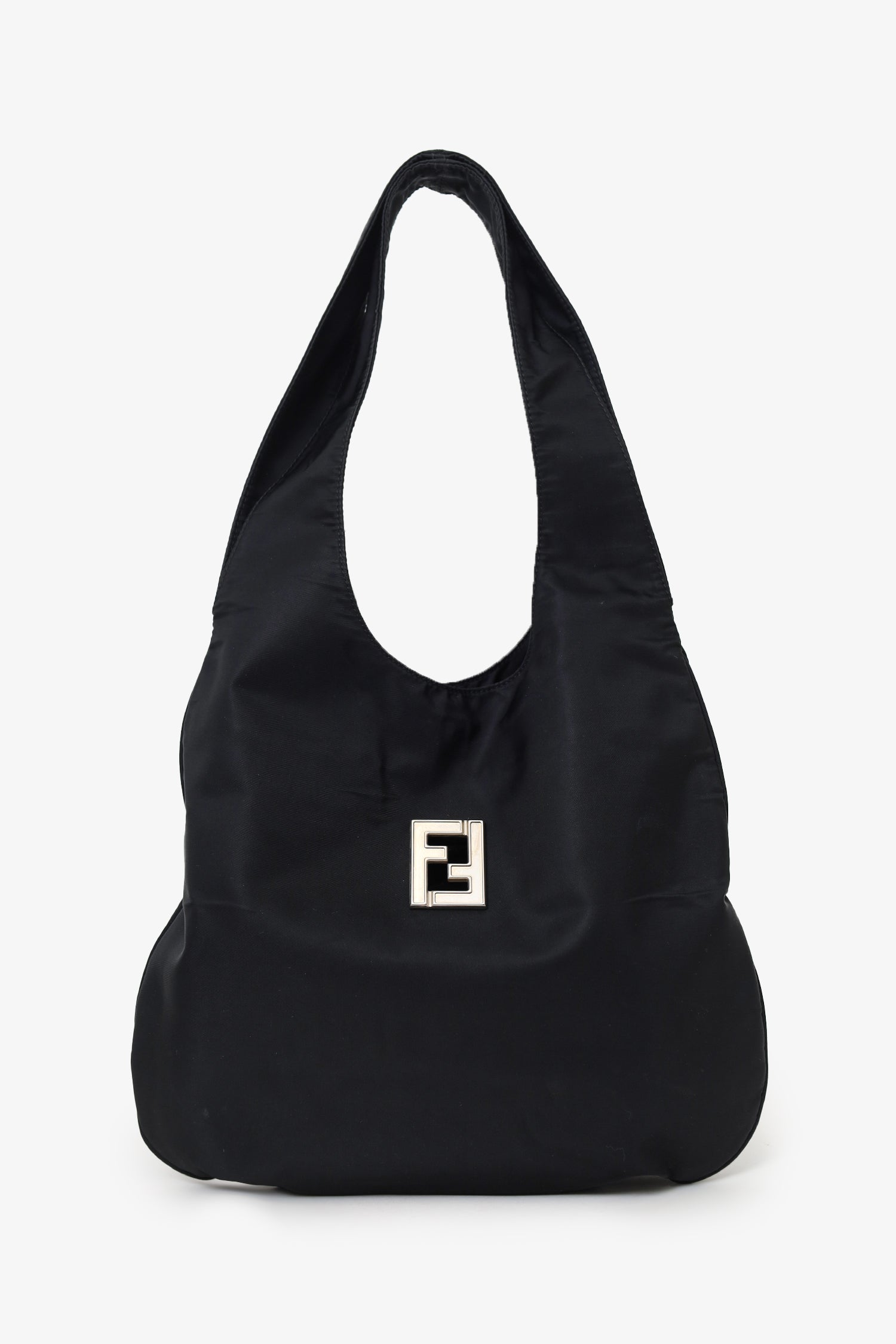 Refresh availabilityFendi Black Nylon FF Hobo Shoulder Bag. Magnetic closure at top. Dual shoulder straps. Fabric-lined interior. Single interior zip pocket. Silver-tone hardware. Tonal stitching.