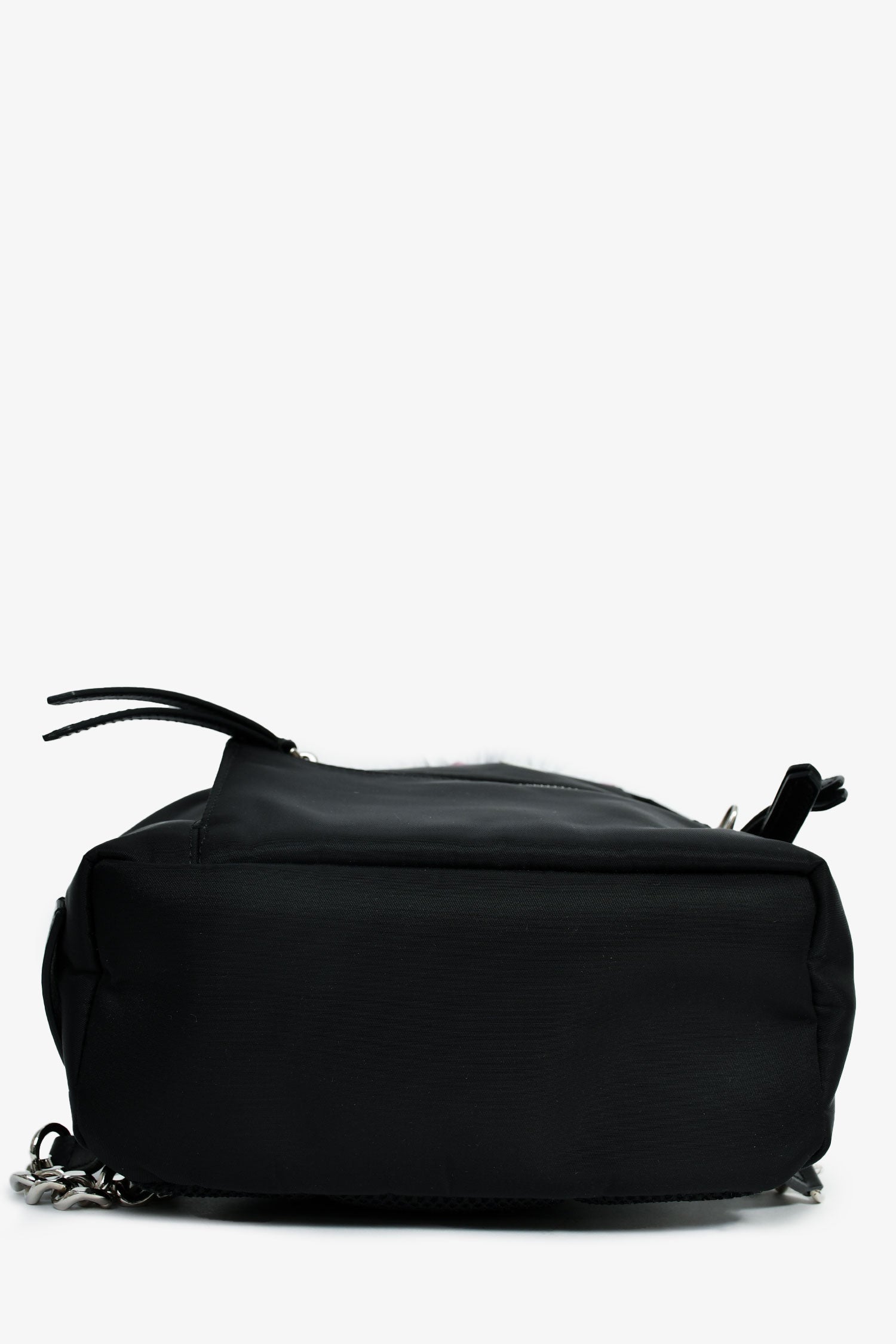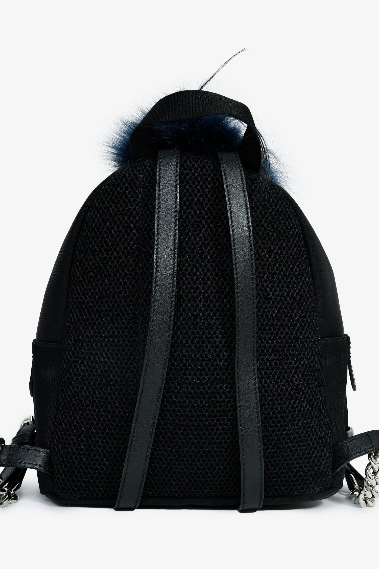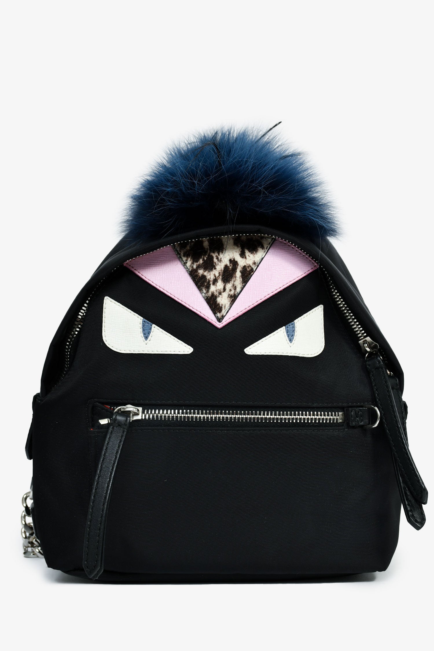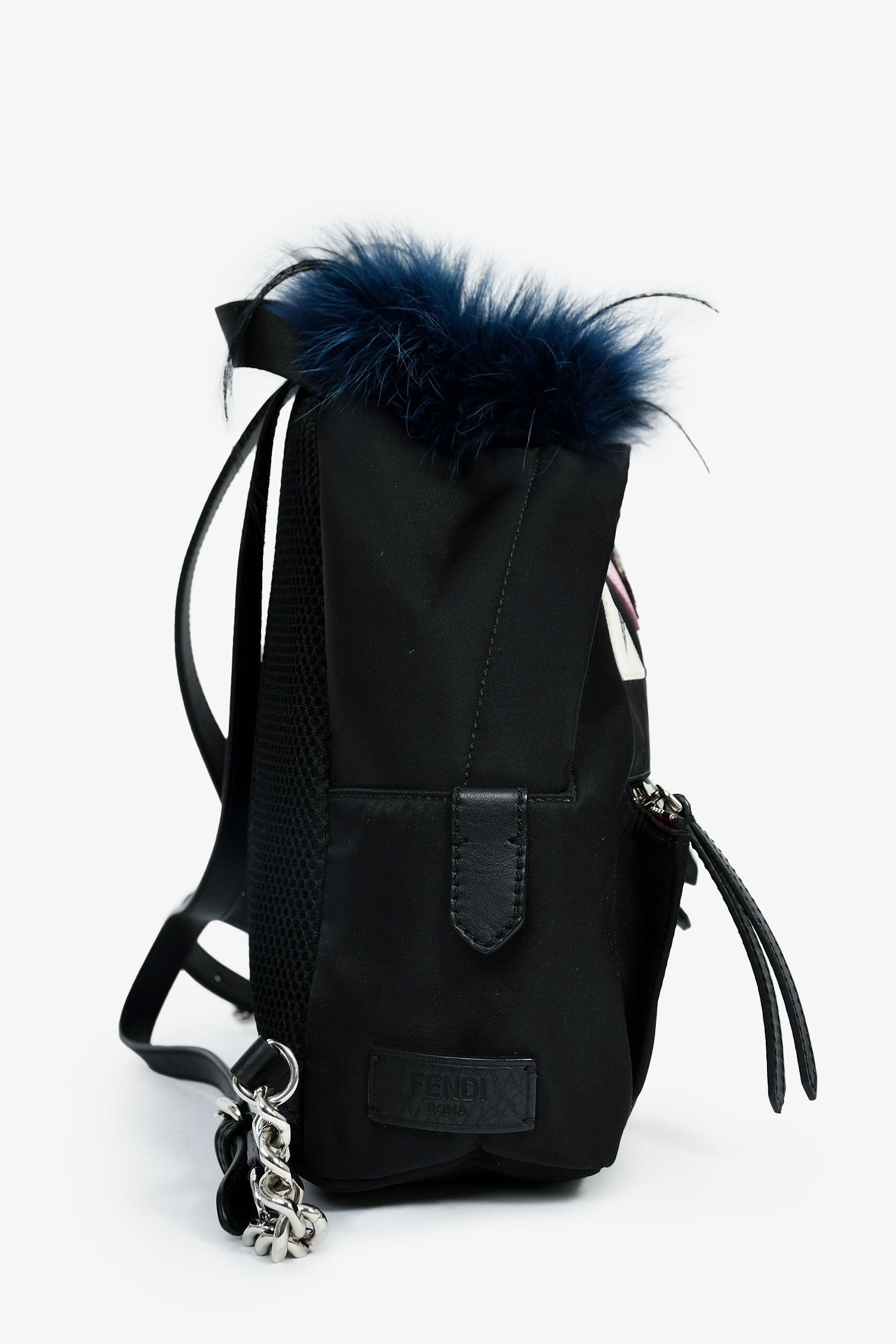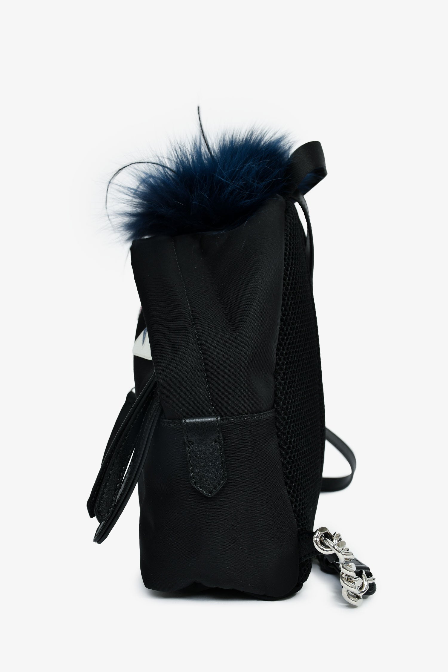 Refresh availabilityFendi Black Nylon Mini Monster Backpack. Top zip closure. 2 leather shoulder straps with chain-link detail. Single exterior zipped compartment. Nylon exterior with leather and fur trim. Lined canvas interior with a zipped compartment. Silver-tone hardware. Tonal stitching.