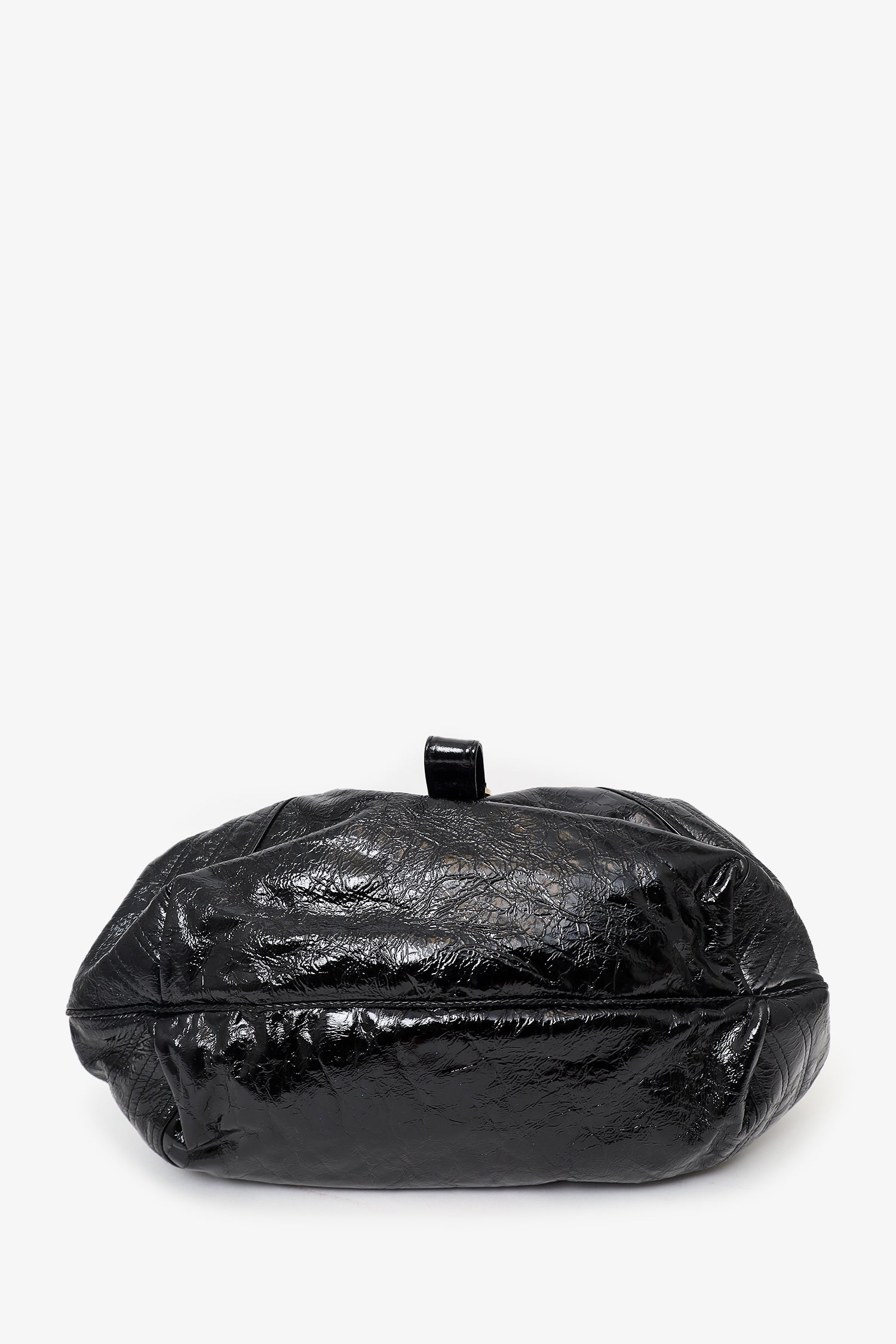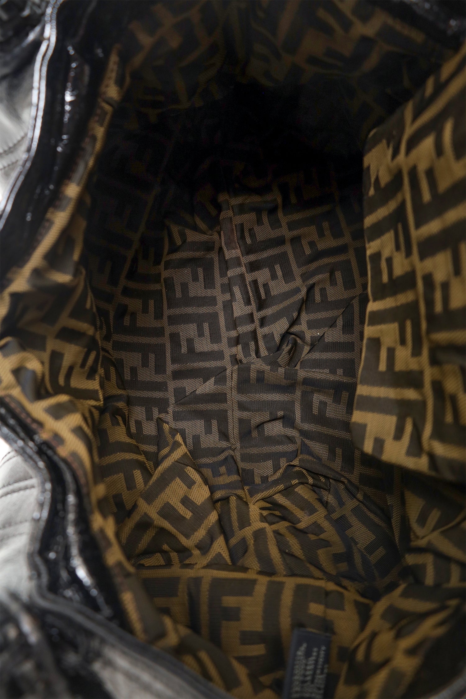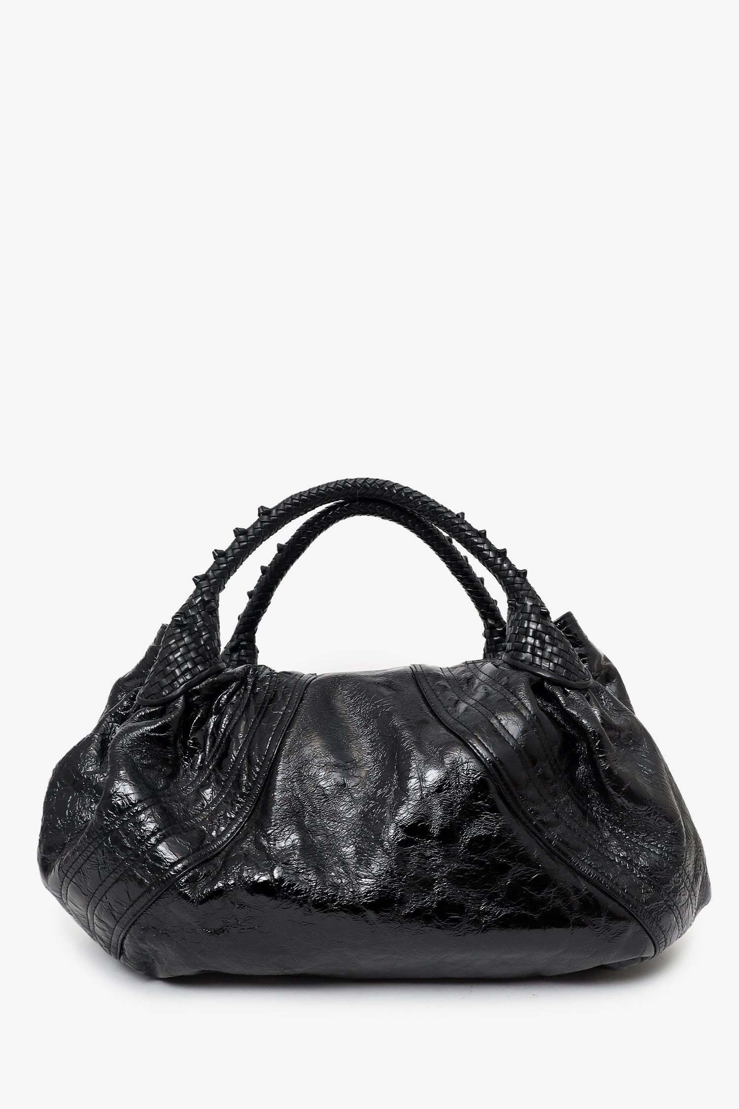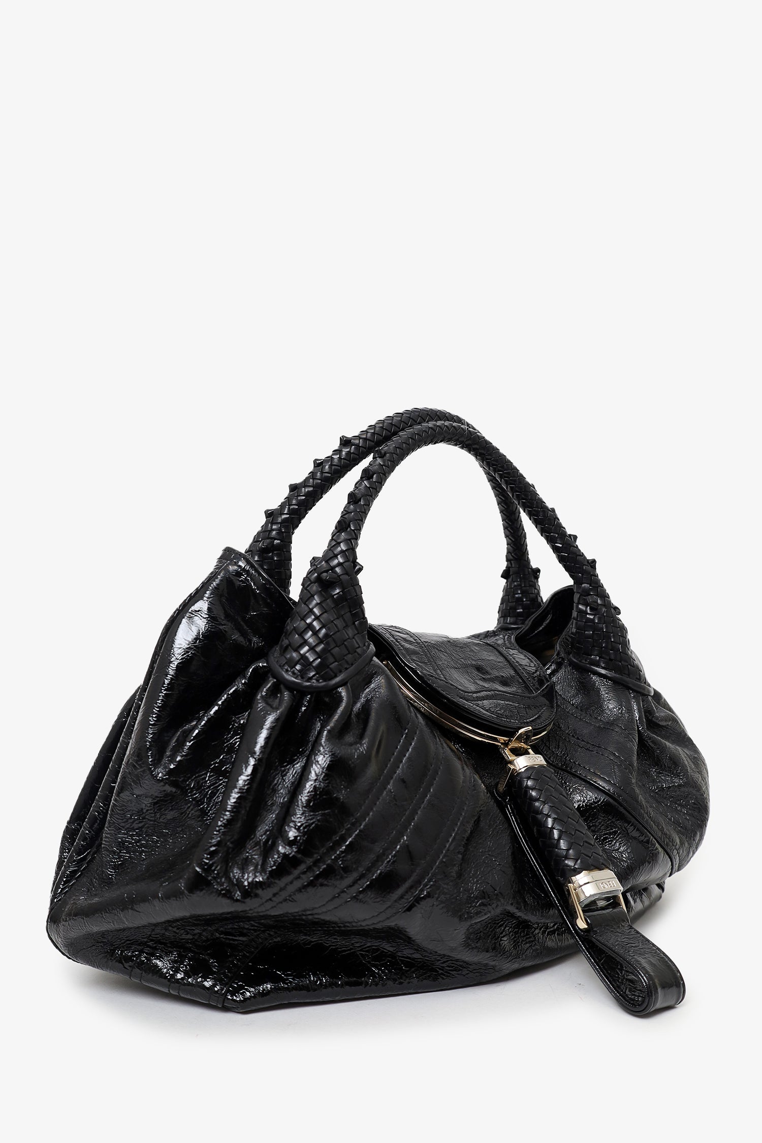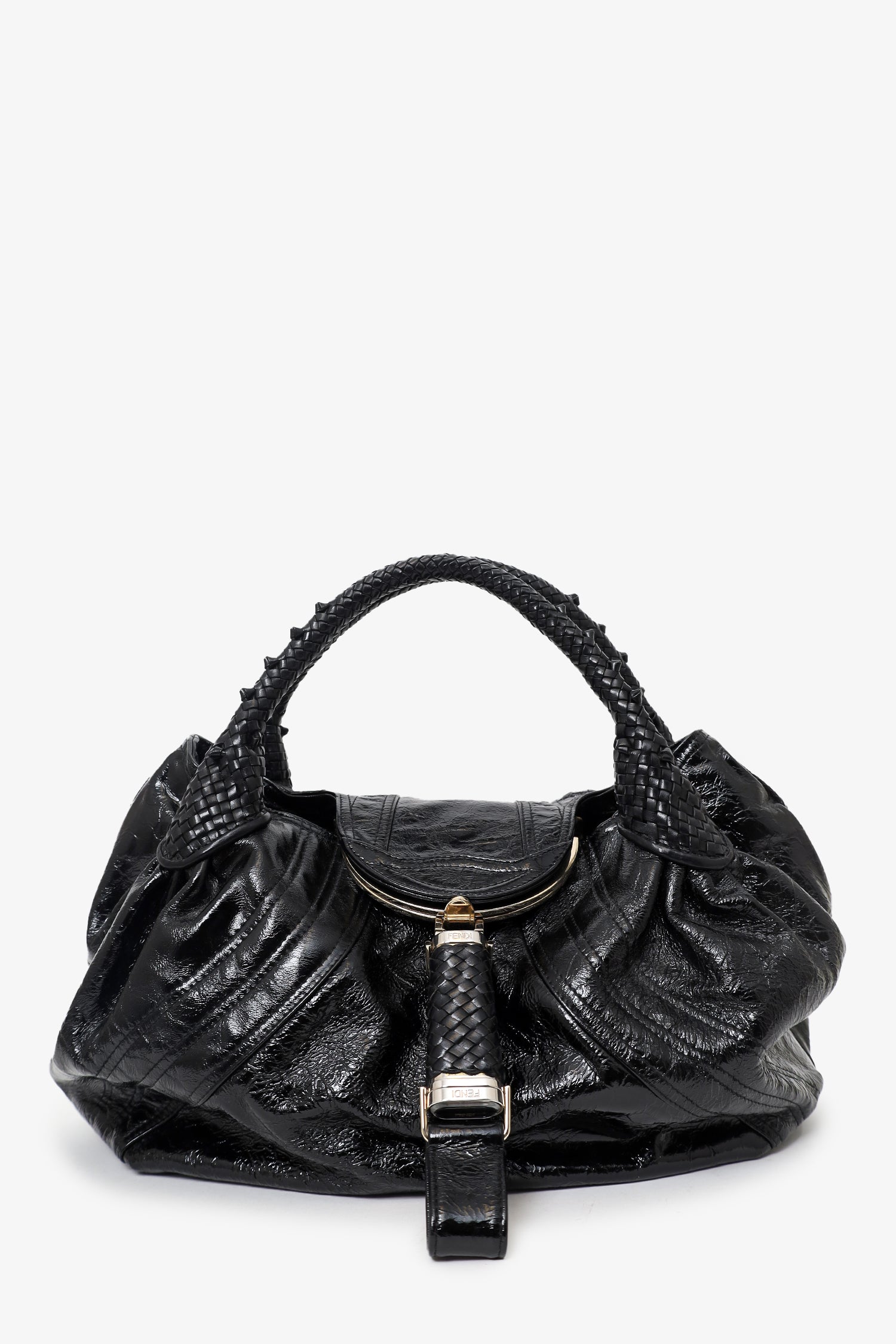 Refresh availabilityFendi Black Patent Pattern Leather Vintage Woven Spy Bag. Front fold-over flap. Twin shoulder straps. Pocket within fold-over flap with clasp closure. Lined interior. Gold-tone hardware. Tonal stitching.