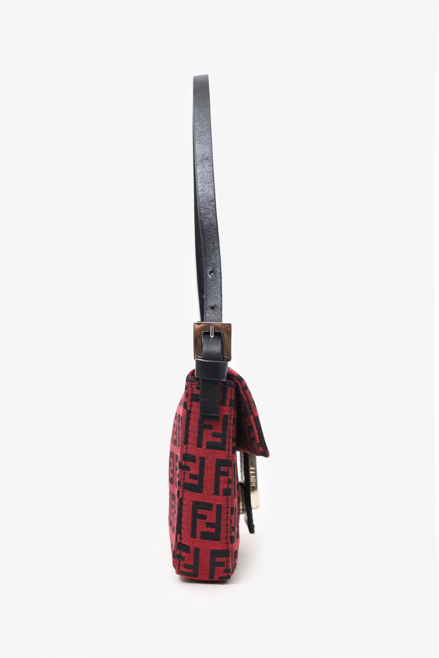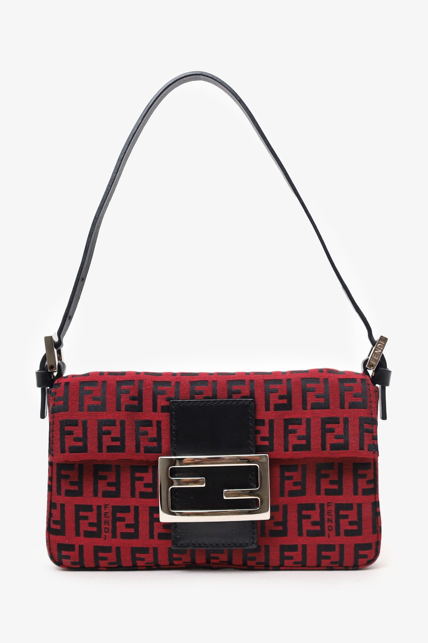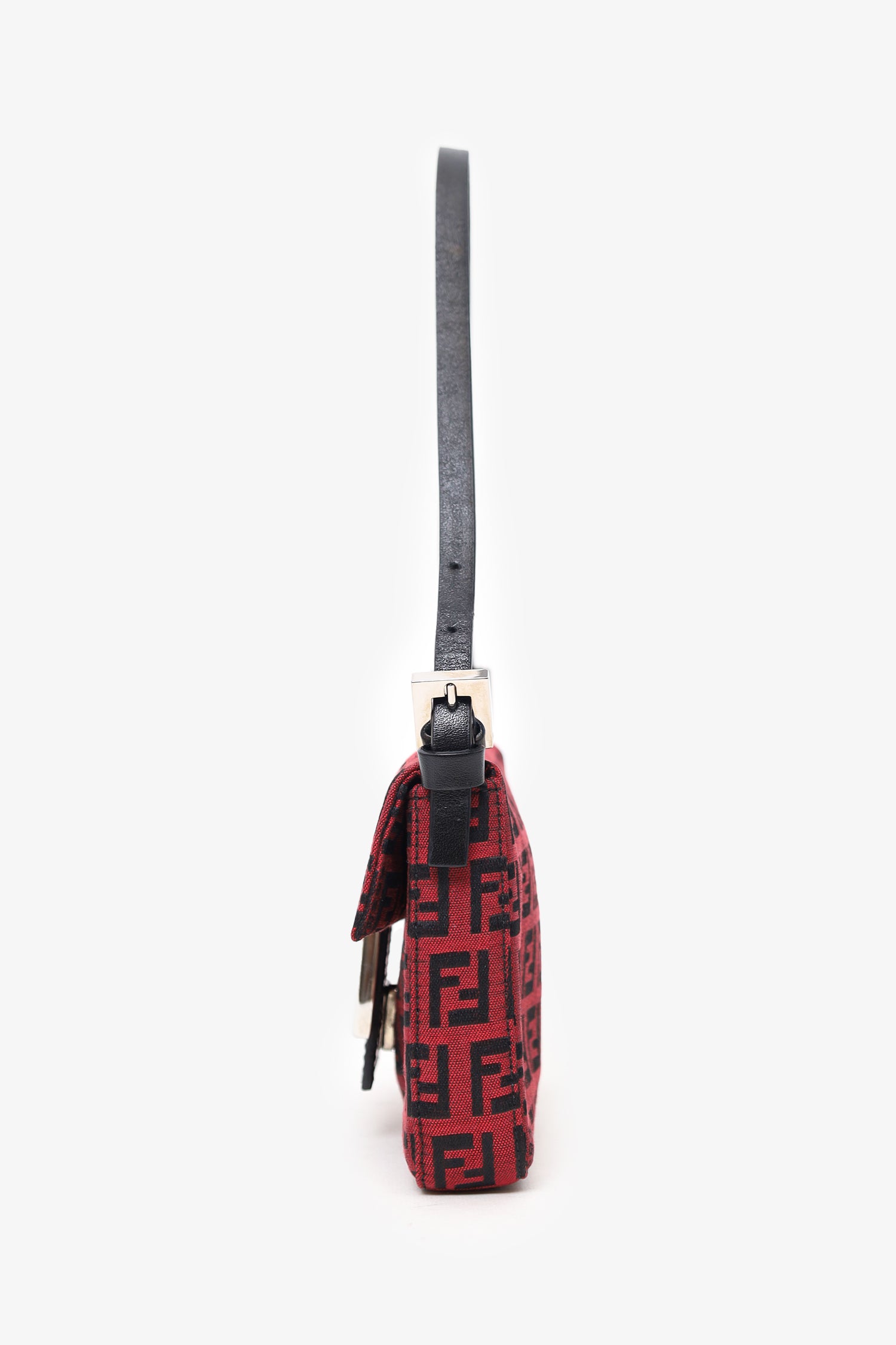 Refresh availabilityFendi Black/Red Canvas Zucchino Baguette Shoulder Bag. Front fold-over flap with magnetic snap-button closure. Adjustable shoulder strap with buckle closure. Lined interior. Single interior slip pocket. Silver-tone hardware. Tonal stitching.
