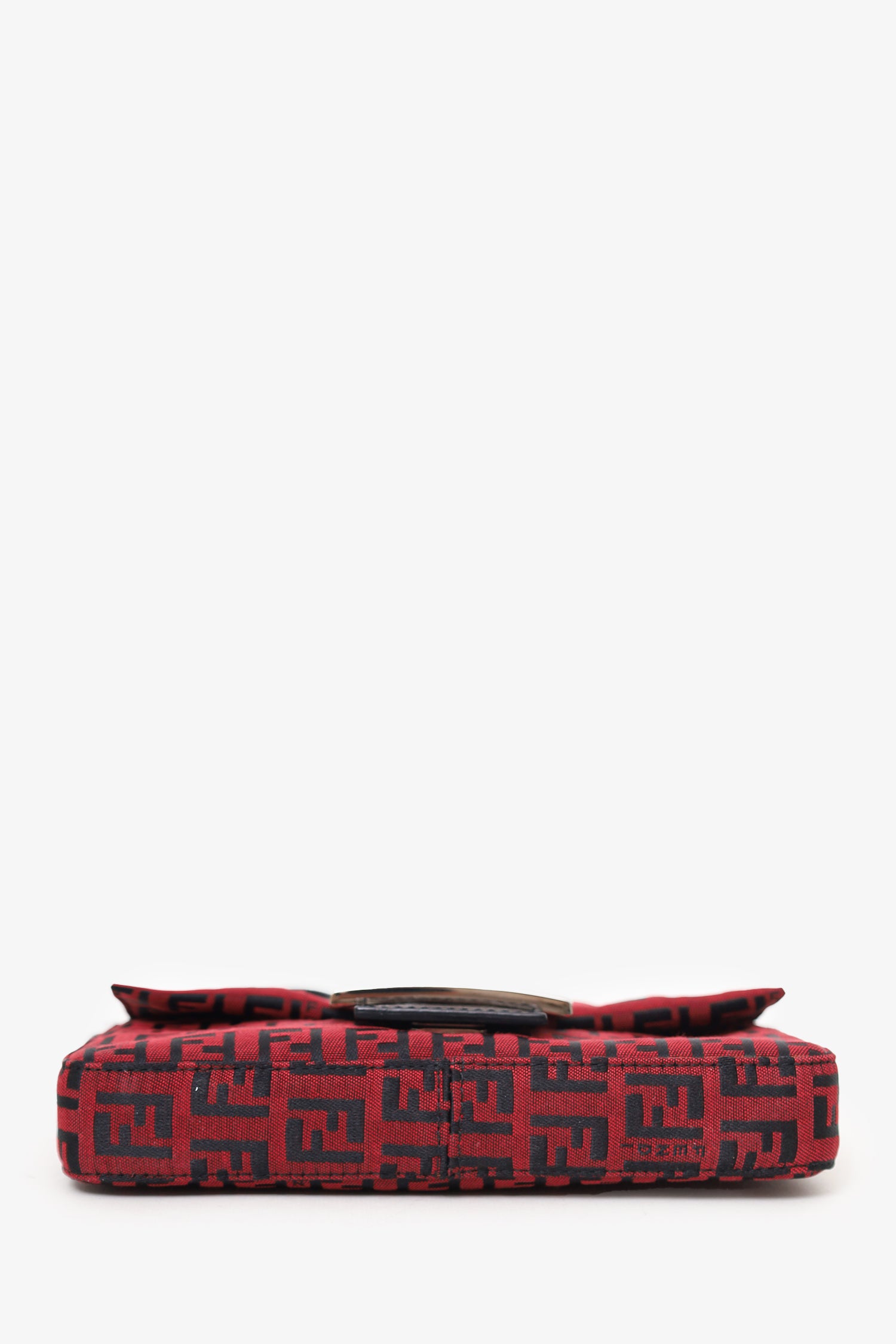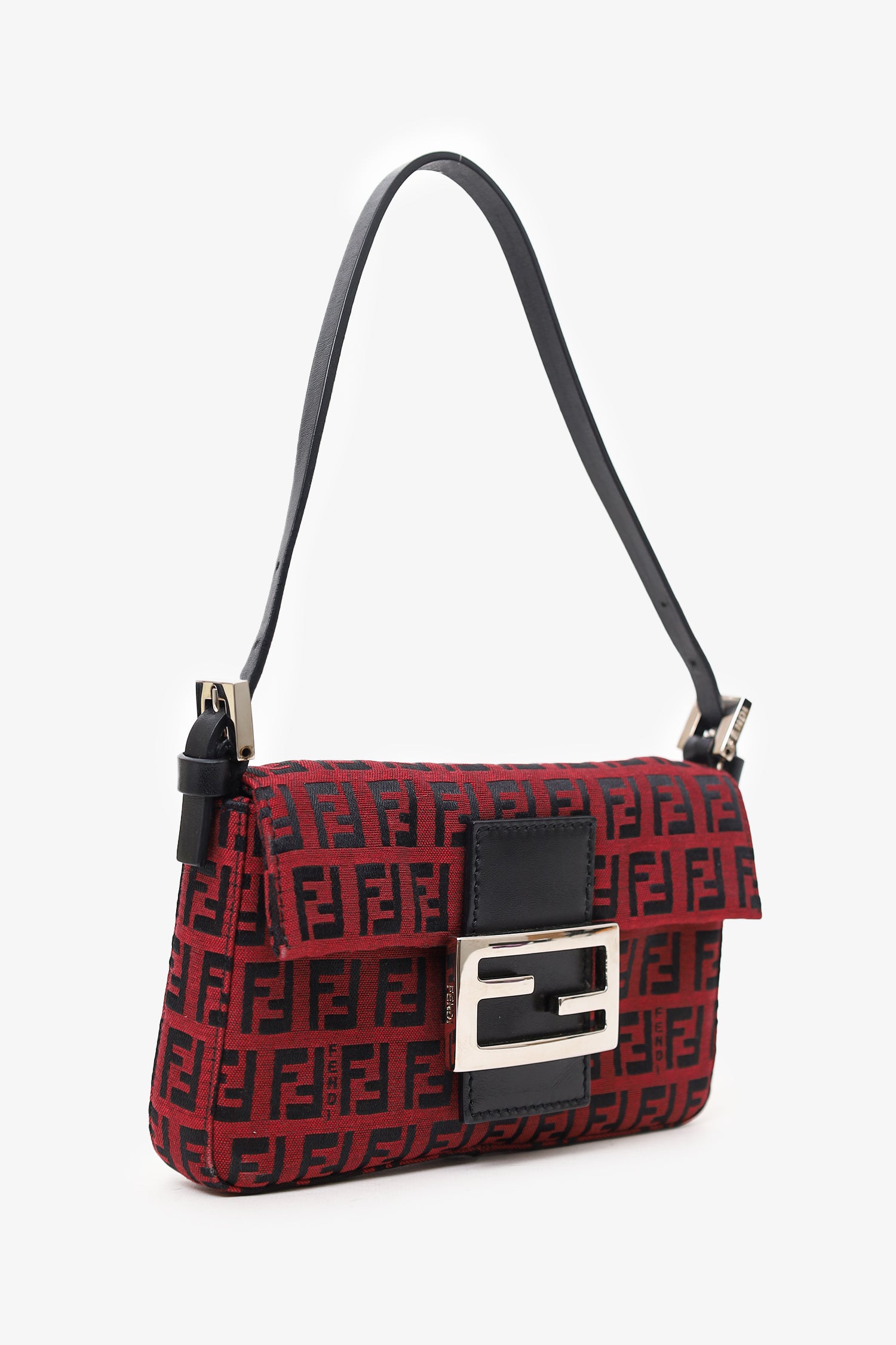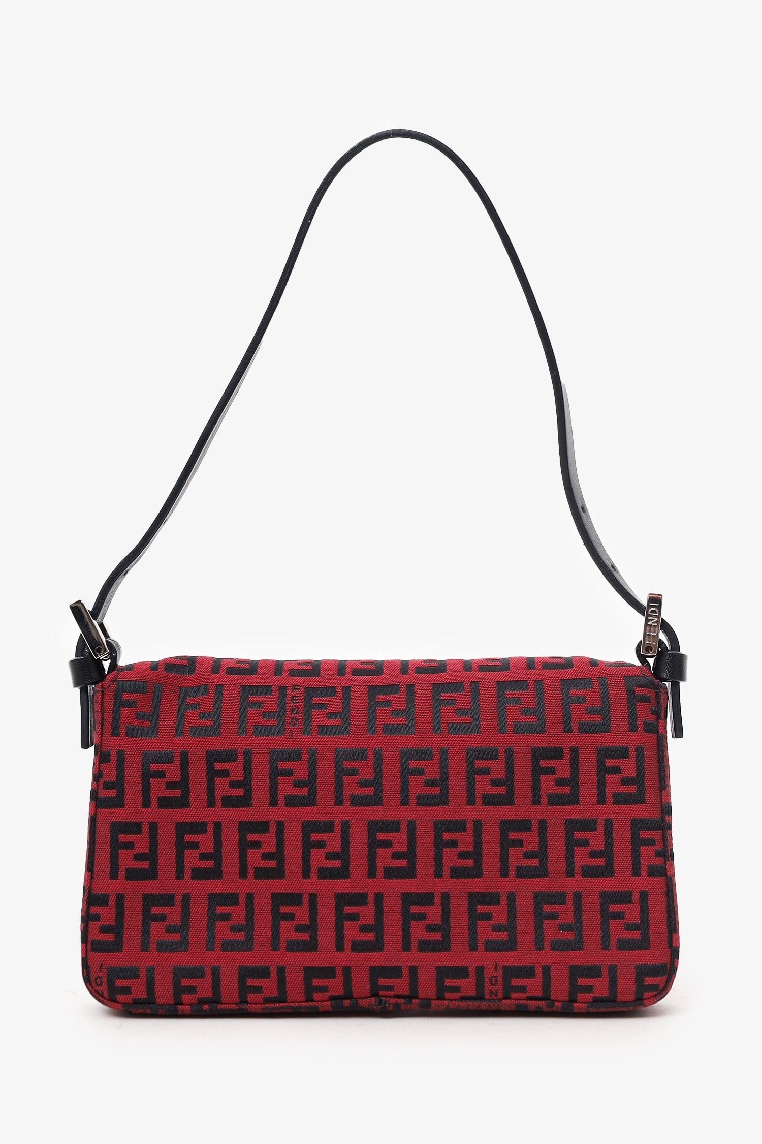Refresh availabilityFendi Black/Red Canvas Zucchino Baguette Shoulder Bag. Front fold-over flap with magnetic snap-button closure. Adjustable shoulder strap with buckle closure. Lined interior. Single interior slip pocket. Silver-tone hardware. Tonal stitching.