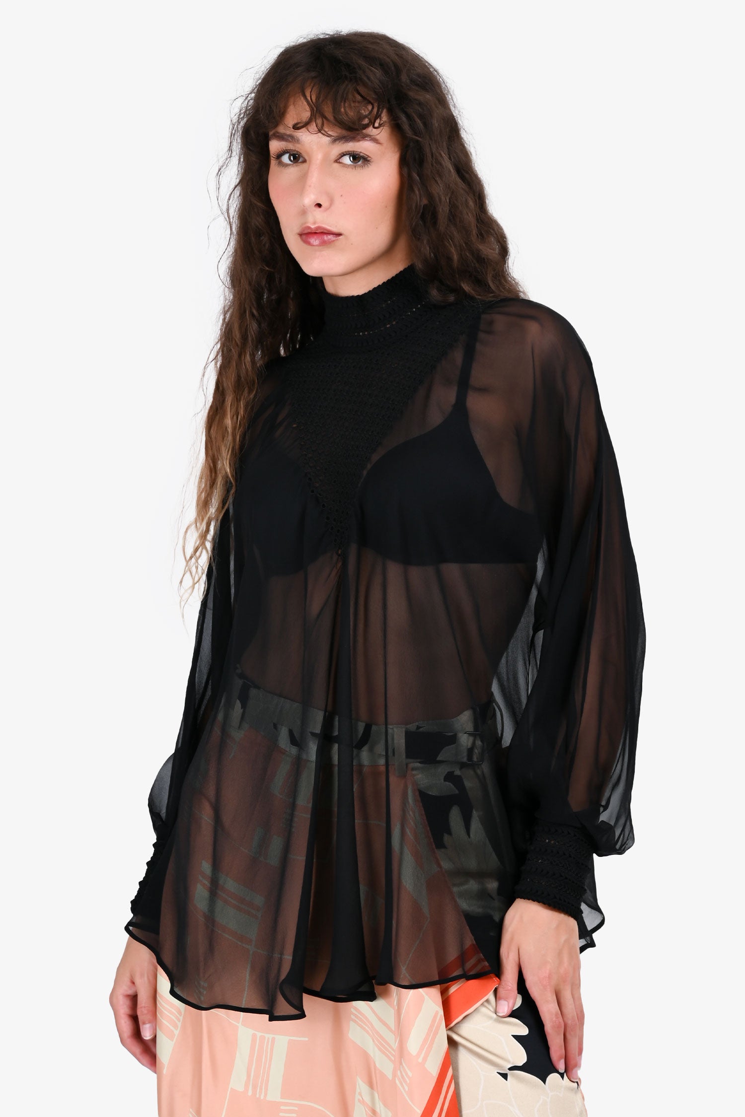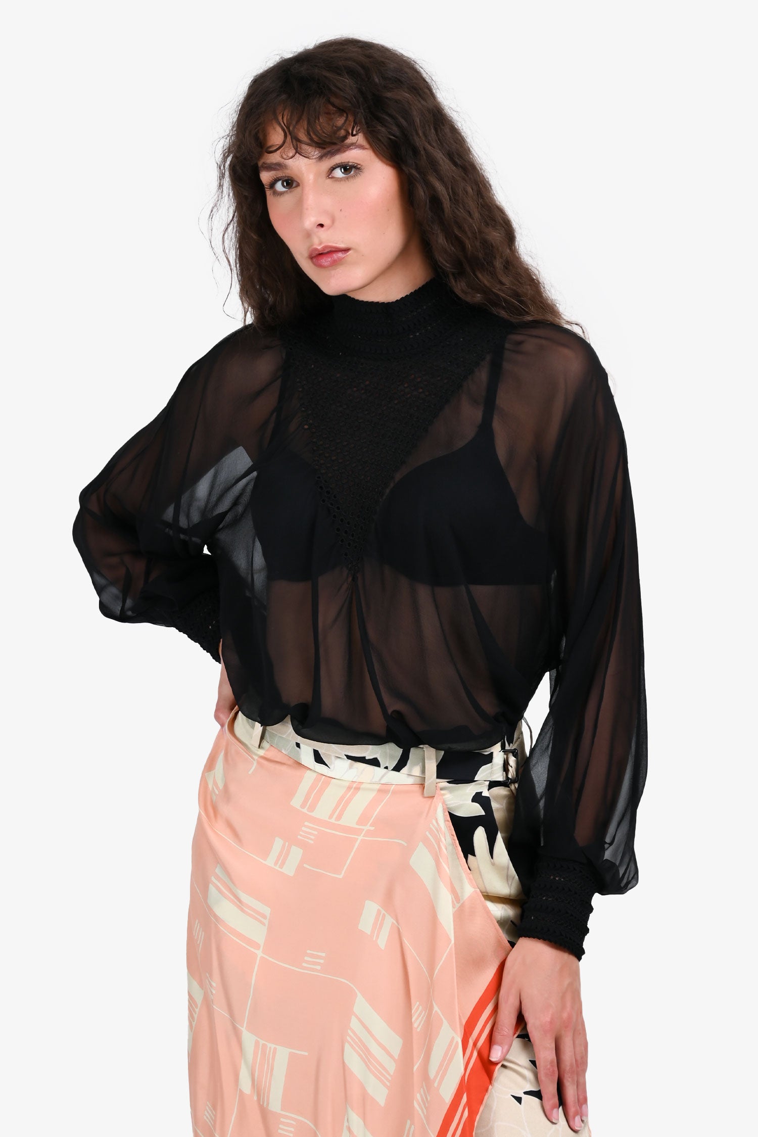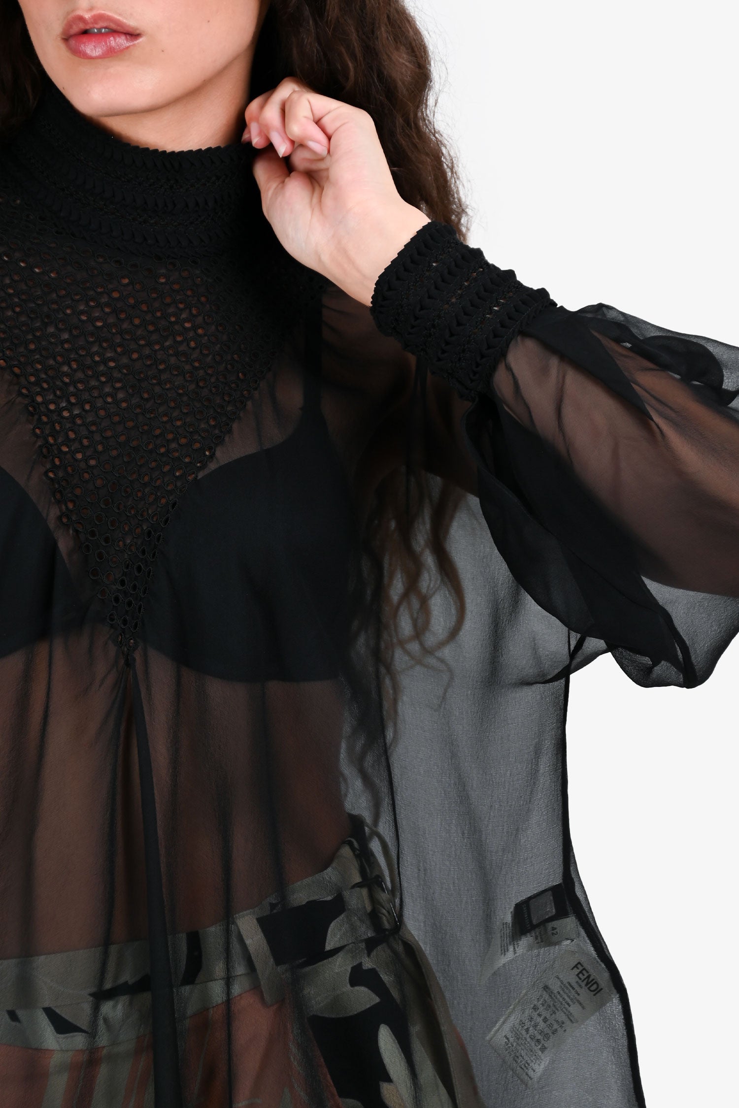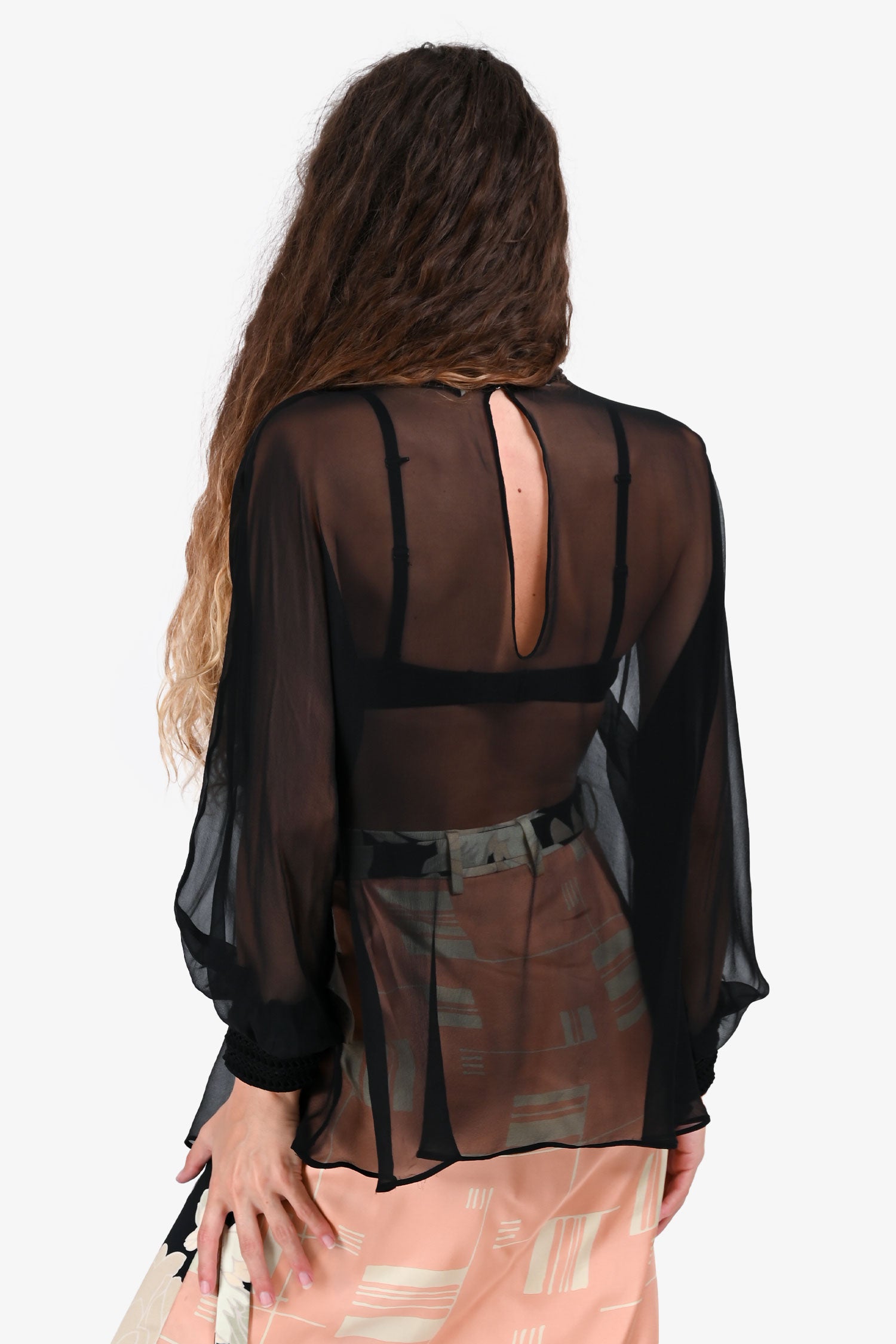 Refresh availabilityFendi Black Silk Sheer Blouse. Classic pointed collar. Button front closure. Long sleeves. Back neck button closure. Tonal stitching.