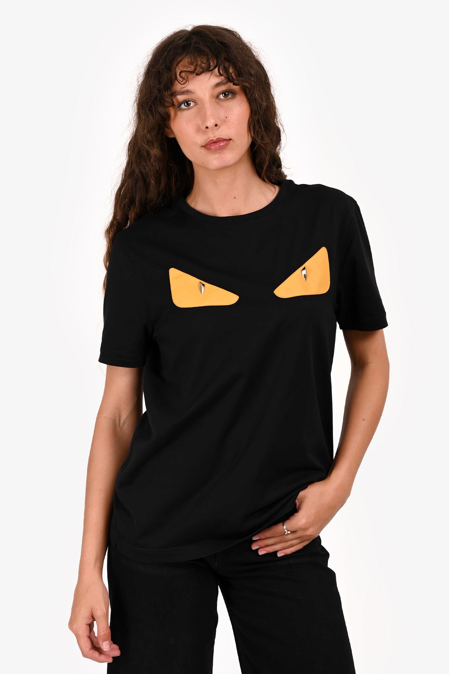 Refresh availabilityFendi Black/Yellow Leather Monster T-Shirt. Crew neckline. Short sleeves. Tonal stitching.