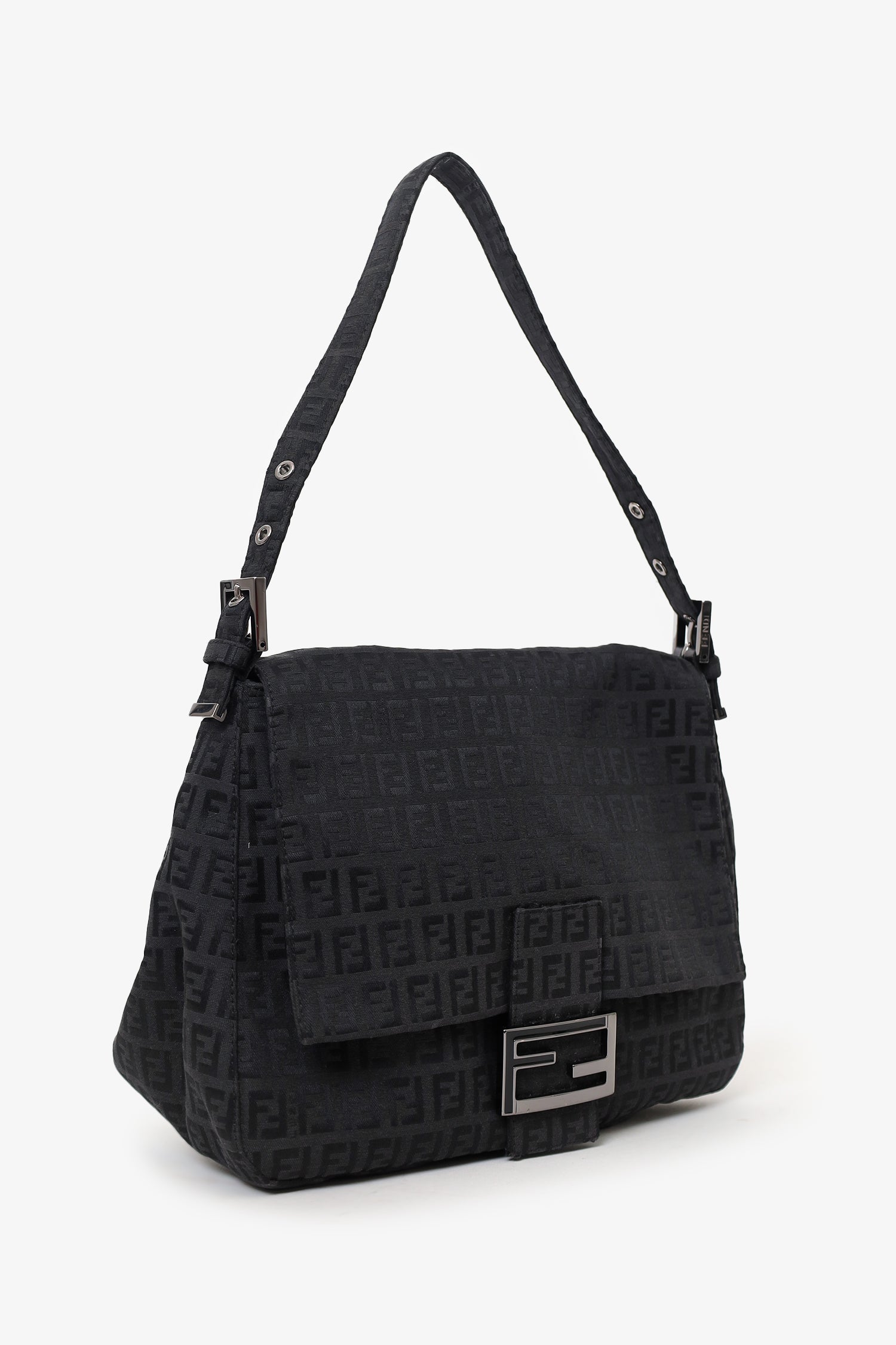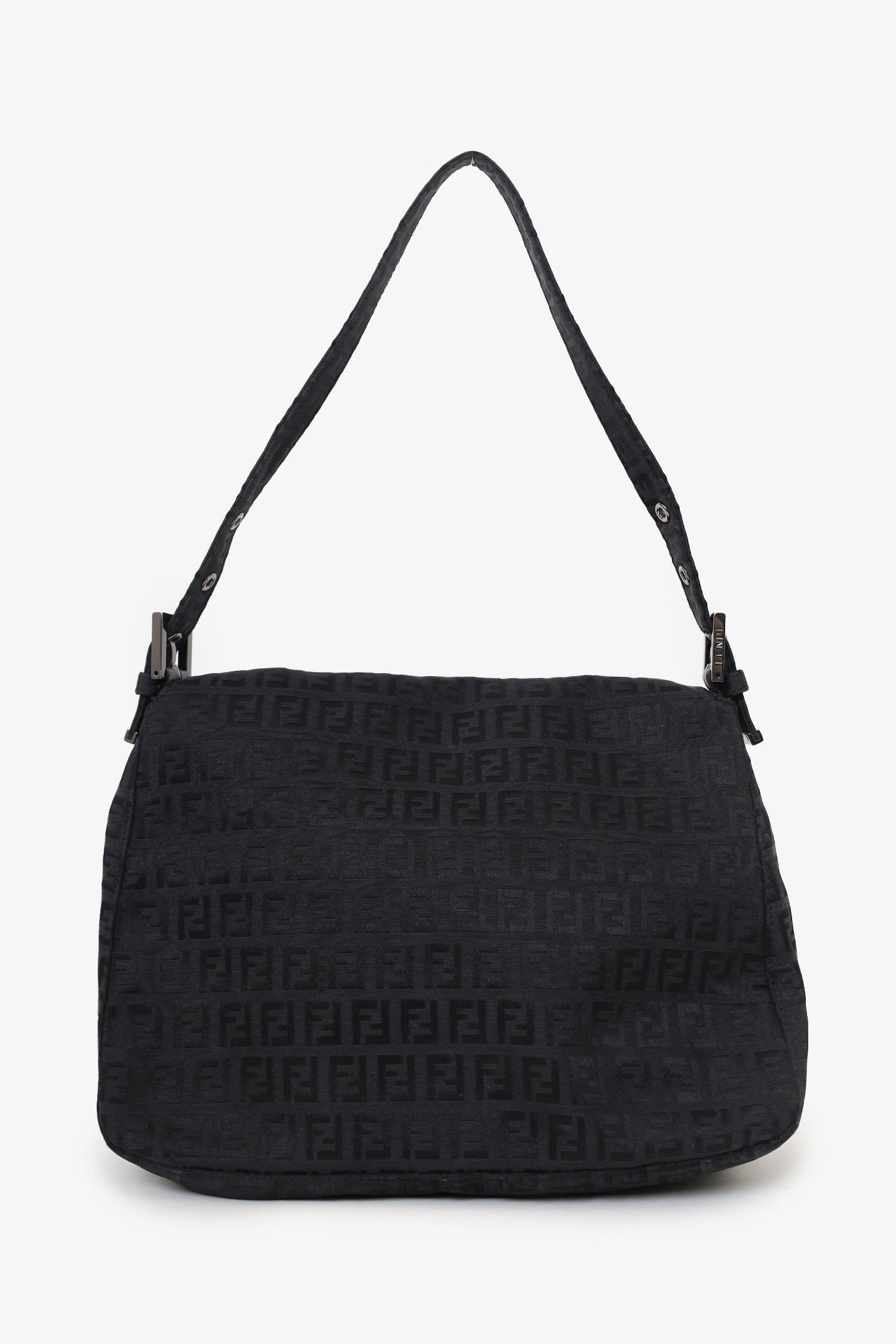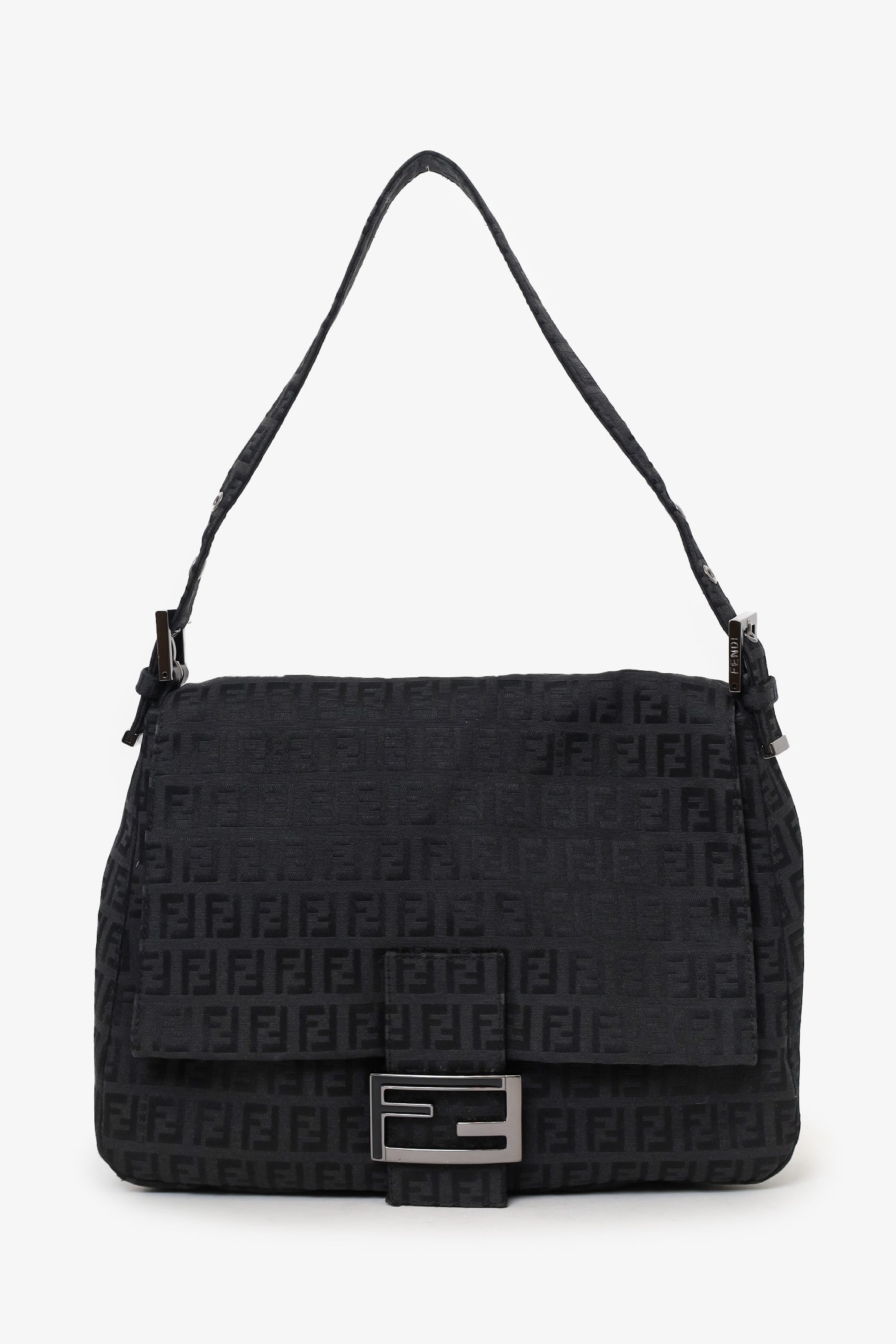 Refresh availabilityFendi Black Zucca Canvas Large Mama Baguette Shoulder Bag. Front fold-over flap with magnetic snap-button closure. Shoulder straps with adjustable buckle closure. Single interior zip pocket. Palladium-tone hardware. Tonal stitching.