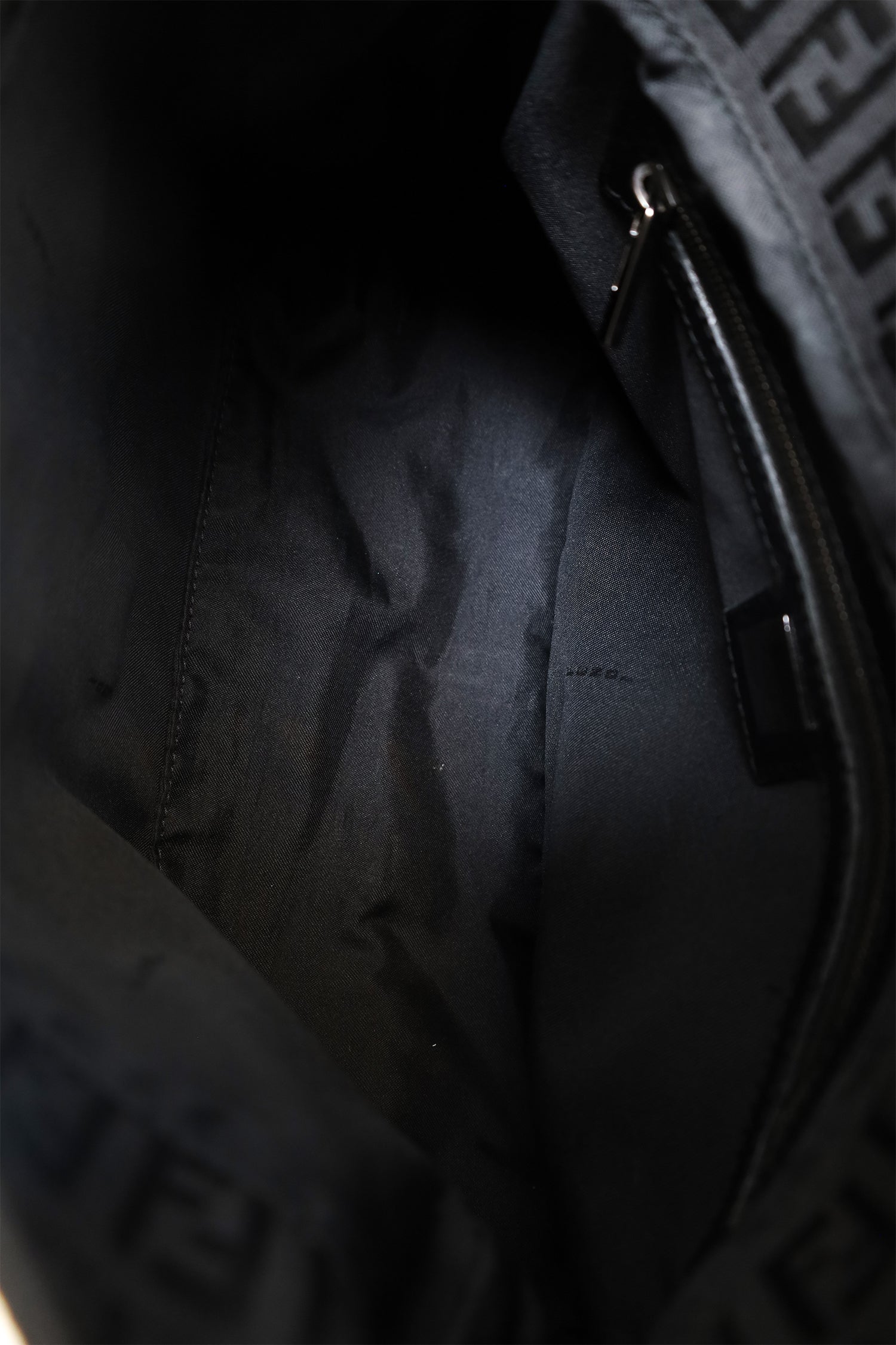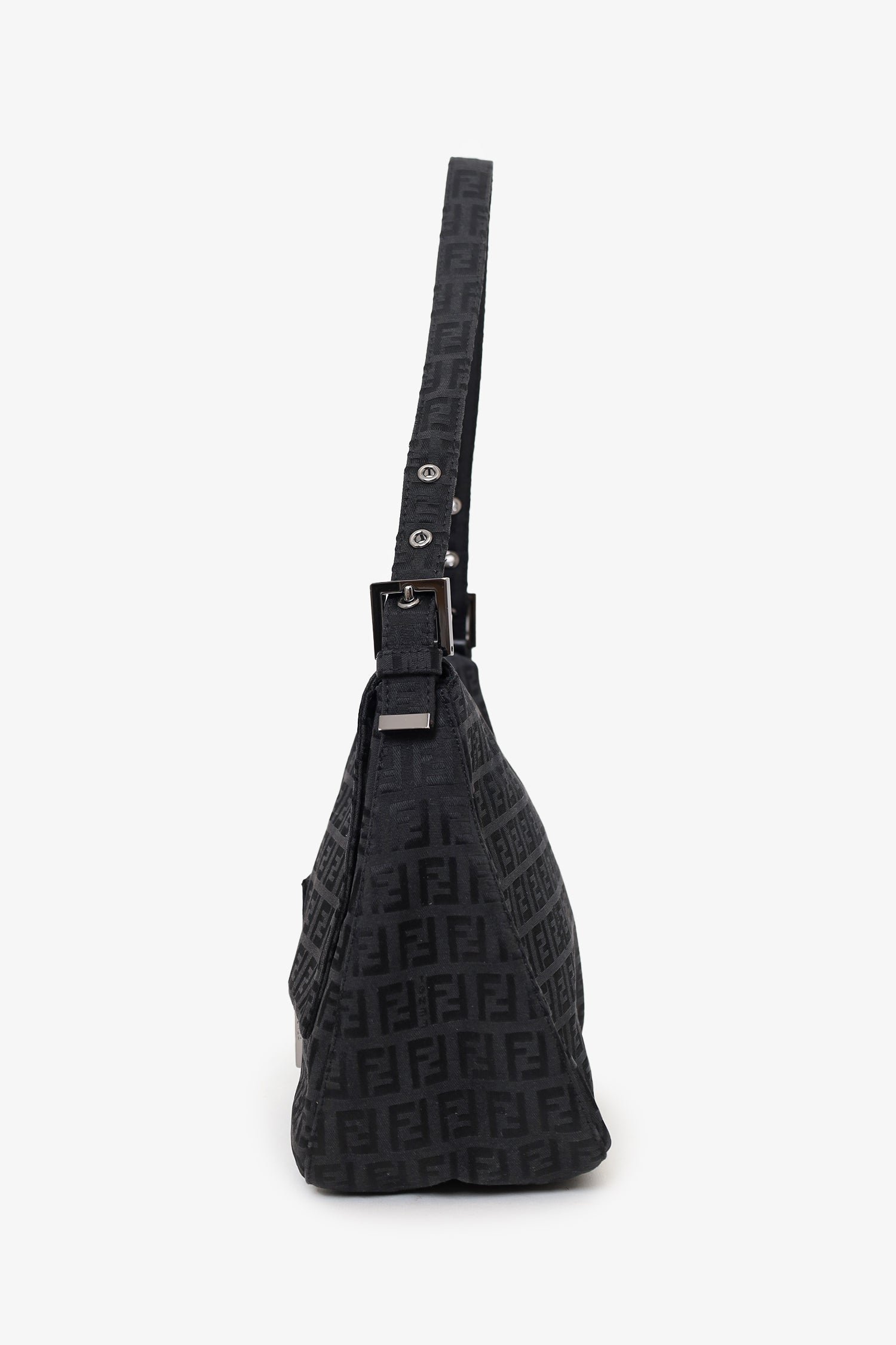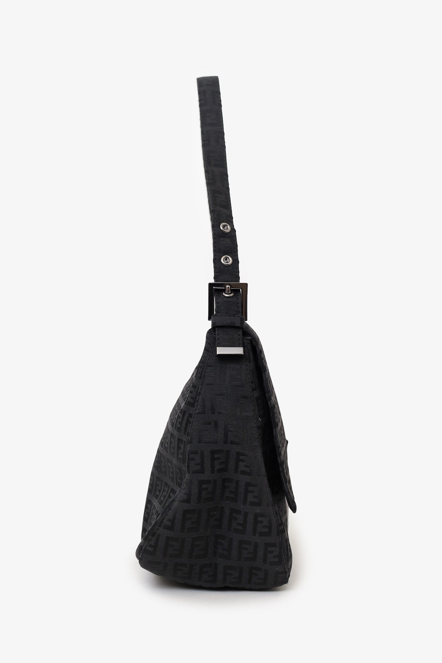 Refresh availabilityFendi Black Zucca Canvas Large Mama Baguette Shoulder Bag. Front fold-over flap with magnetic snap-button closure. Shoulder straps with adjustable buckle closure. Single interior zip pocket. Palladium-tone hardware. Tonal stitching.