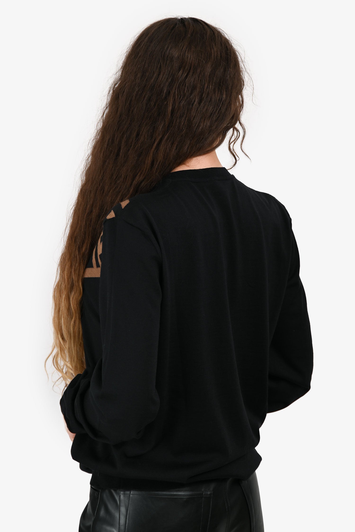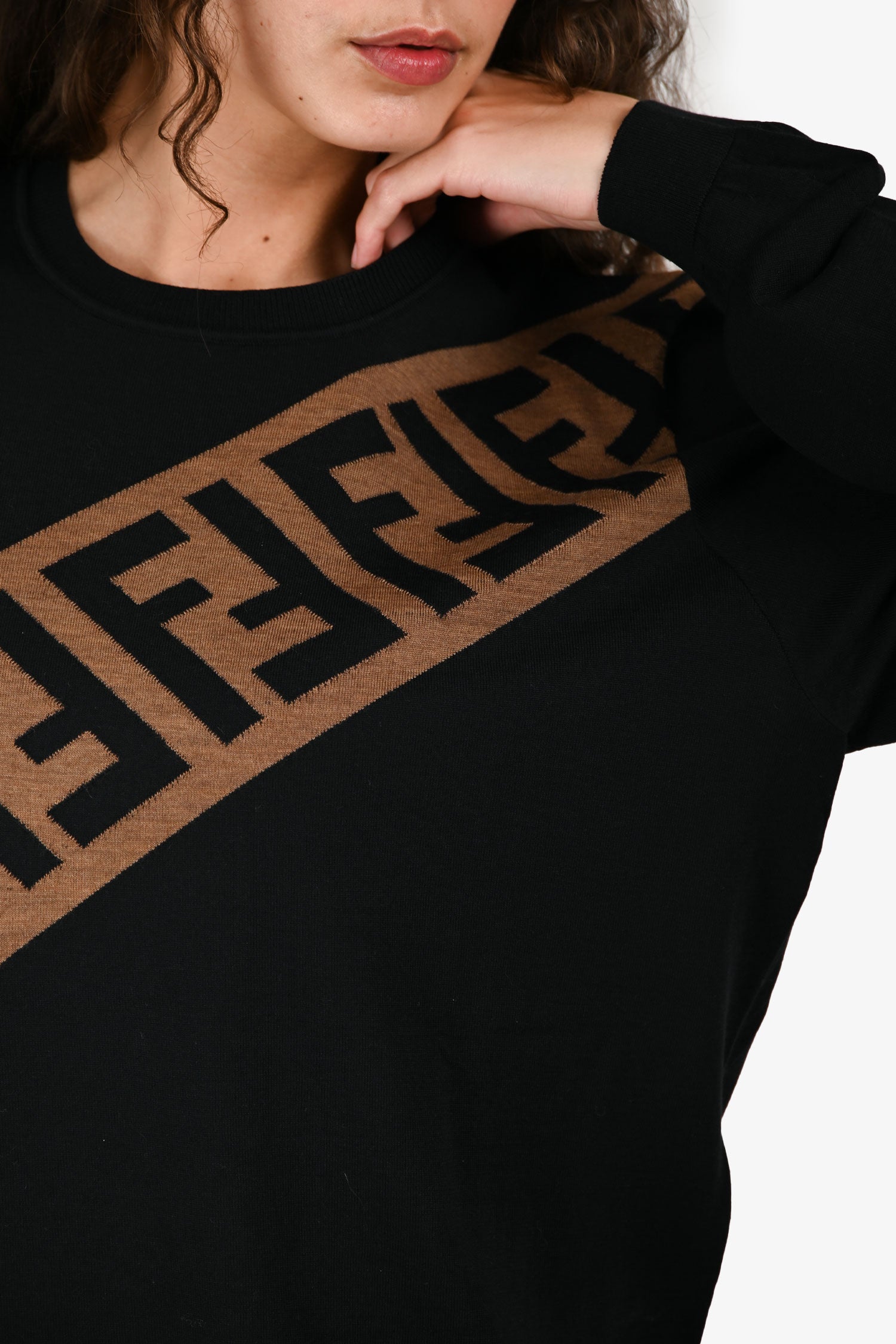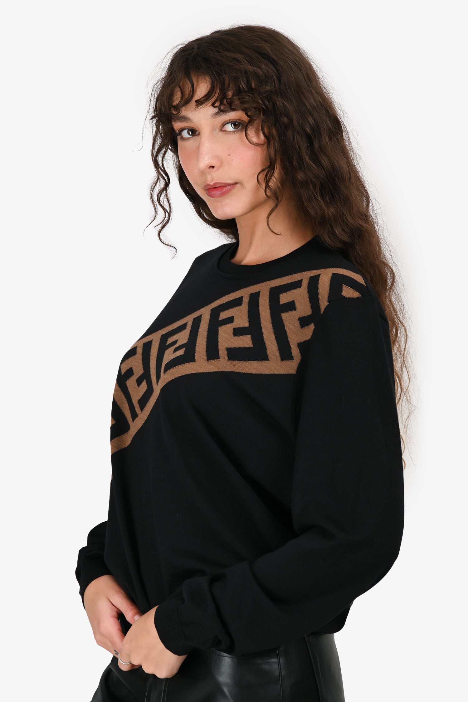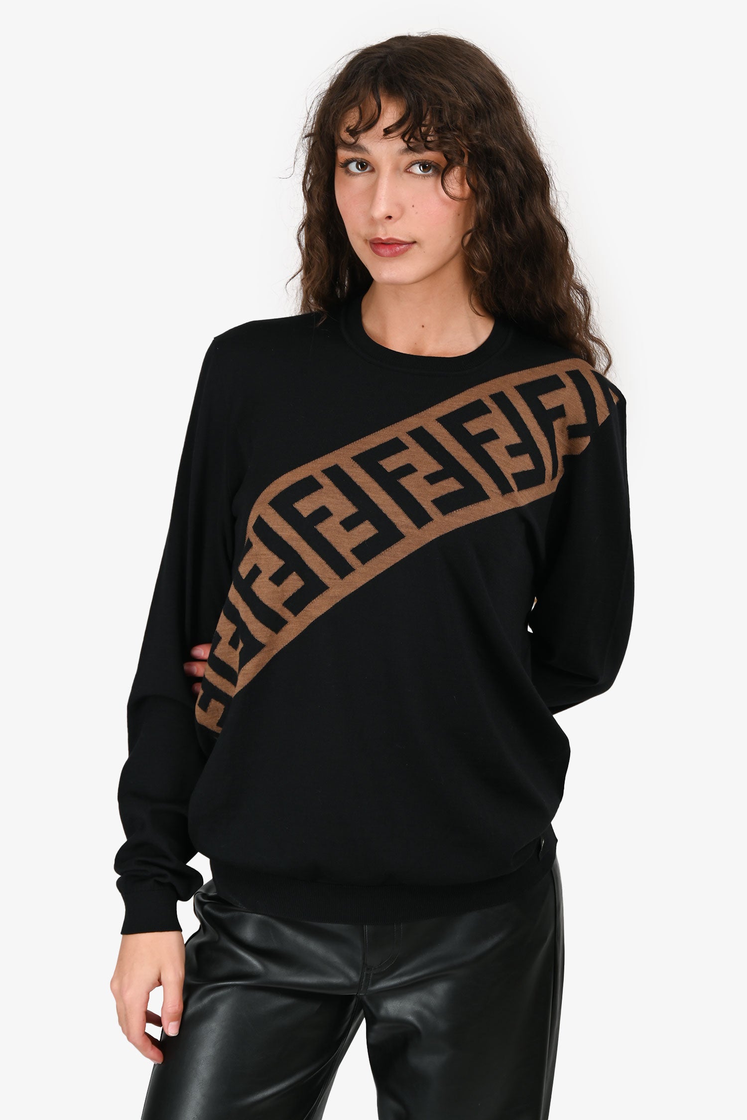 Refresh availabilityFendi Black/Brown Wool Knit FF Stripe Crewneck Sweater. Pull-on. Round neckline. Ribbed neck, cuffs, and hemline. Features small logo detailing on the bottom of the right corner. Tonal stitching.